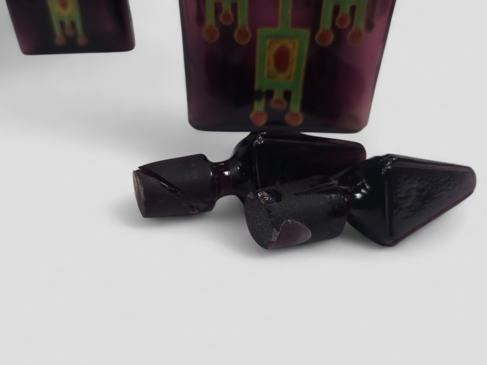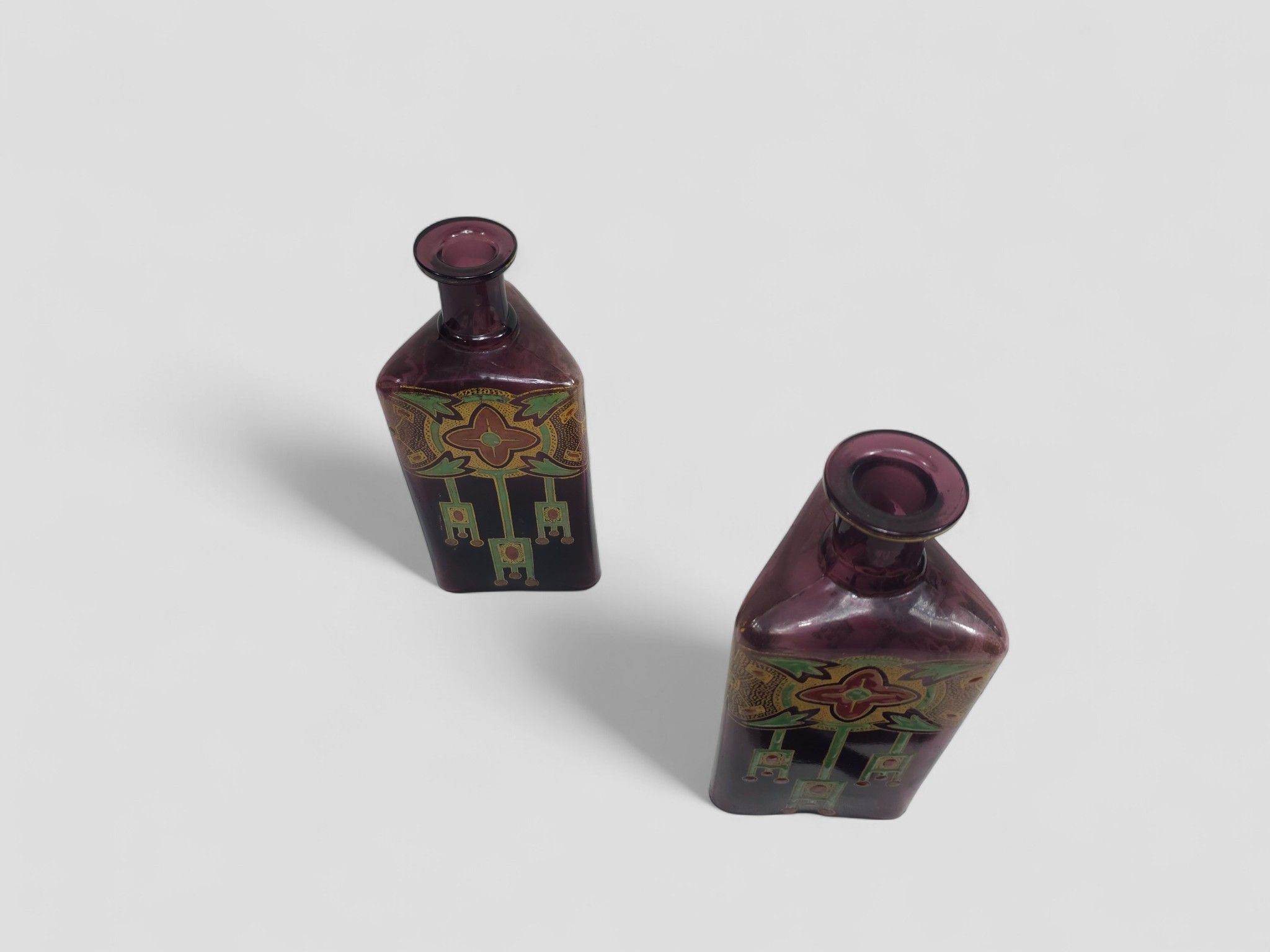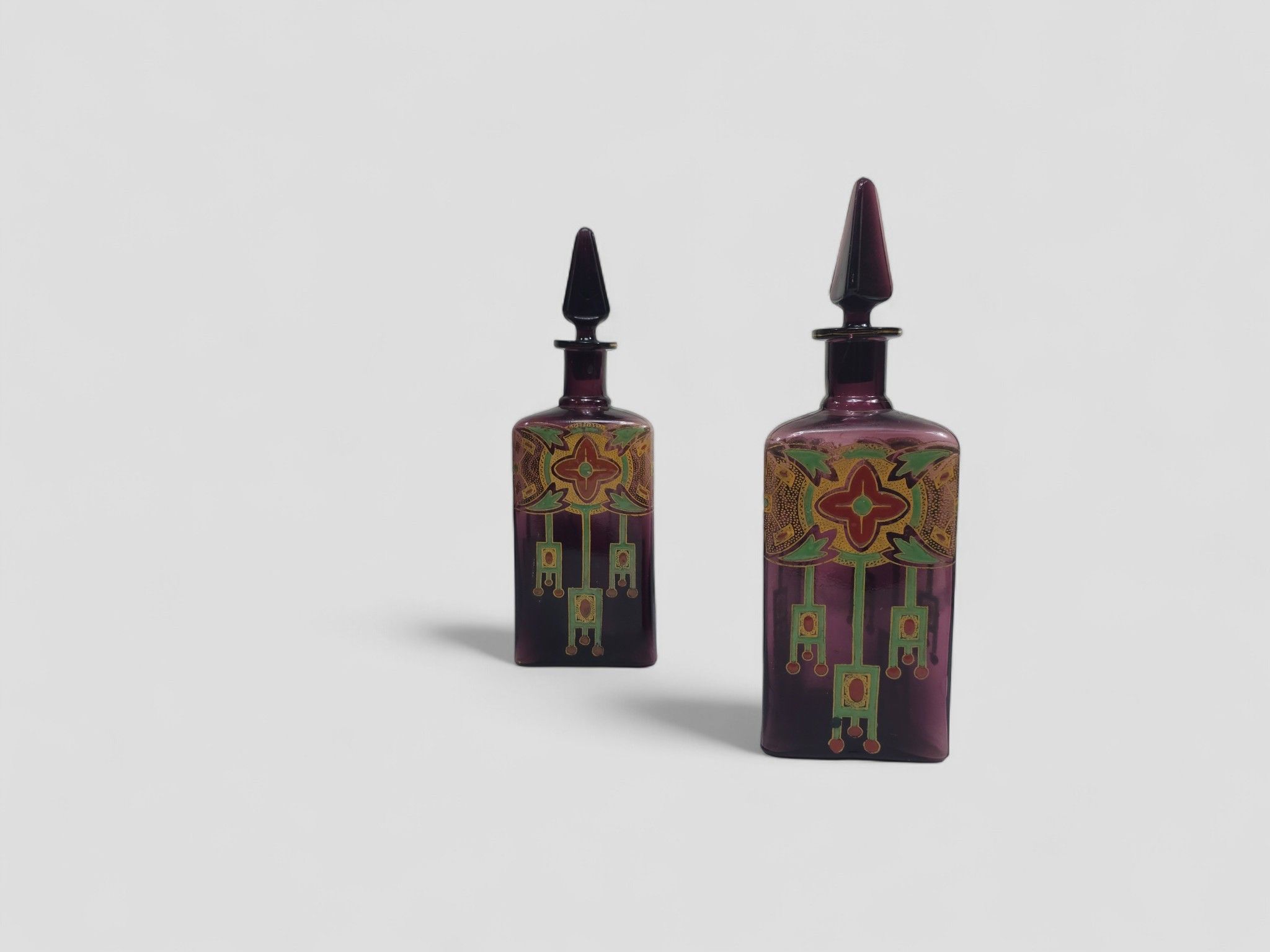 Attributed to François-Théodore LEGRAS (1839-1916). 1 pair of violet glass decanters with enamelled Oriental floral friezes. H: 35 cm (Accidents)