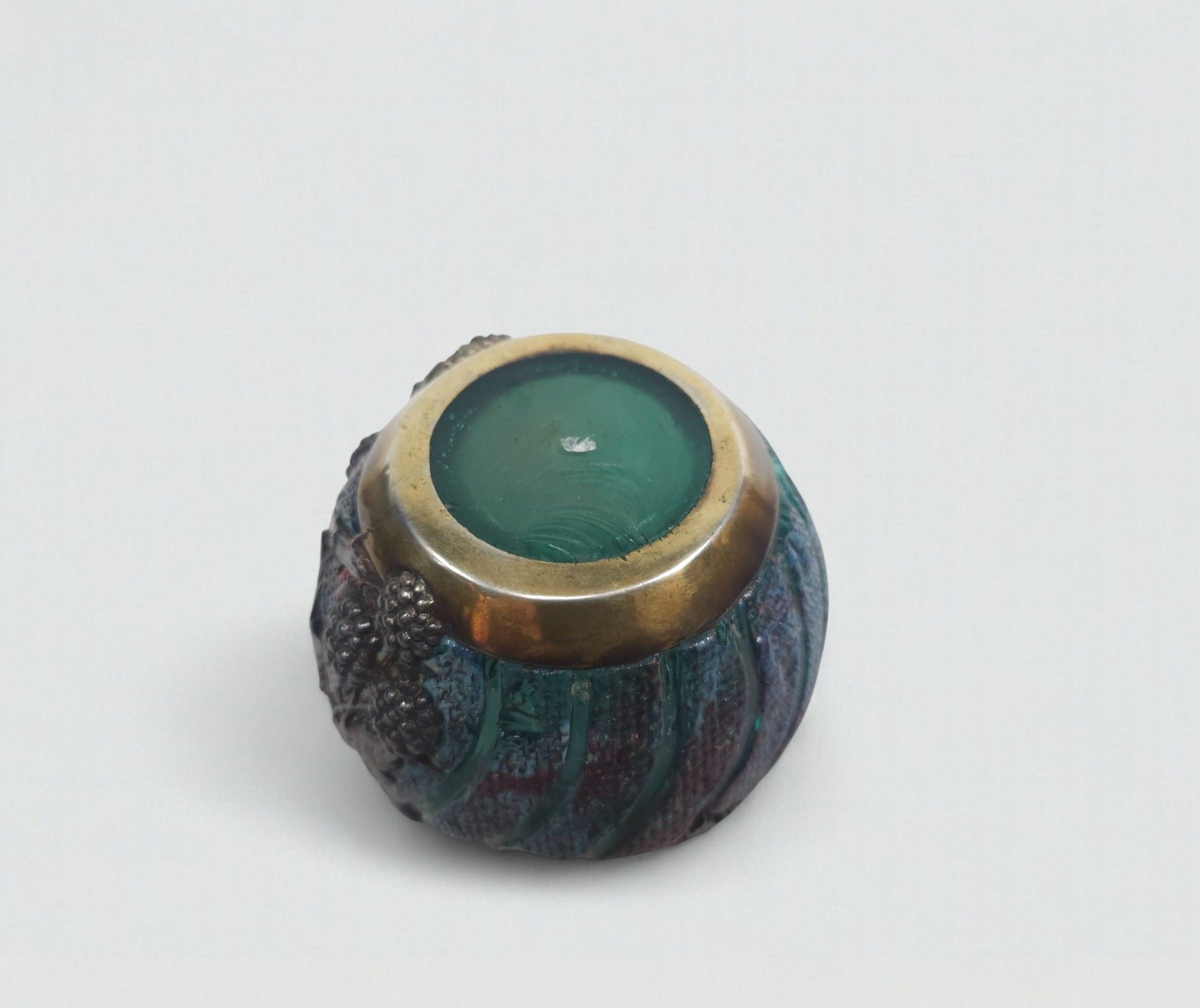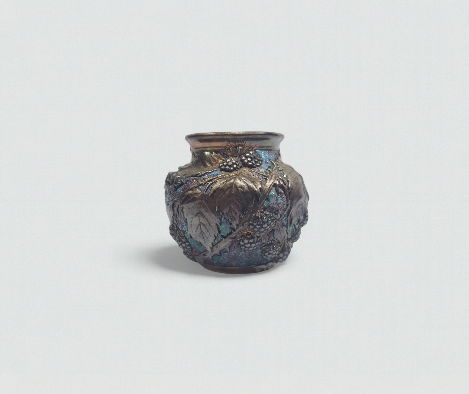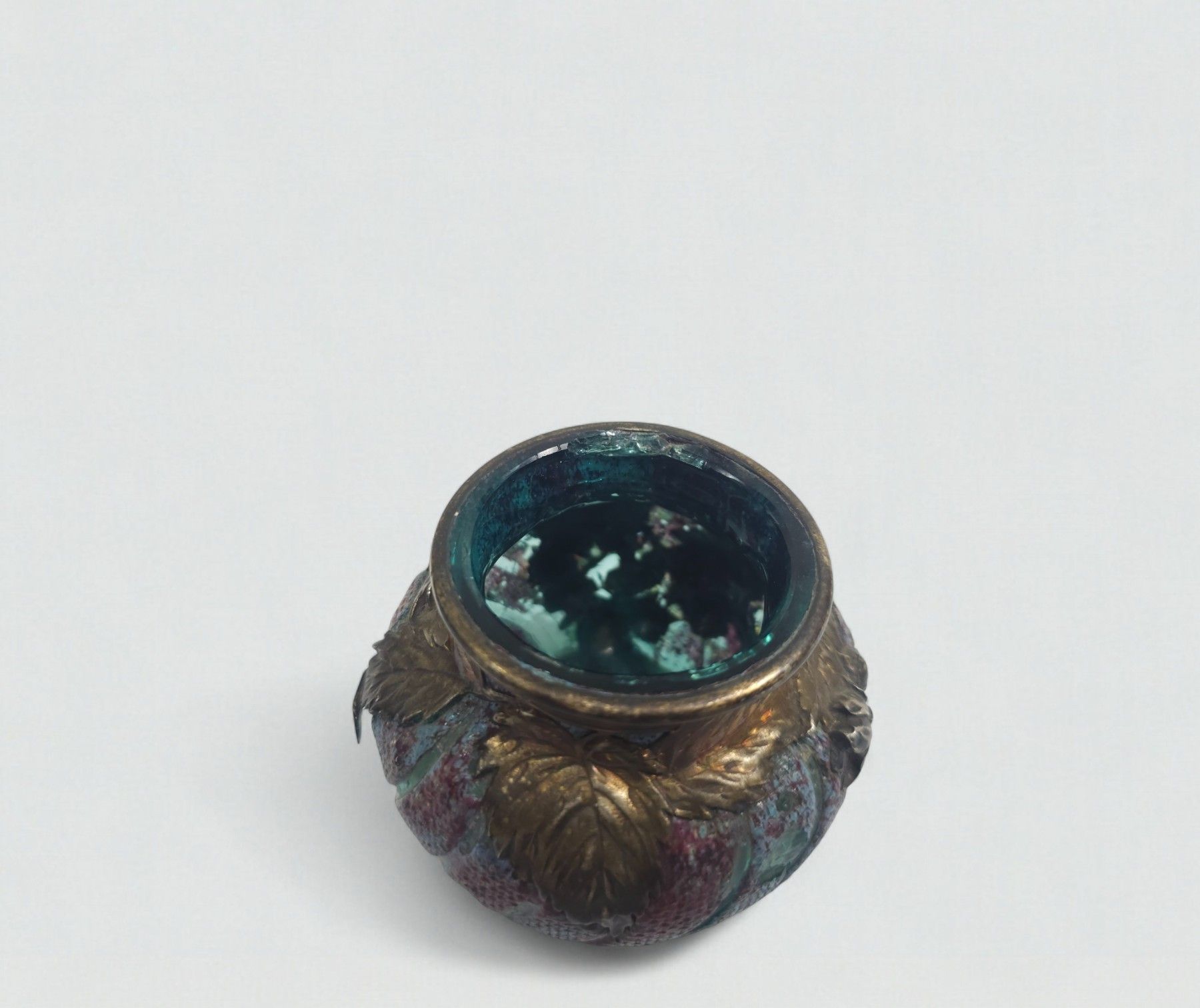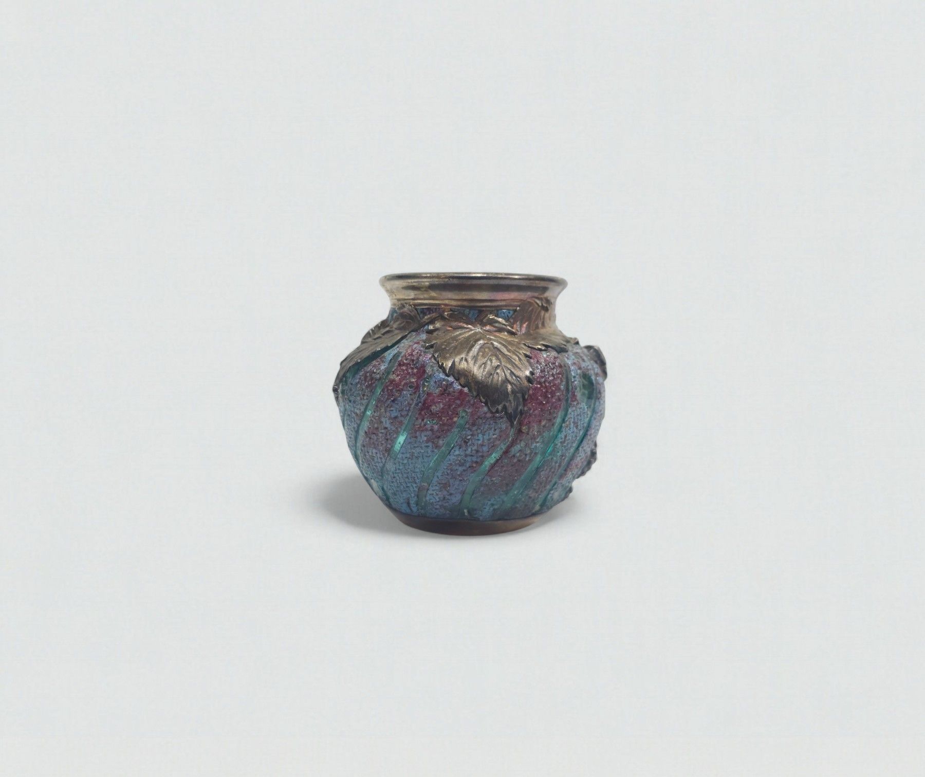 Maurice GUERCHET. Small blue and violet glass vase. Silver inlay by the master goldsmith. Circa 1900. H: 8.5 D: 10 cm (Numerous damages and missing pieces) *Maurice Guerchet worked with Emile Gallé around 1890.