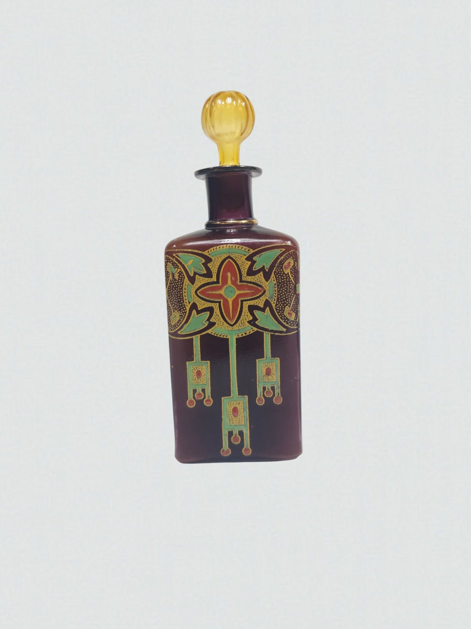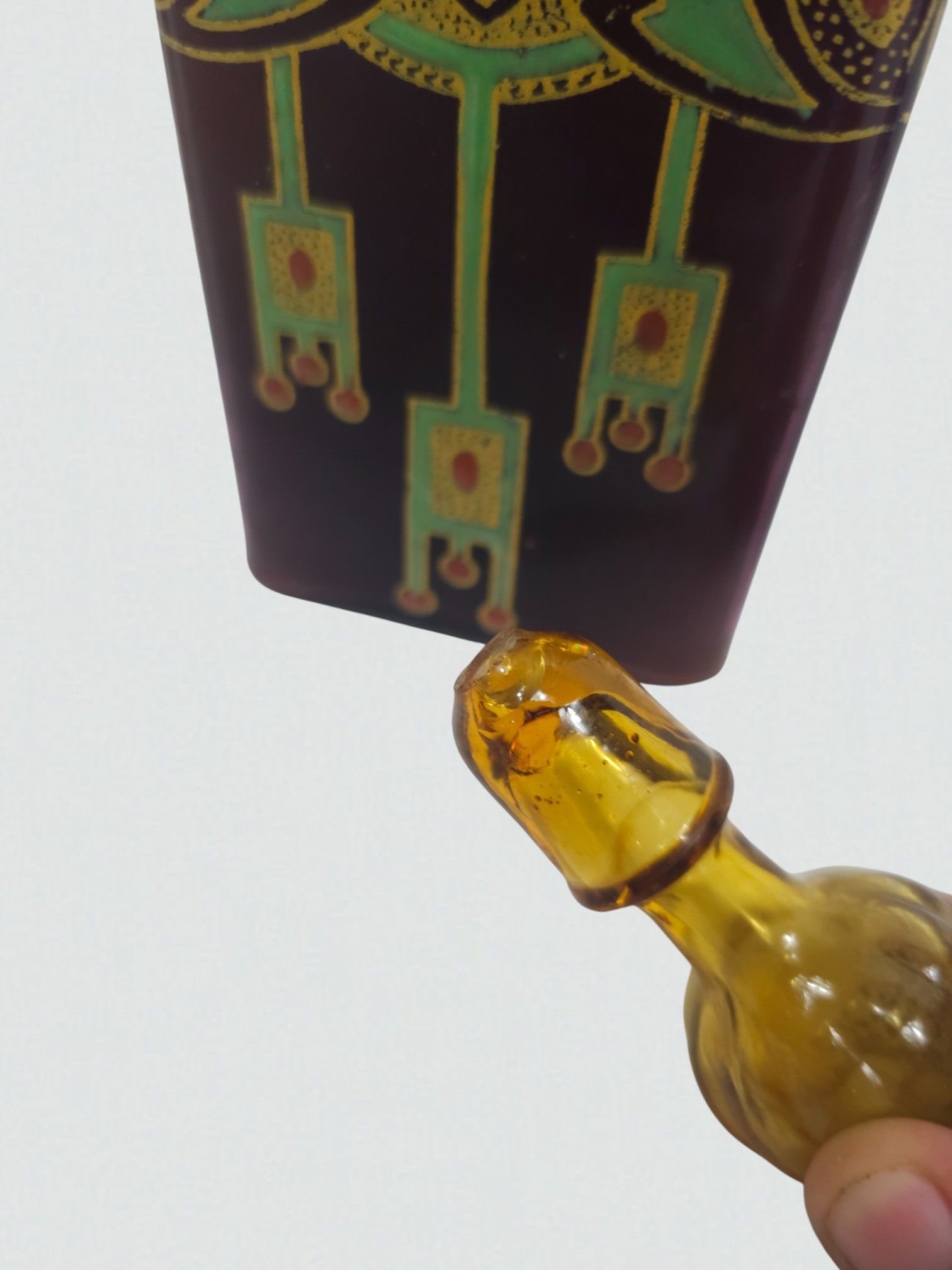 Attributed to François-Théodore LEGRAS (1839-1916). 1 violet glass decanter with enamelled decoration of floral friezes in the Oriental style. (Stopper removed & damaged). Height: 25 cm.