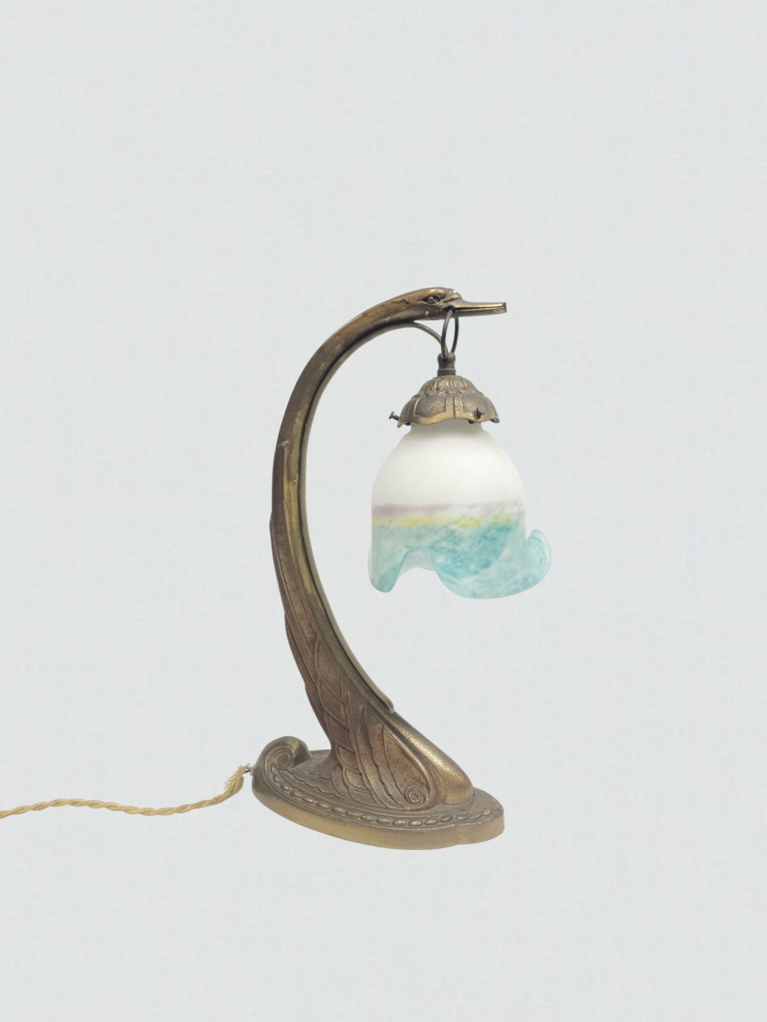 CHARLES RANC (XIX - Xxème siècle) Gilt bronze lamp decorated with a swan. Circa 1900 - 1920. Tulip added in blue marbled glass in the Muller style. H : 37 L : 20 cm (Electricity to be revised)