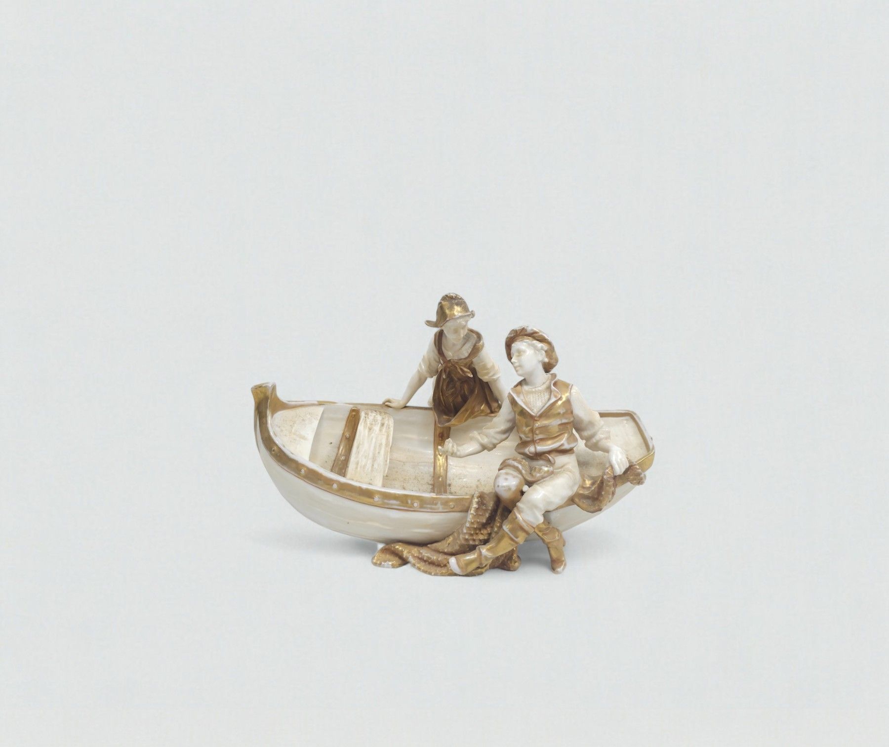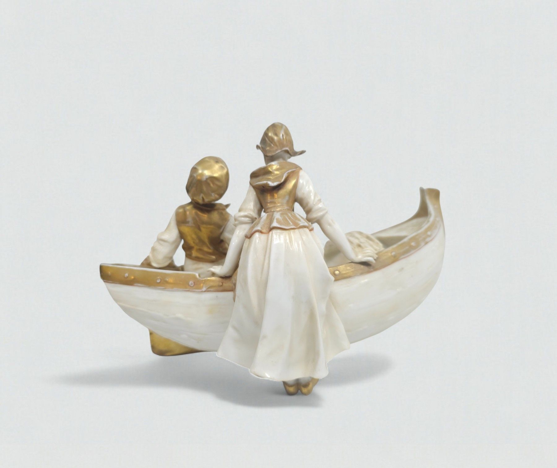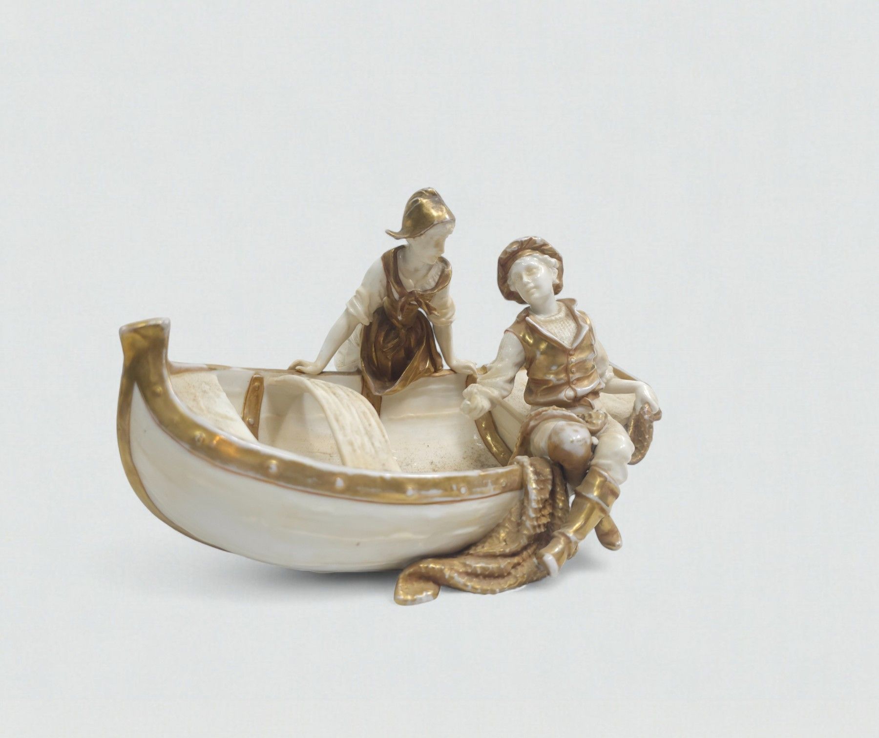 NAPLES - CAPODIMONTE 19TH CENTURY. A pretty white and gilt porcelain "couple in a boat" group. H: 17 W: 28 D: 19 cm (Wear)