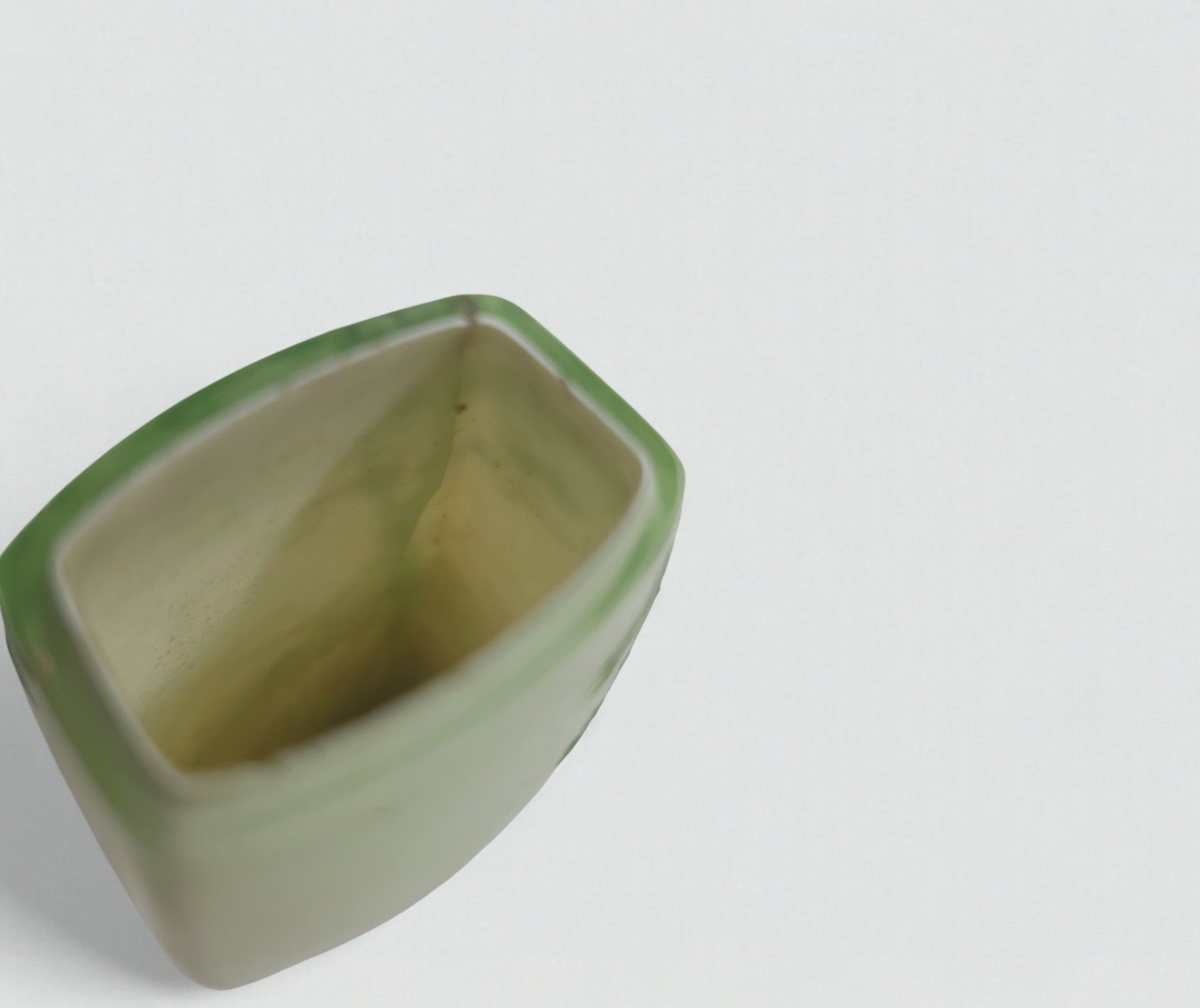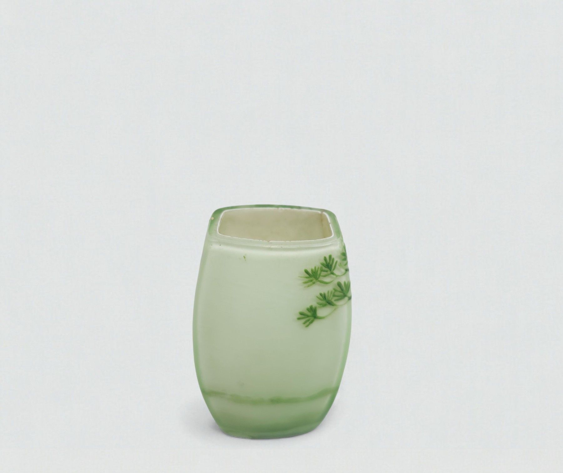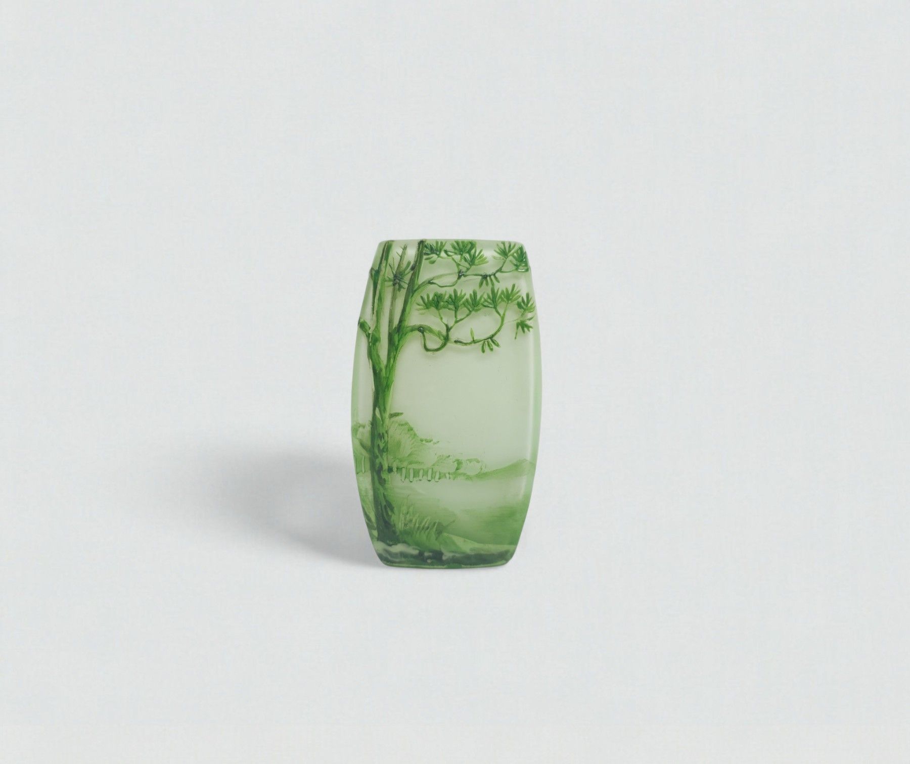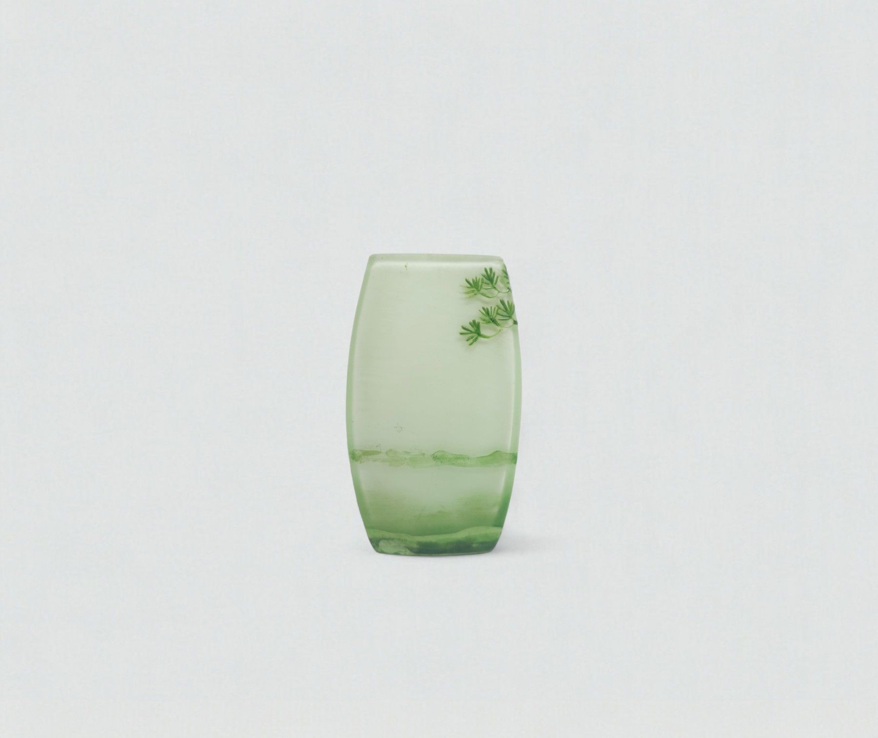 Attributed to Charles VESSIERE (1866-1941) - Nancy. Small green glass vase with multi-layered decoration of a tree in the foreground. H: 8 W: 4 D: 2.5 m. (Slight chips; hair, accidents)