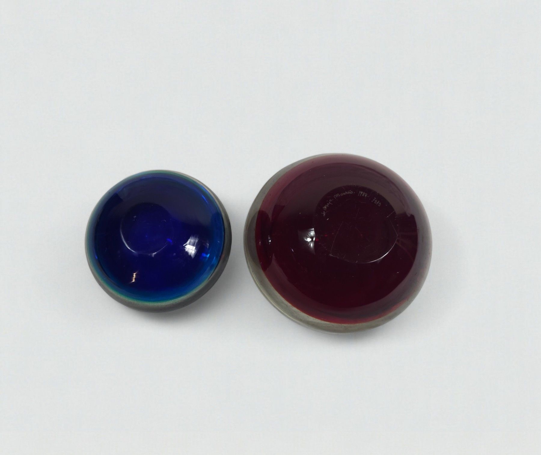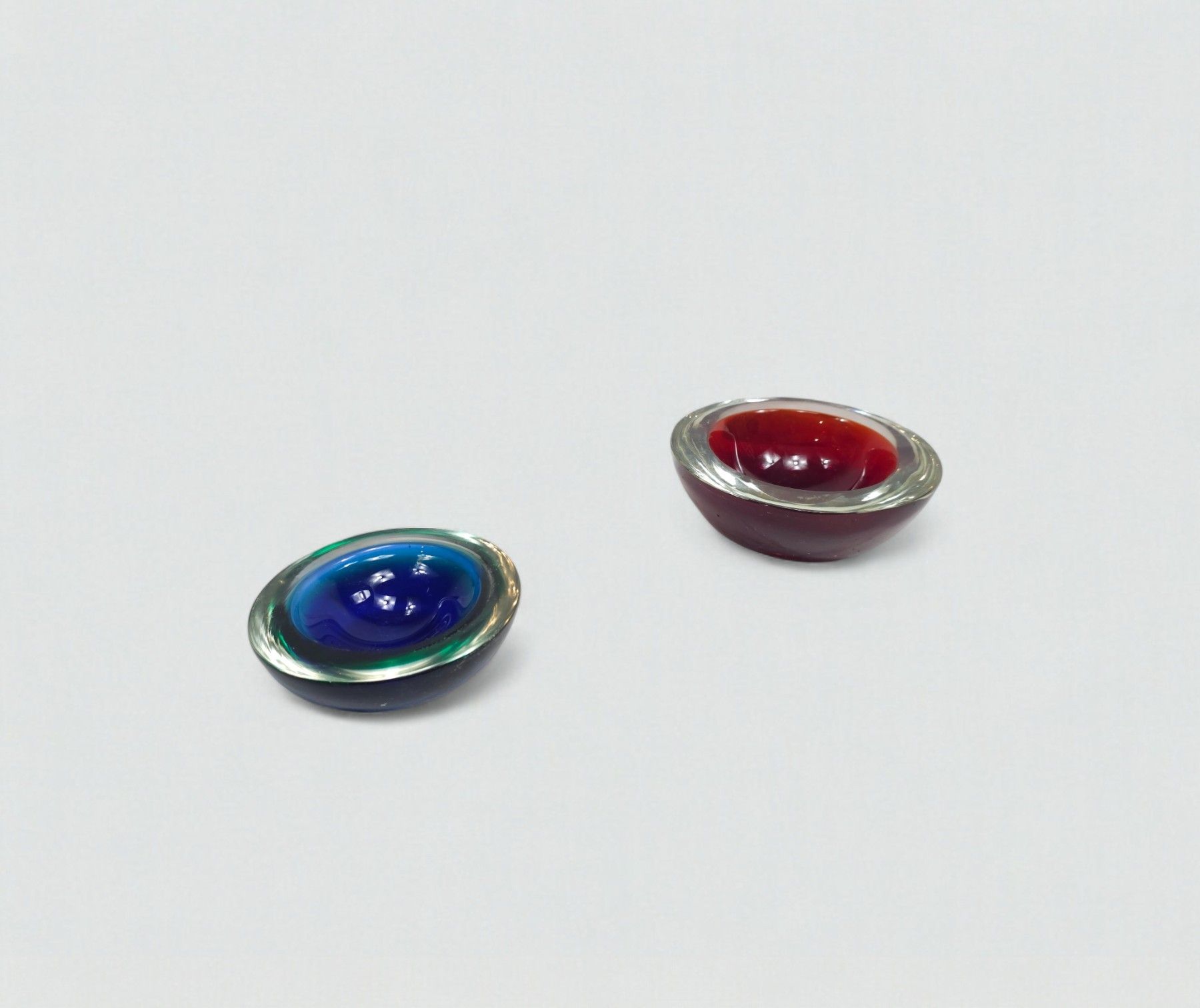 DE MAJO, MURANO. A suite of 2 moulded glass pouches, one in shades of blue and green, the second in red, dated 1988. H: 5 - 6.5 D: 13 - 17 cm (Slight scratches)