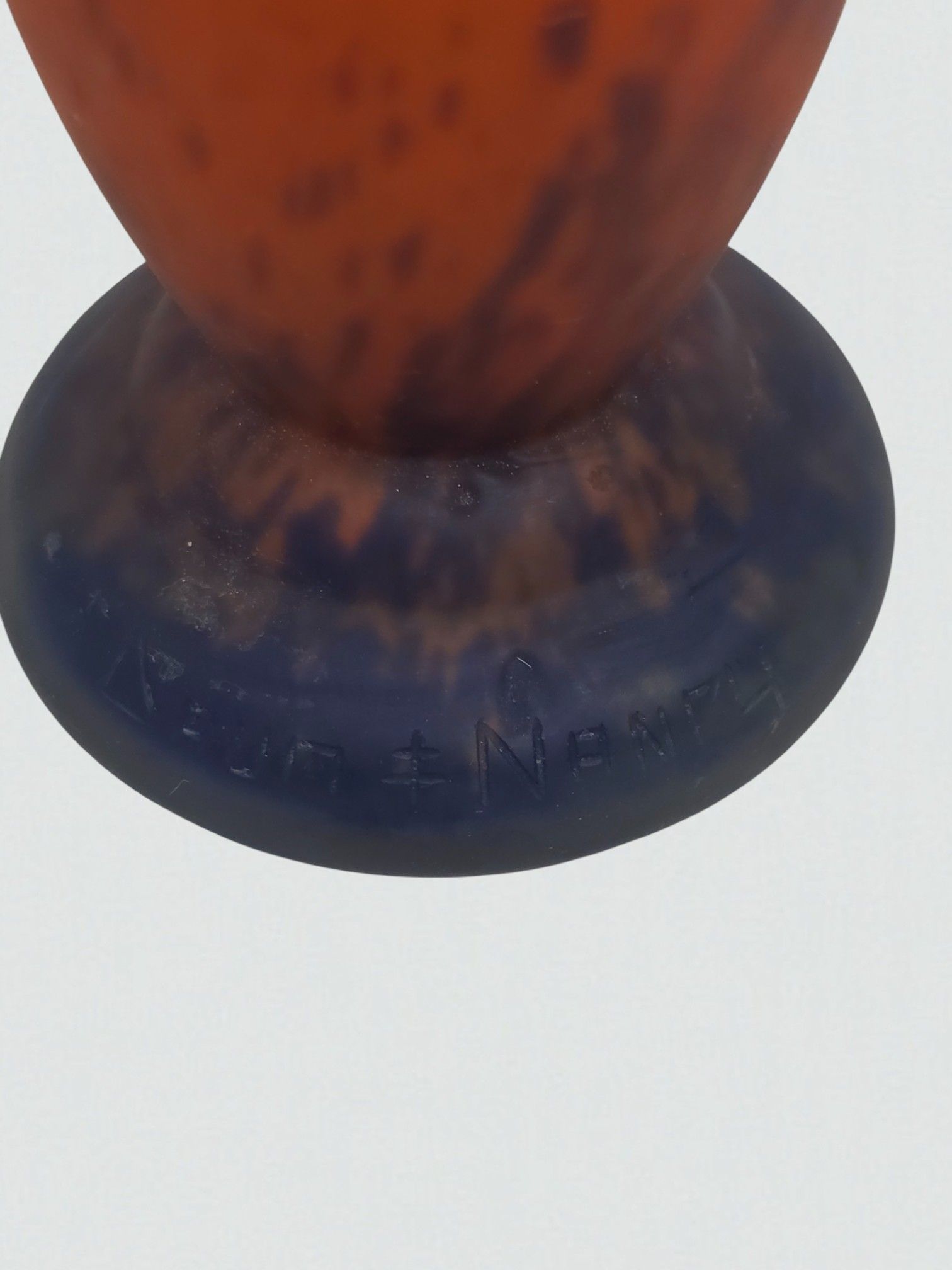 Mushroom" lamp in orange and blue marbled glass. Signed "Daum Nancy" H: 28 cm (Slight wear)