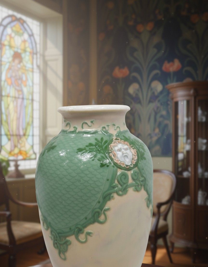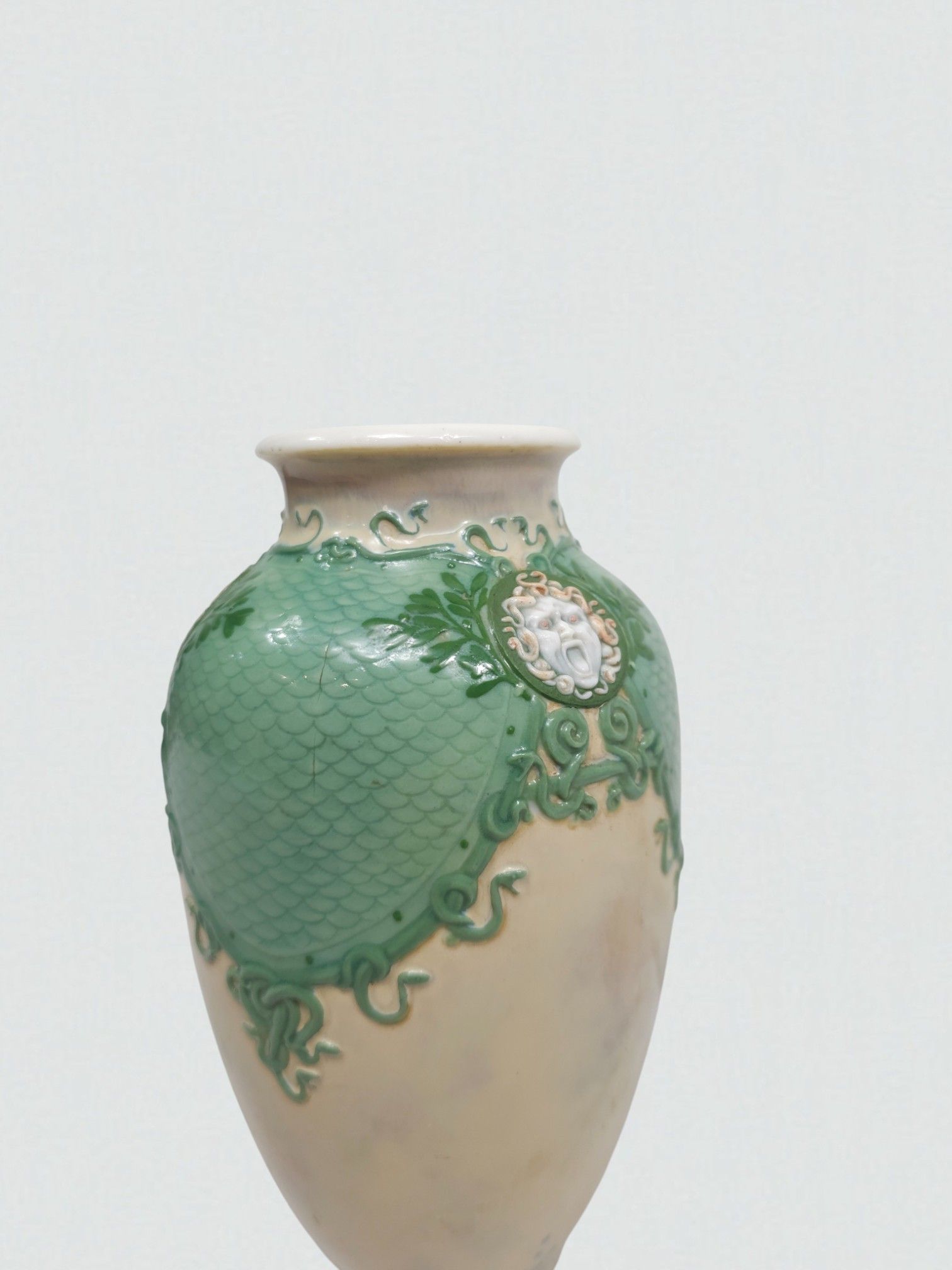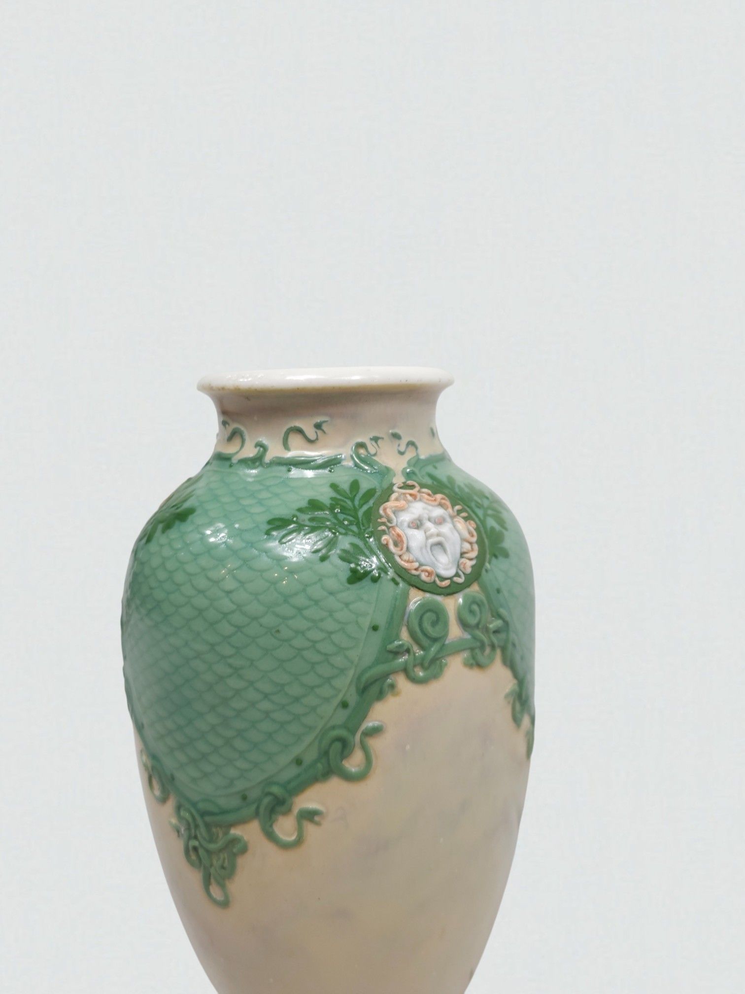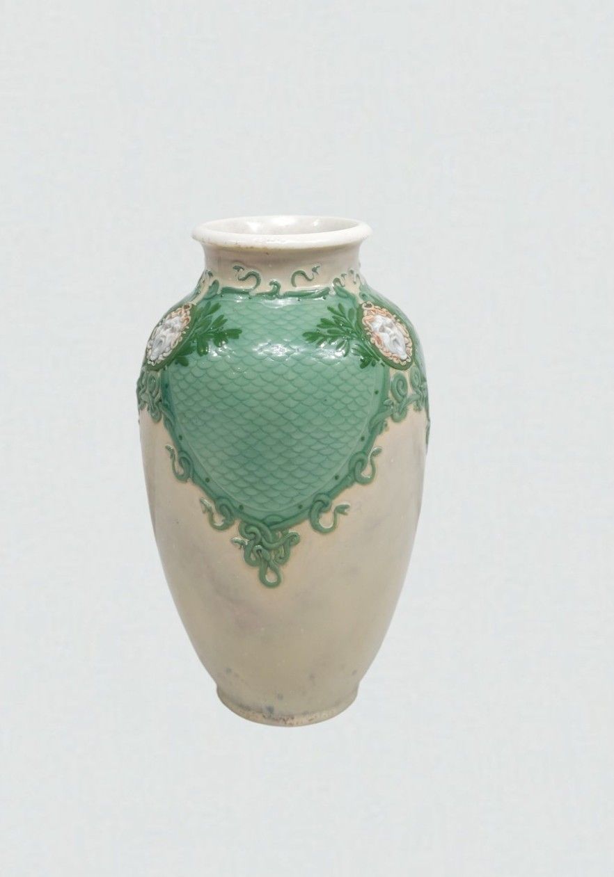 TAXILE MAXIMIN DOAT (1851 - 1938) Beautiful "paste on paste" porcelain vase decorated with scales and snakes in emerald green outline and flanked by 3 medallions of soap bubble and reddish Gorgon heads, the white background with blue, pink and brown inlays. H: 22 D: 12 cm. Signature under the base in red: his stamp followed by OAT Sèvres. Probably from the "Villa Kaolin" workshop in Sèvres between 1898 and 1909. The decoration is very close to the works of the Manufacture de Sèvres during the Universal Exhibition in Paris in 1900 and can also be compared to the signature with a snake decoration. * Taxile Doat was an influential decorator and modeller who revolutionised the Manufacture Nationale de Sèvres from 1877 to 1905. Renowned for his mastery of pâte-sur-pâte and Grand Feu enamels, he was a pioneer of the Art Nouveau style. His work at Sèvres came to an end after the Universal Exhibition of 1900 due to his "excessive notoriety" and his private workshop. (2 chips at the base; 1 crack in the shell; firing defect around the neck).
