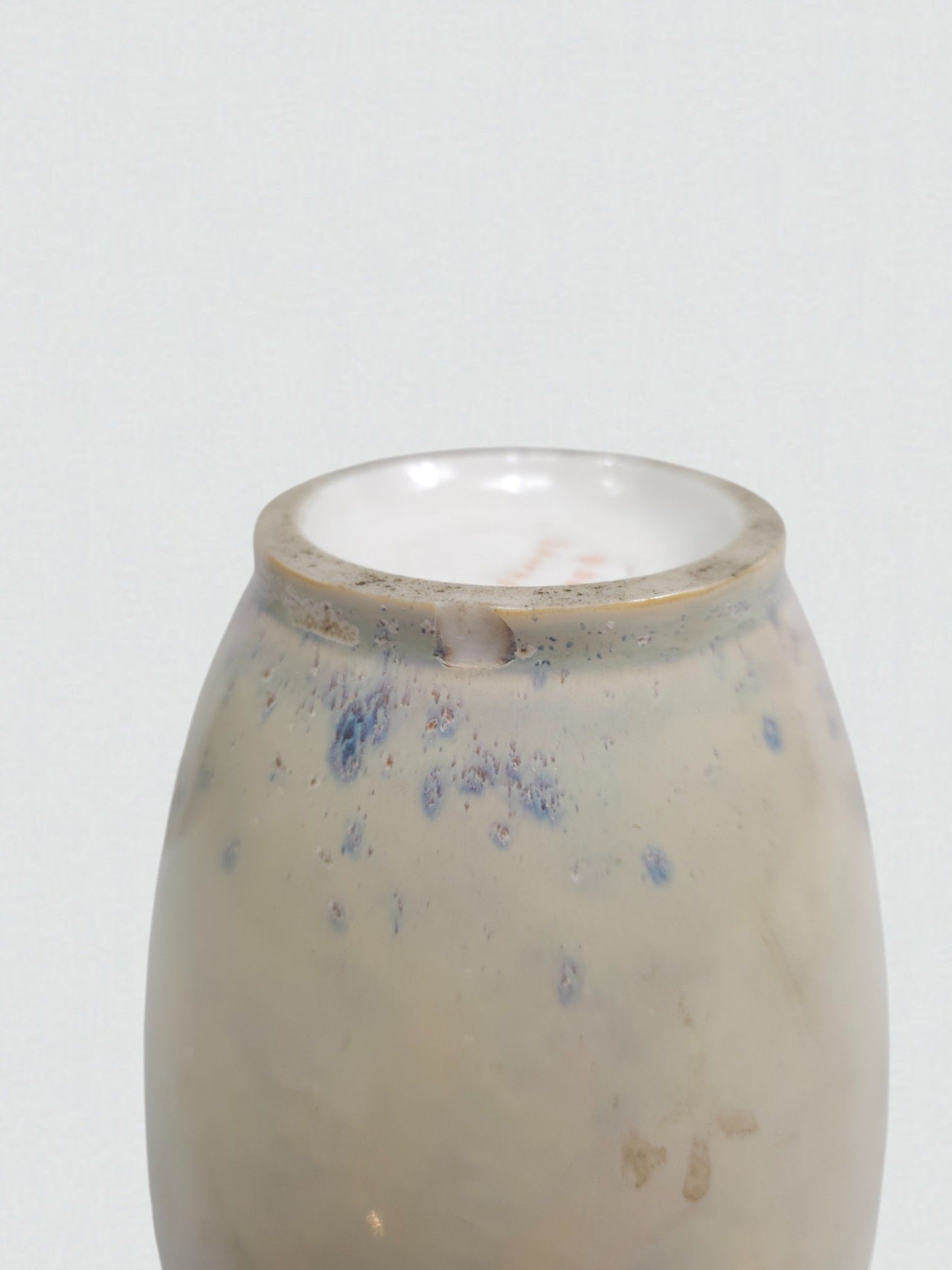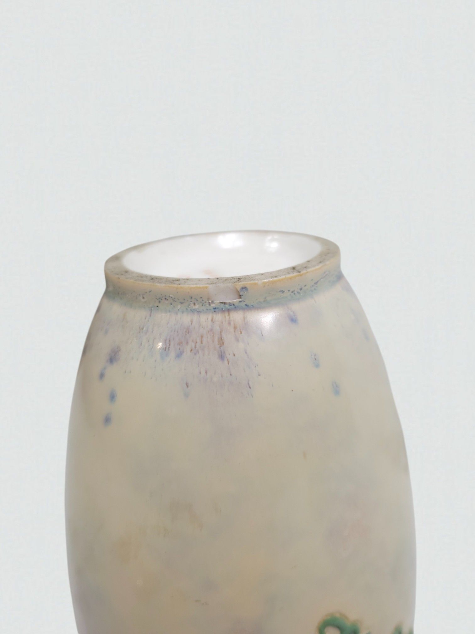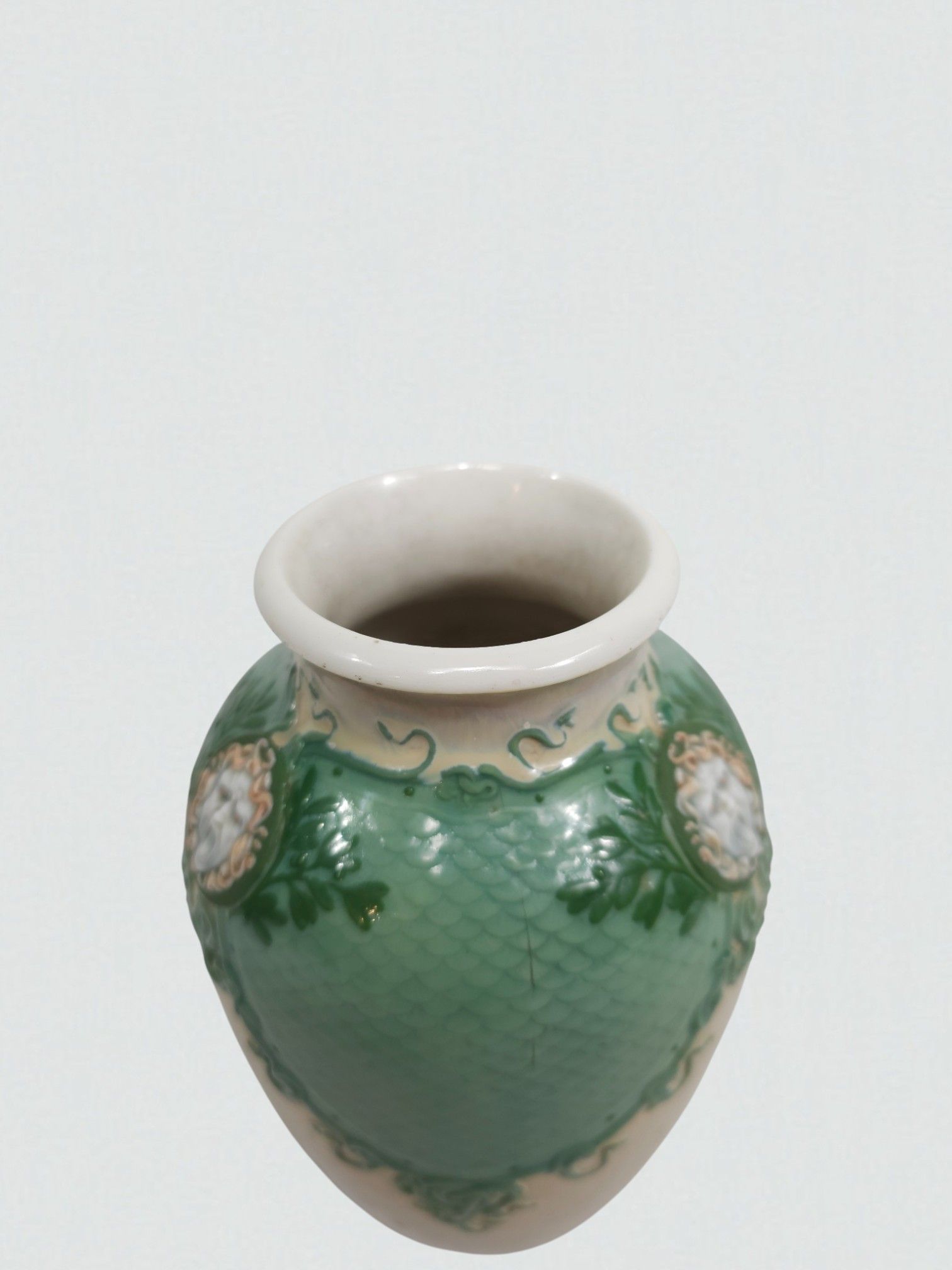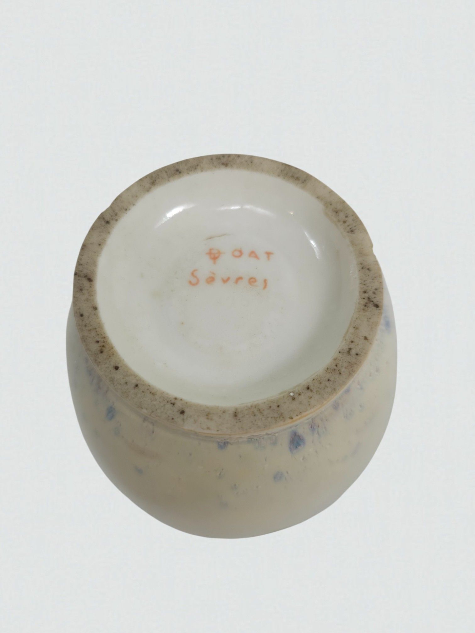 TAXILE MAXIMIN DOAT (1851 - 1938) Beautiful "paste on paste" porcelain vase decorated with scales and snakes in emerald green outline and flanked by 3 medallions of soap bubble and reddish Gorgon heads, the white background with blue, pink and brown inlays. H: 22 D: 12 cm. Signature under the base in red: his stamp followed by OAT Sèvres. Probably from the "Villa Kaolin" workshop in Sèvres between 1898 and 1909. The decoration is very close to the works of the Manufacture de Sèvres during the Universal Exhibition in Paris in 1900 and can also be compared to the signature with a snake decoration. * Taxile Doat was an influential decorator and modeller who revolutionised the Manufacture Nationale de Sèvres from 1877 to 1905. Renowned for his mastery of pâte-sur-pâte and Grand Feu enamels, he was a pioneer of the Art Nouveau style. His work at Sèvres came to an end after the Universal Exhibition of 1900 due to his "excessive notoriety" and his private workshop. (2 chips at the base; 1 crack in the shell; firing defect around the neck).