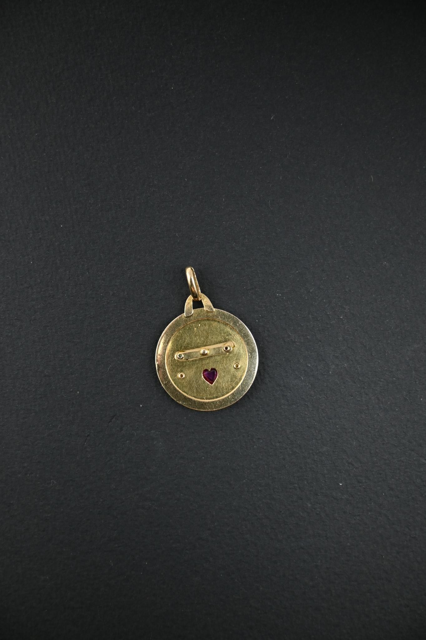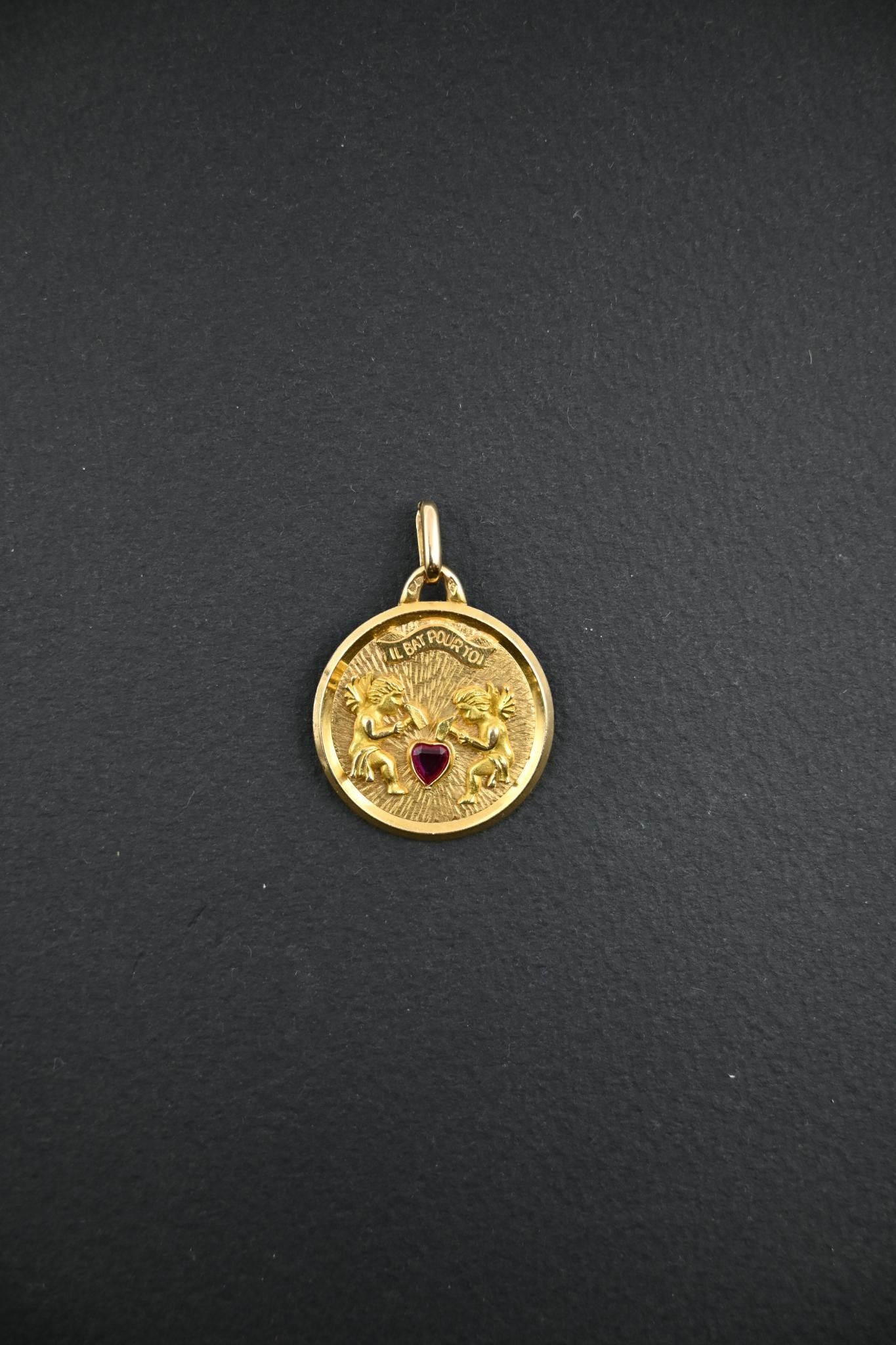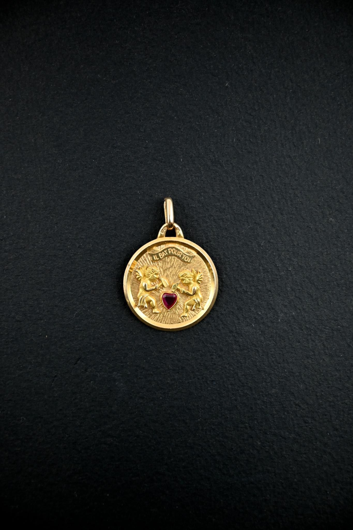 Love medal in 18K gold "Il bat pour toi" featuring two mobile cherubs hammering a red stone heart.