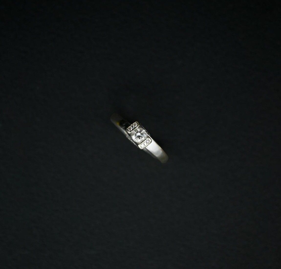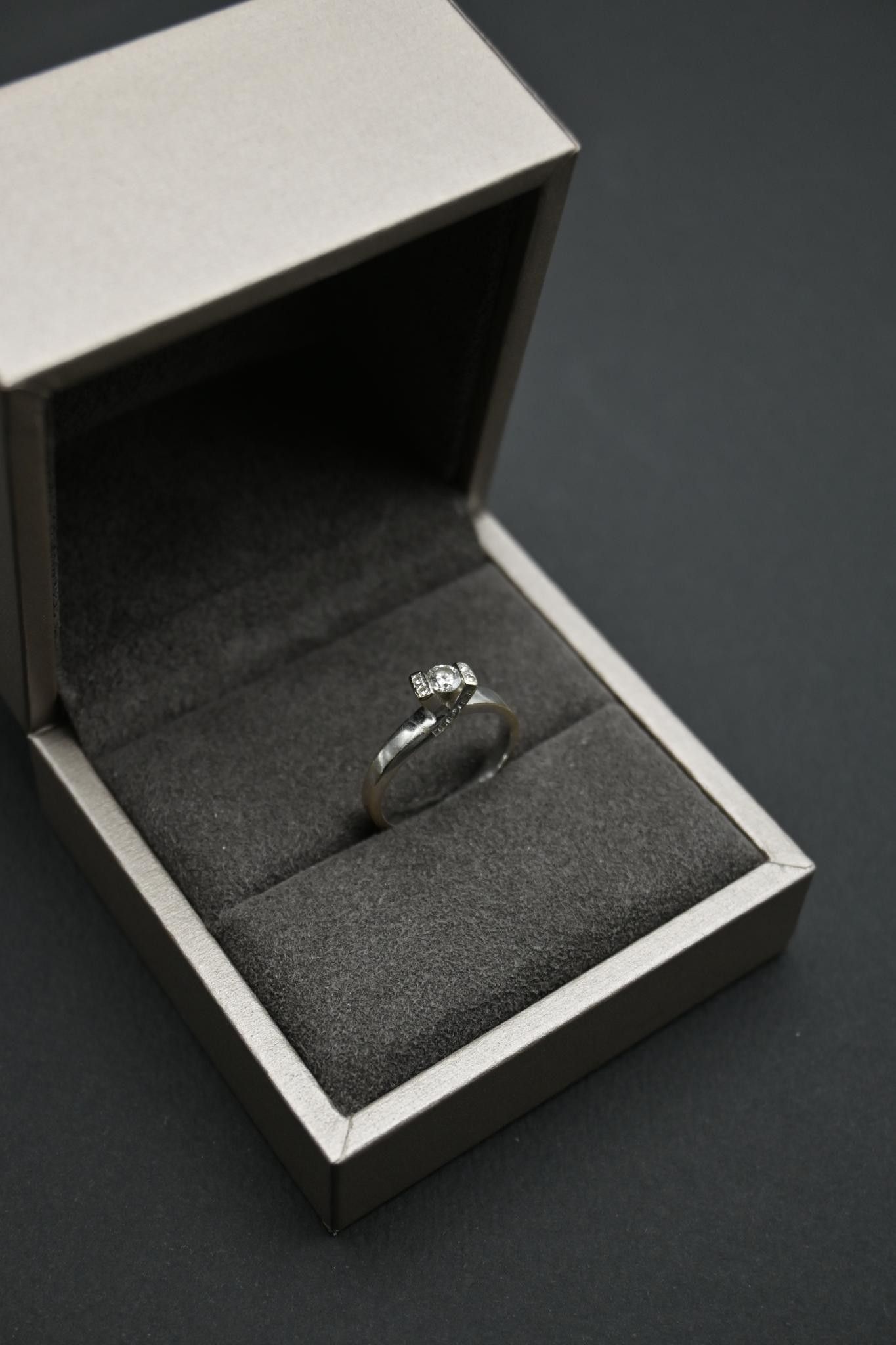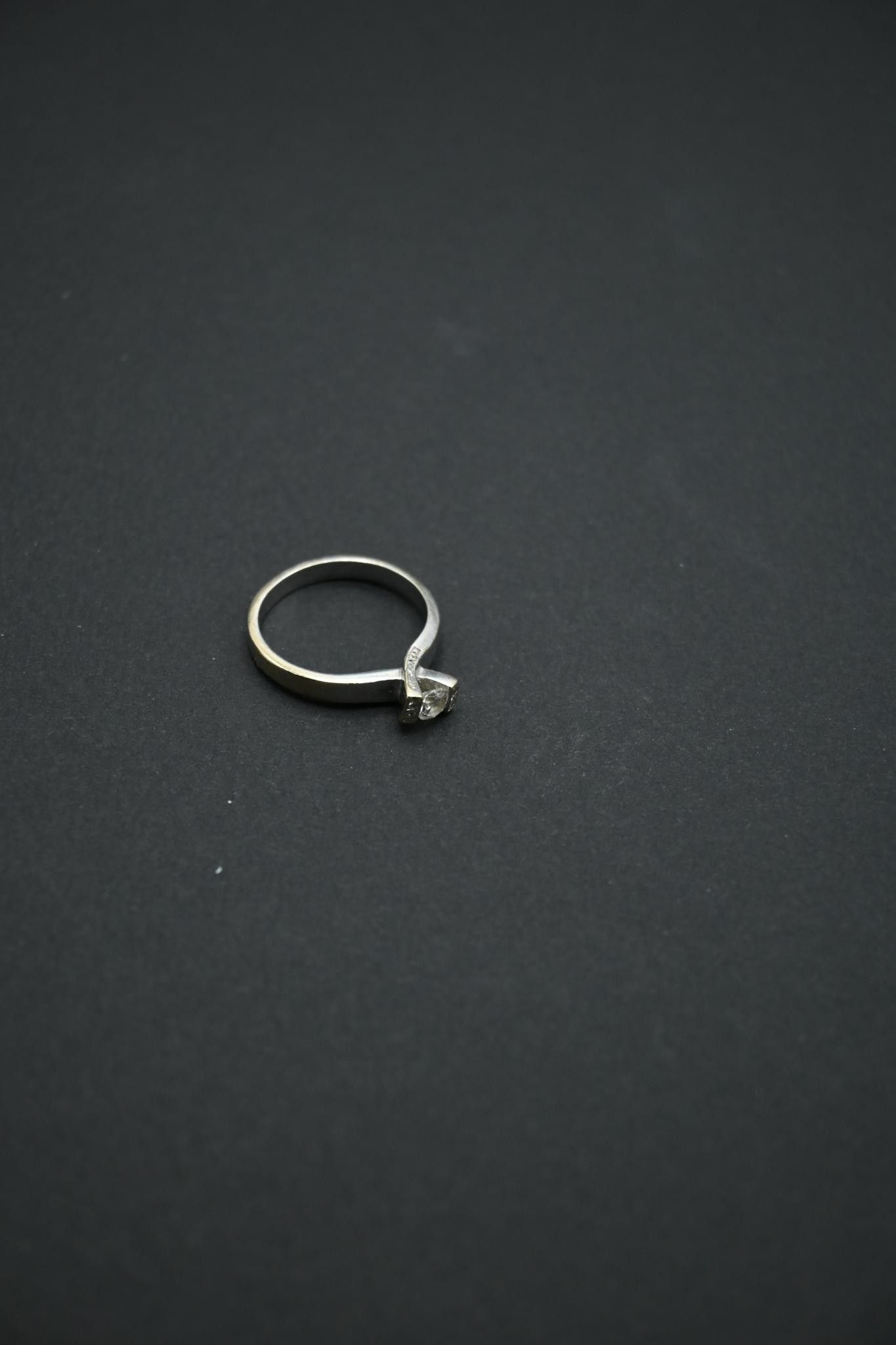 Solitaire in 18K 750 thousandths white gold set with a modern-cut diamond weighing approximately 0.15 ct and small diamonds.