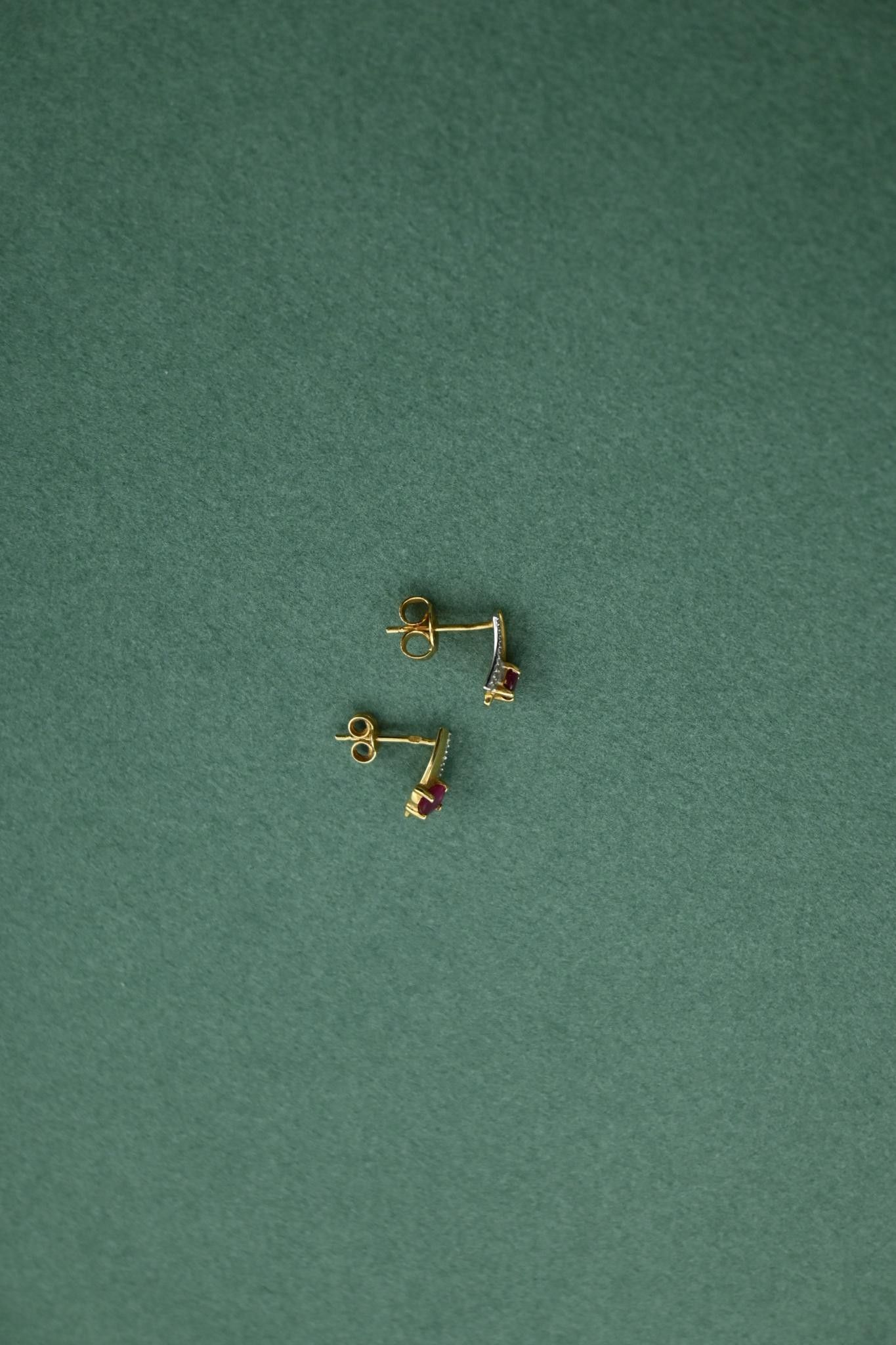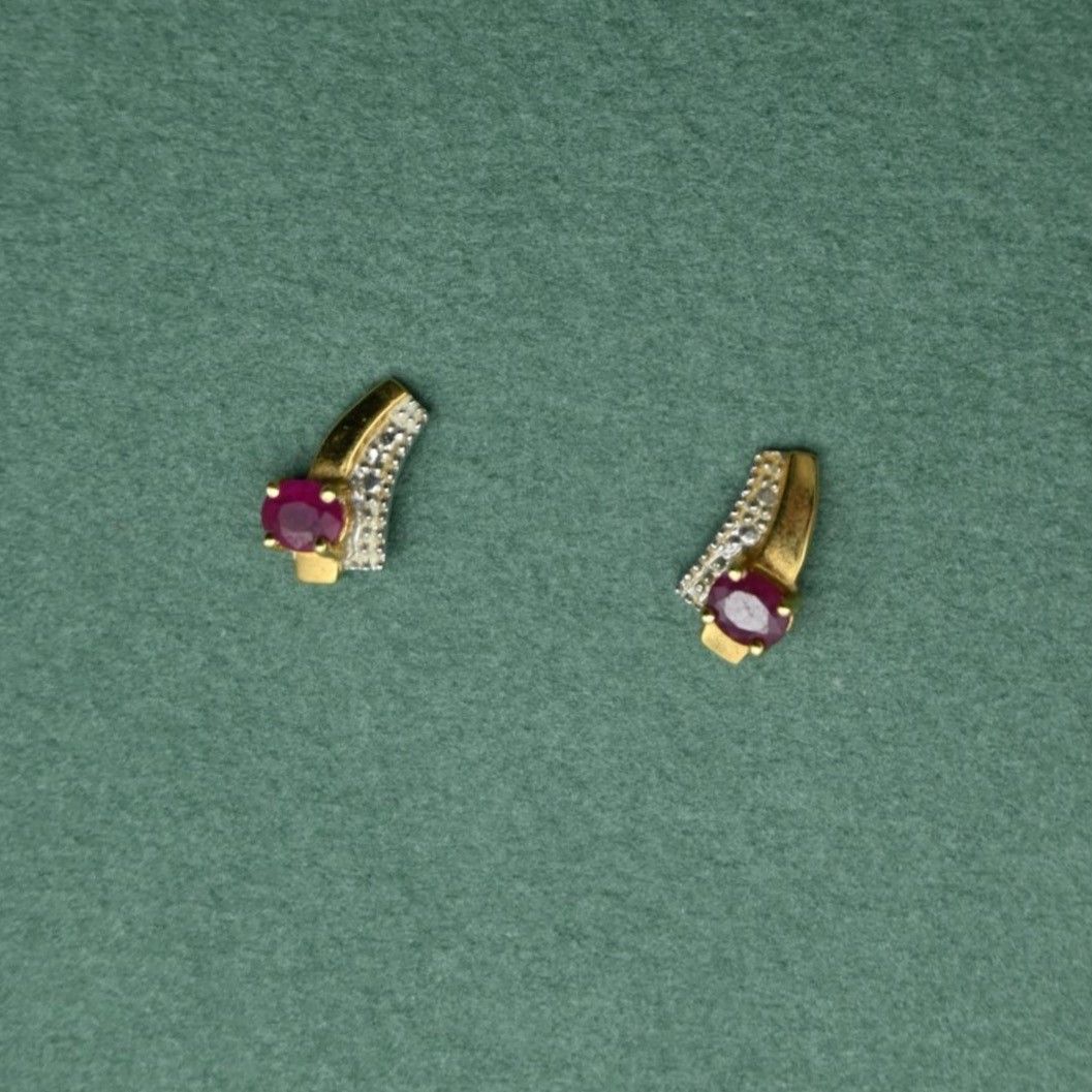 Pair of two-tone earrings in 18K 750 thousandths gold set with oval rubies (one in gilded metal).