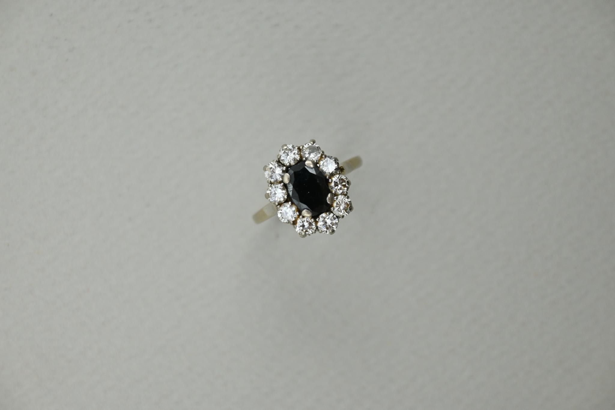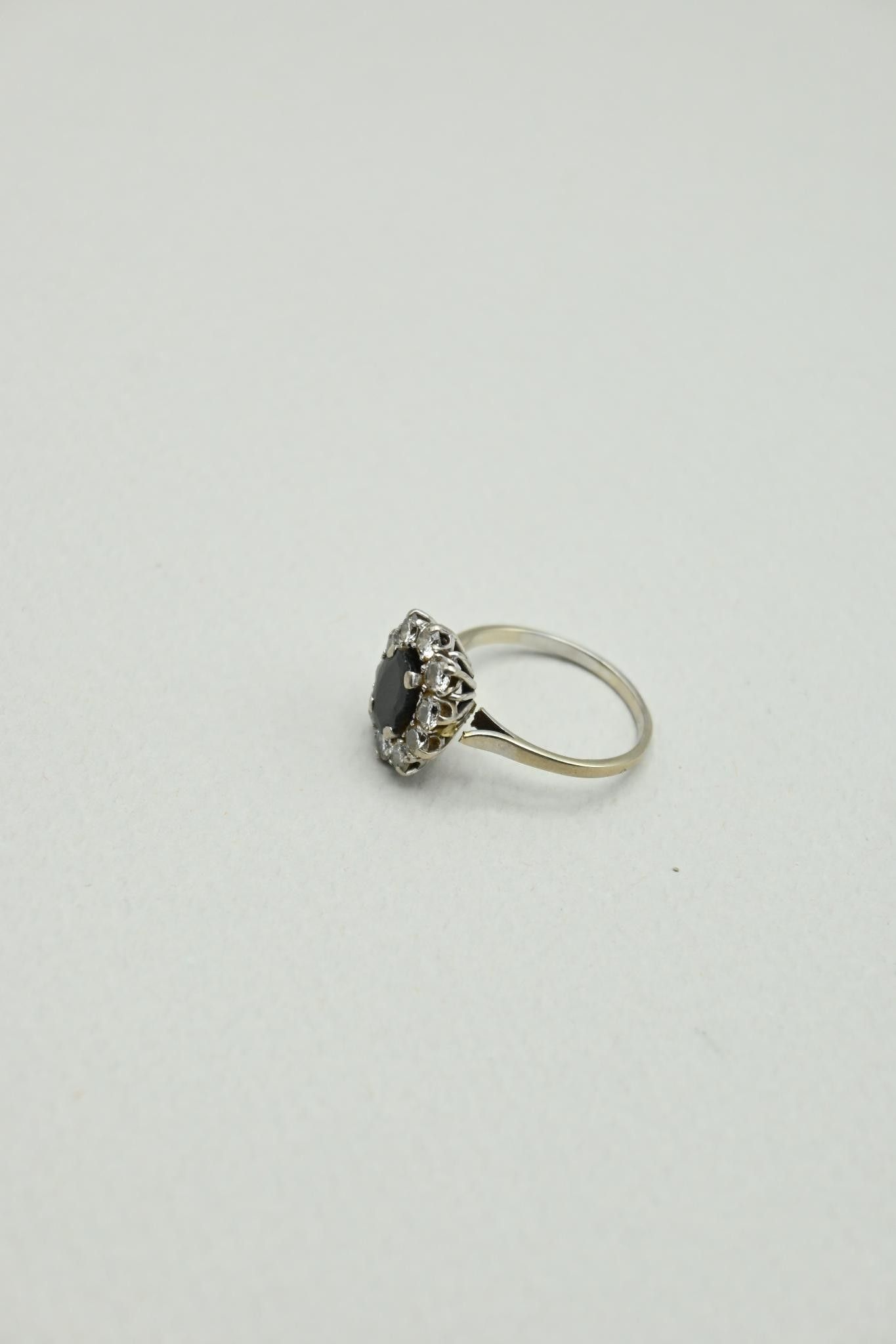 Marguerite ring in 18K white gold 750 thousandths, sapphire (accidents) and ten modern-cut diamonds (10 x 0.15 carat approx.)