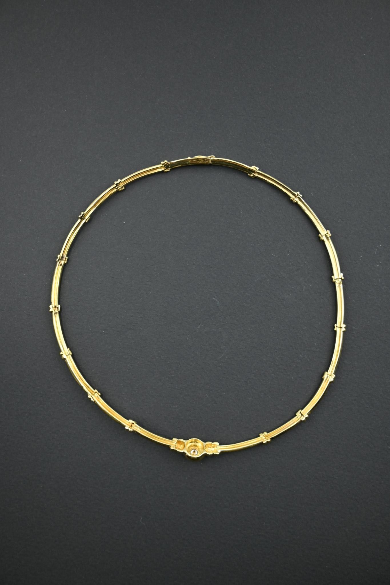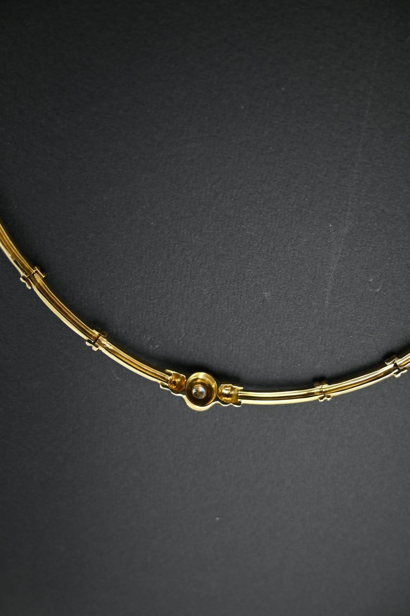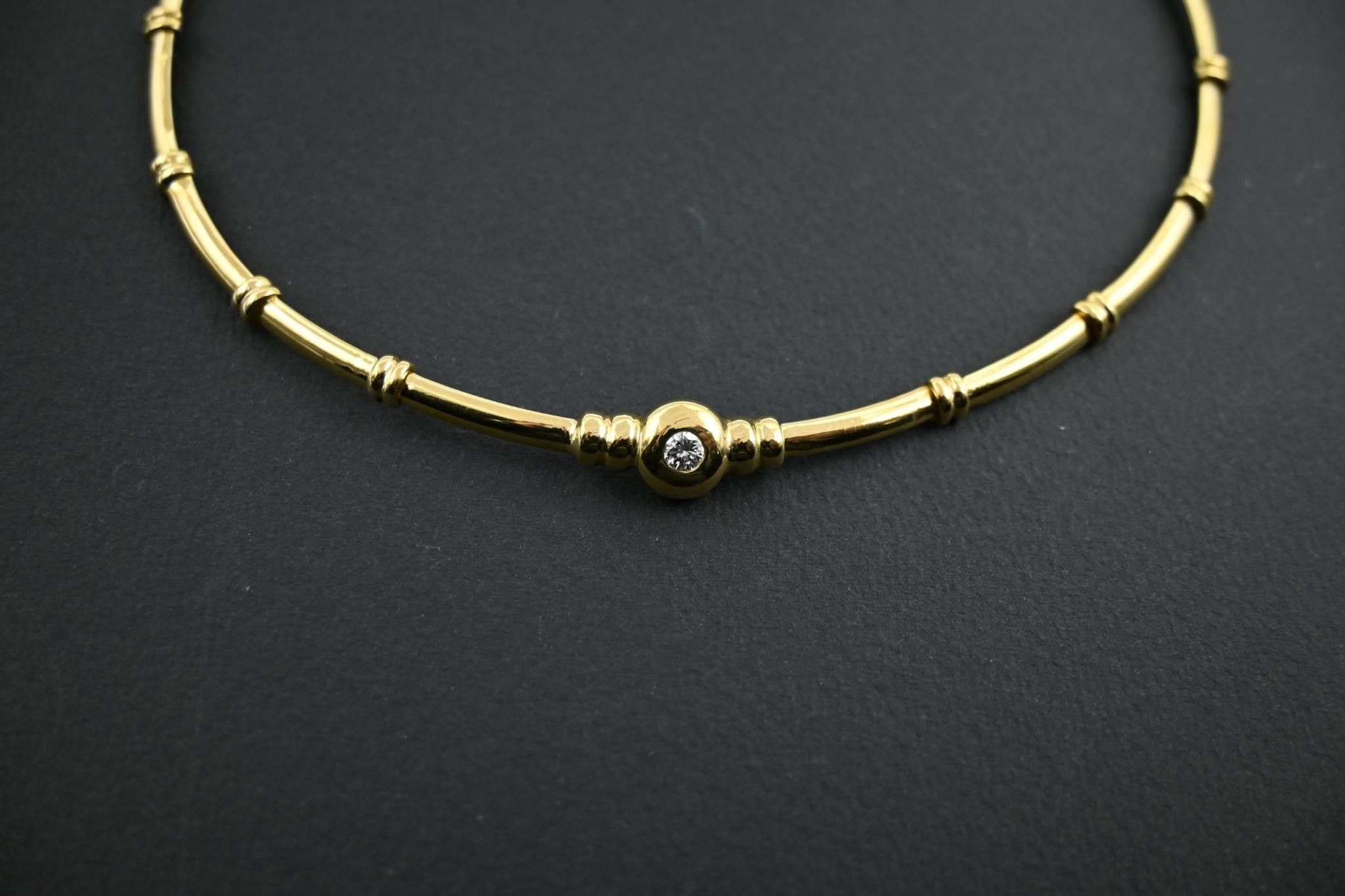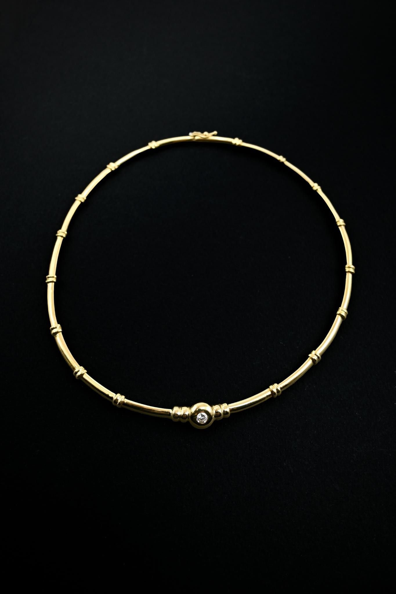 Semi-rigid necklace in 18K gold 750 thousandths with central motif of a modern-cut diamond weighing approximately 0.35 carat in a closed setting.