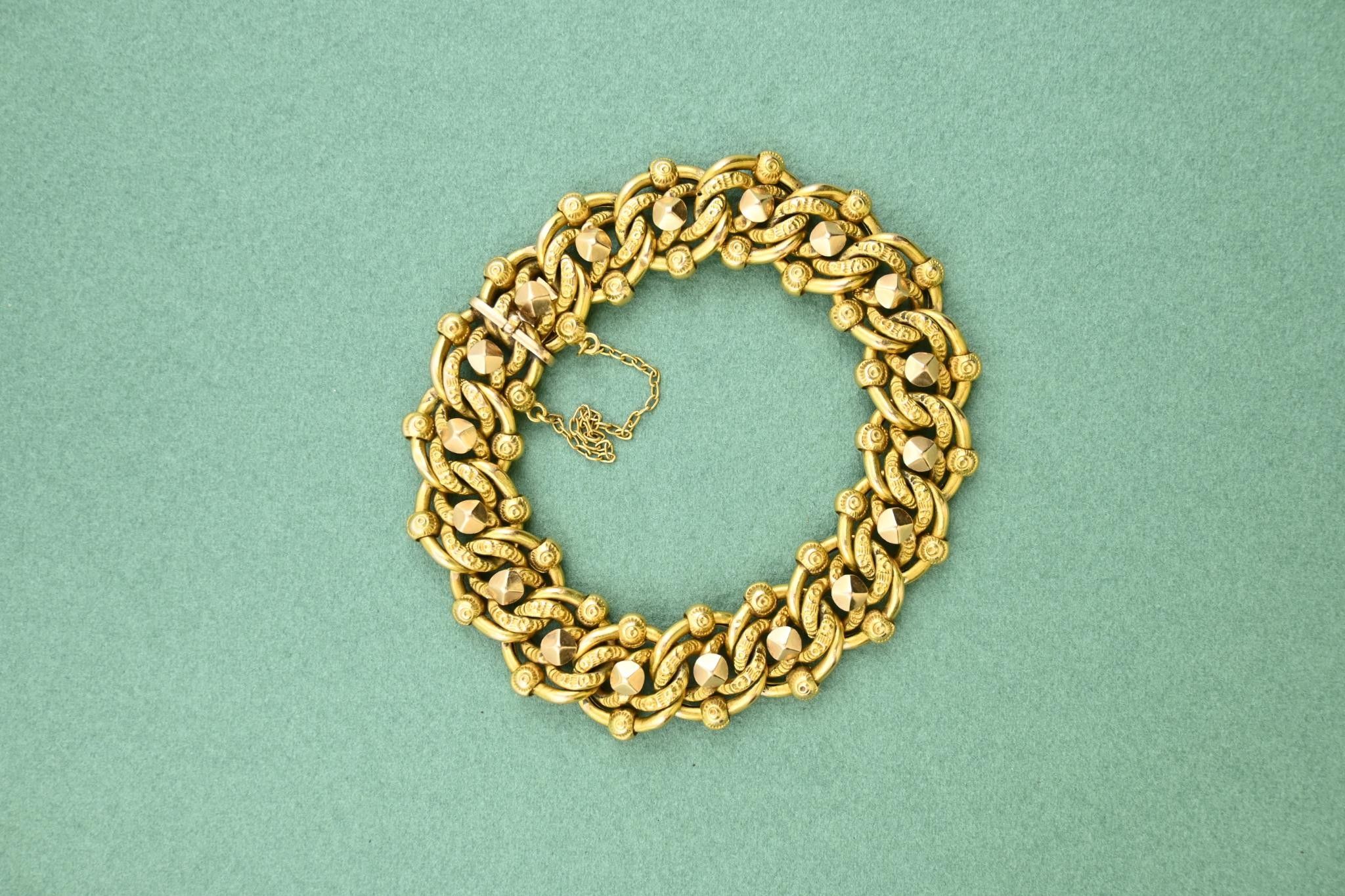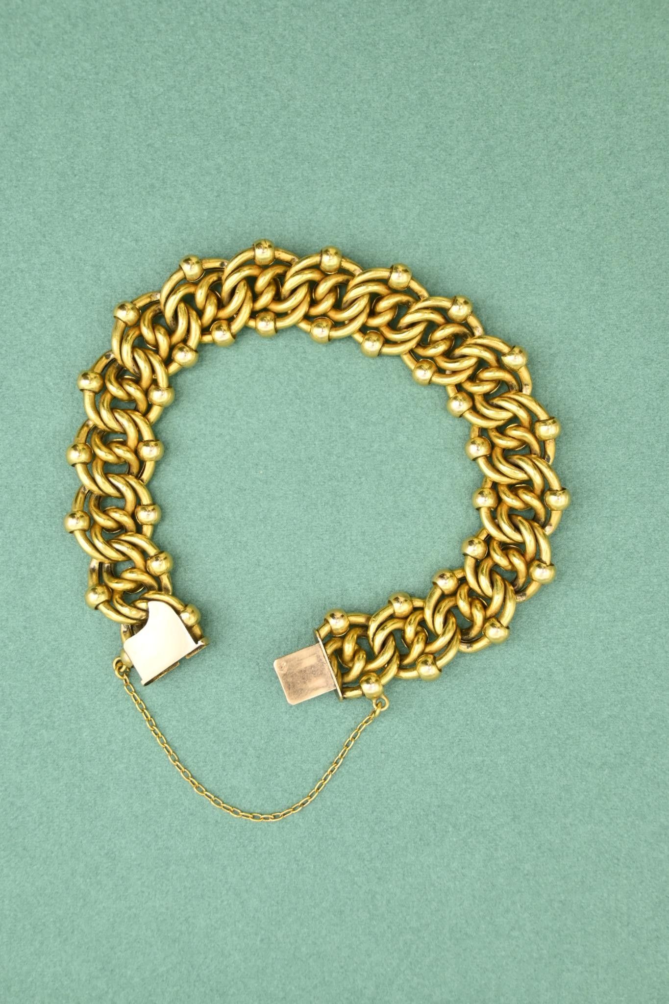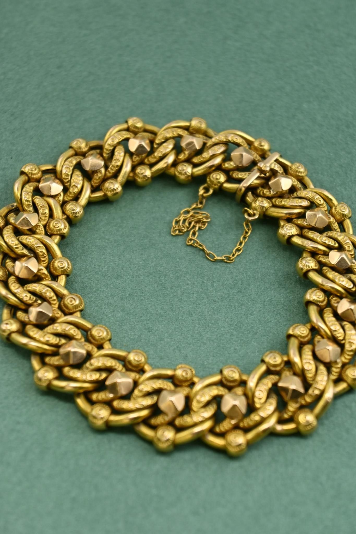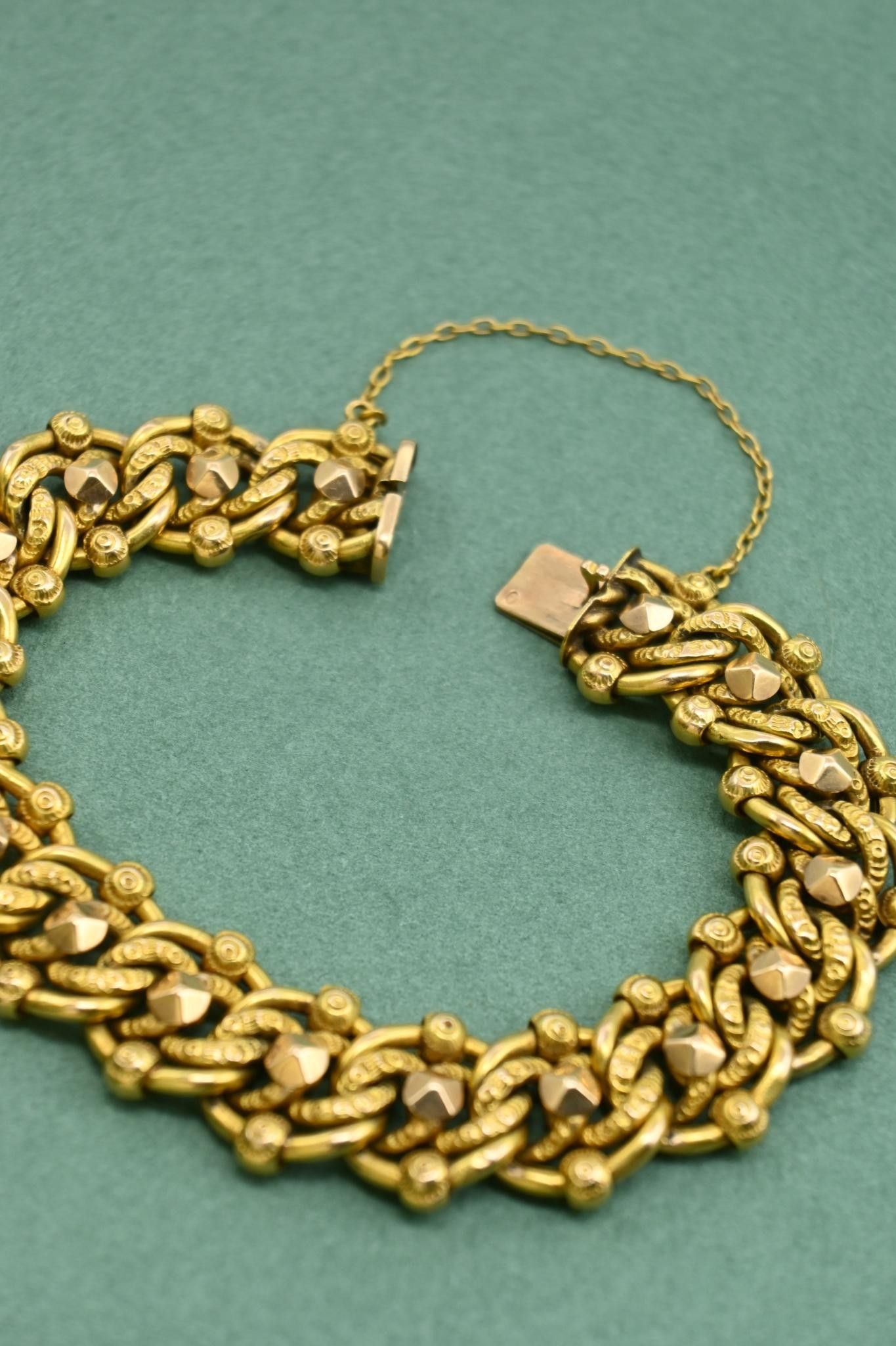 Antique 18K 750 thousandth gold bracelet with partly chased interlaced links. With safety chain.