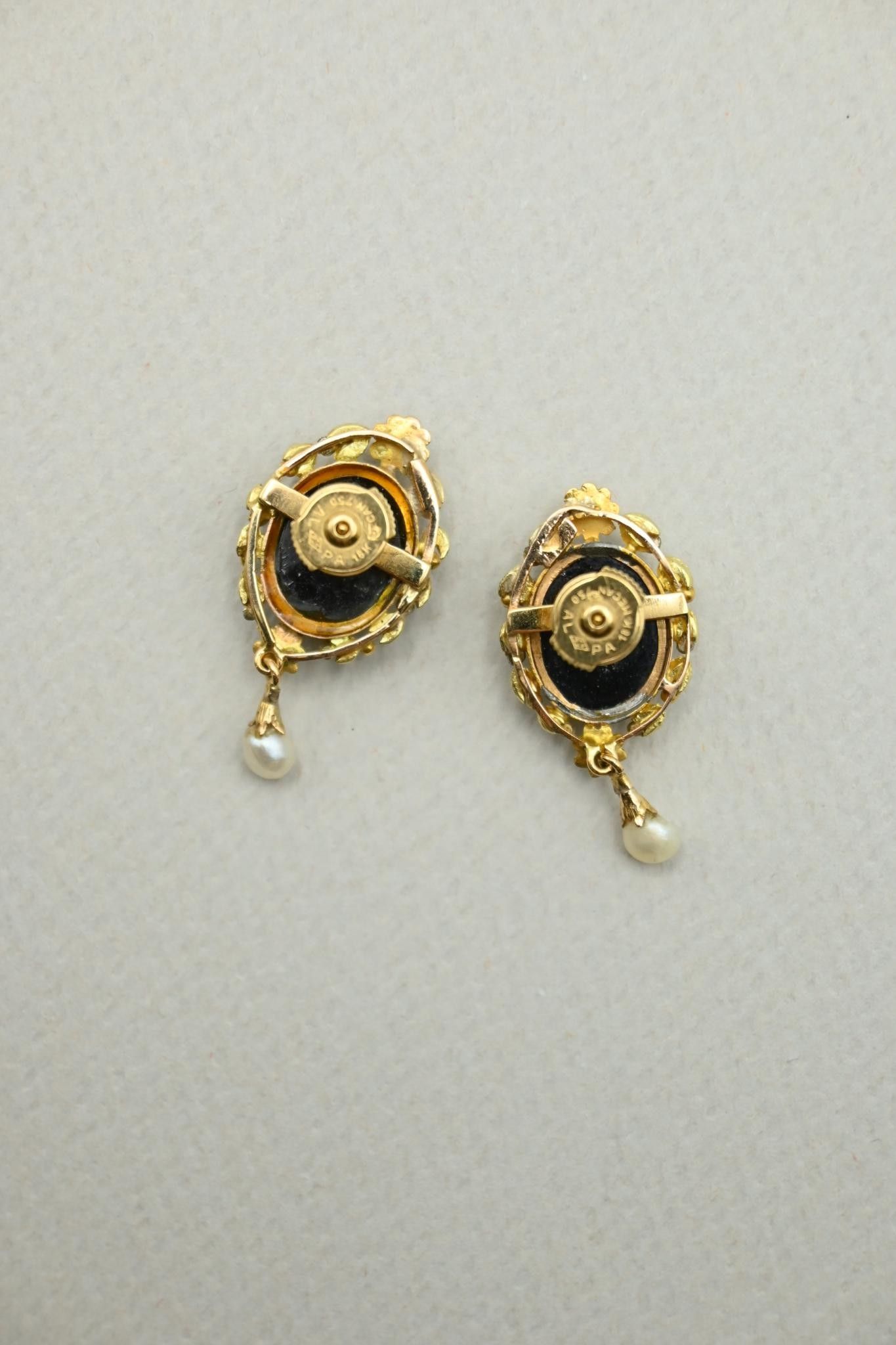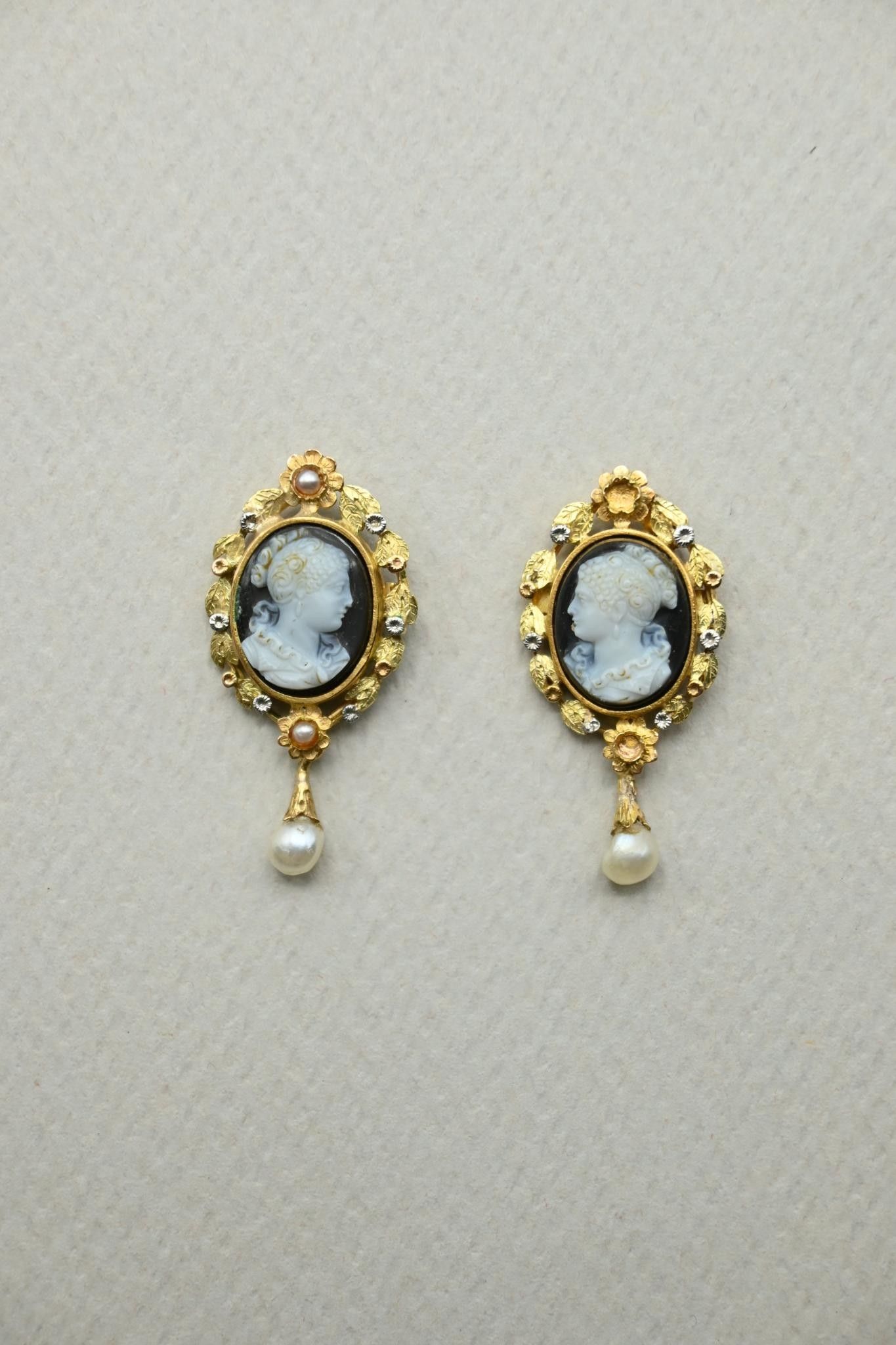 Pair of three-tone 18K 750 thousandths gold earrings set with a central cameo on black stone and a baroque pearl pendant.