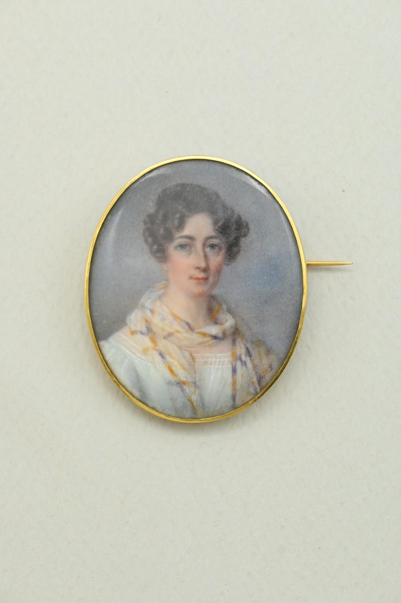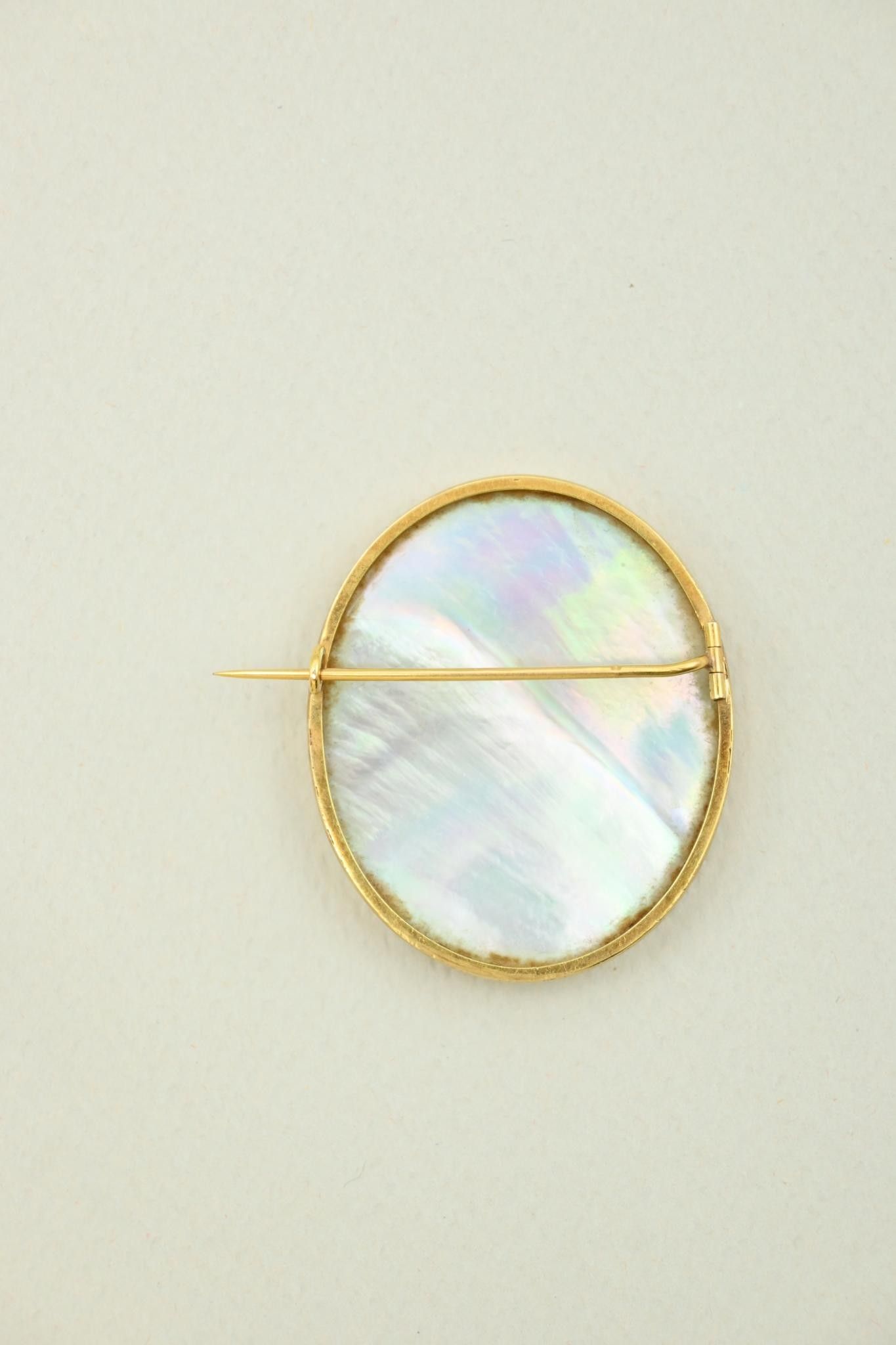 18K 750 thousandths gold brooch centred on a miniature of a young woman with a scarf on a mother-of-pearl background.