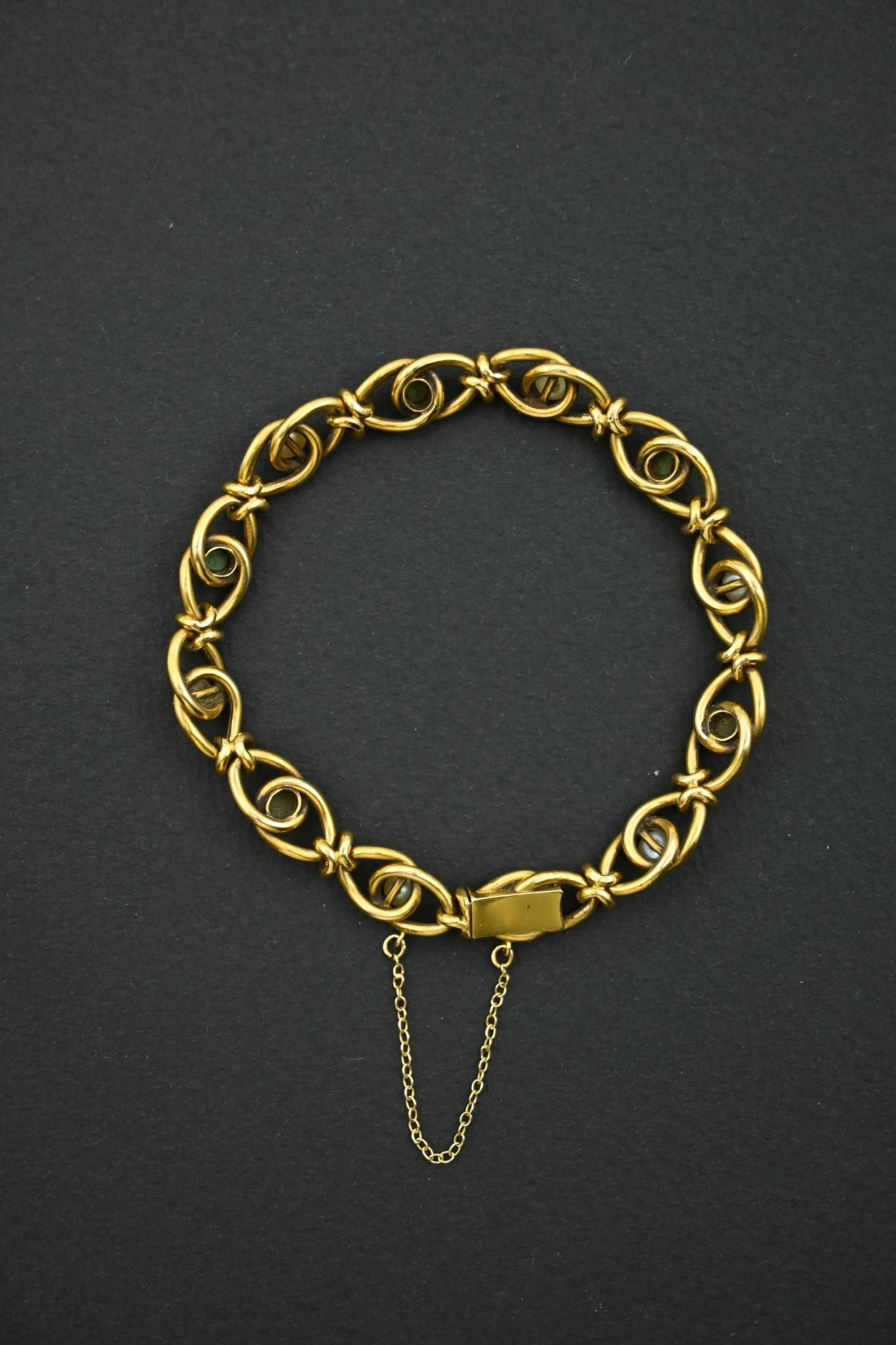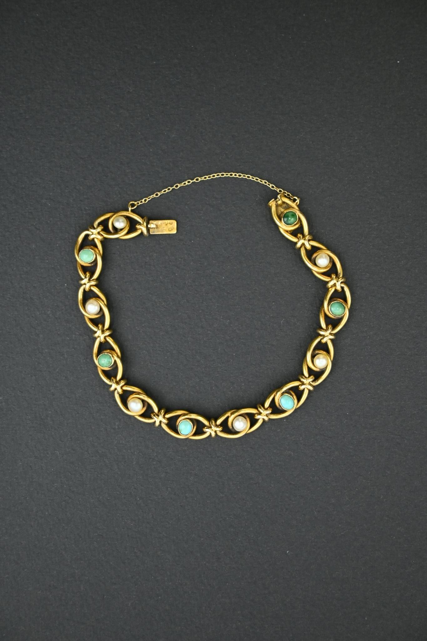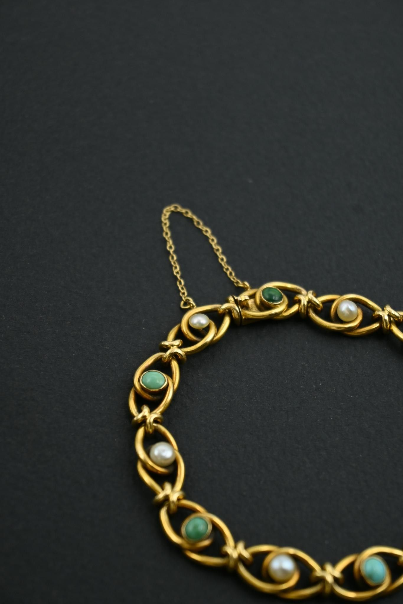 Bracelet in 18K gold embellished with turquoise and pearls. With safety chain.