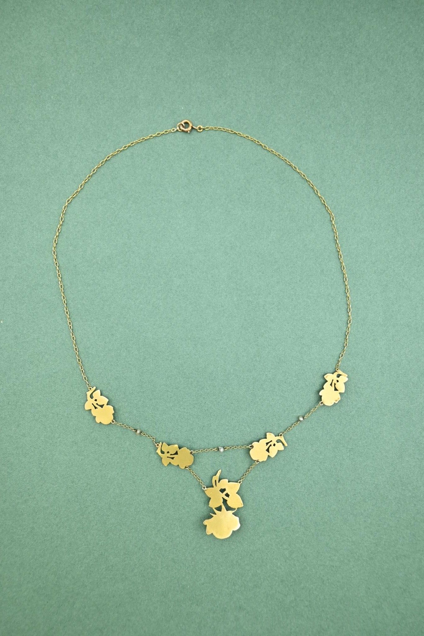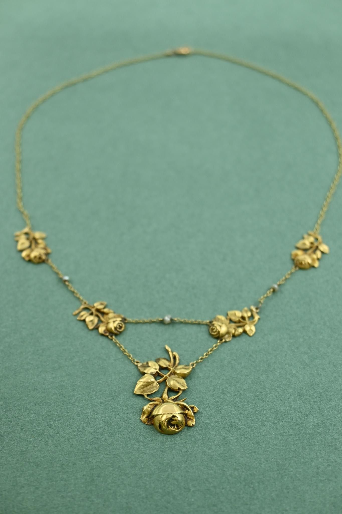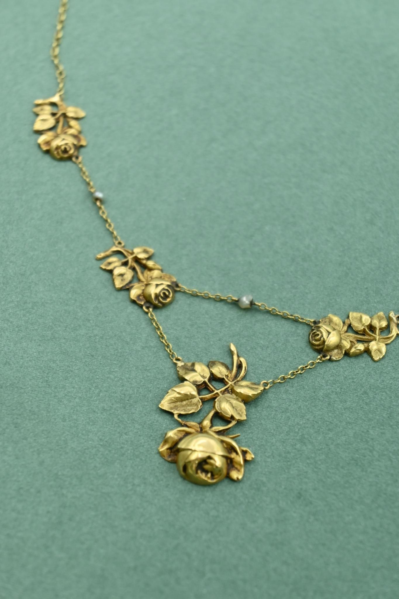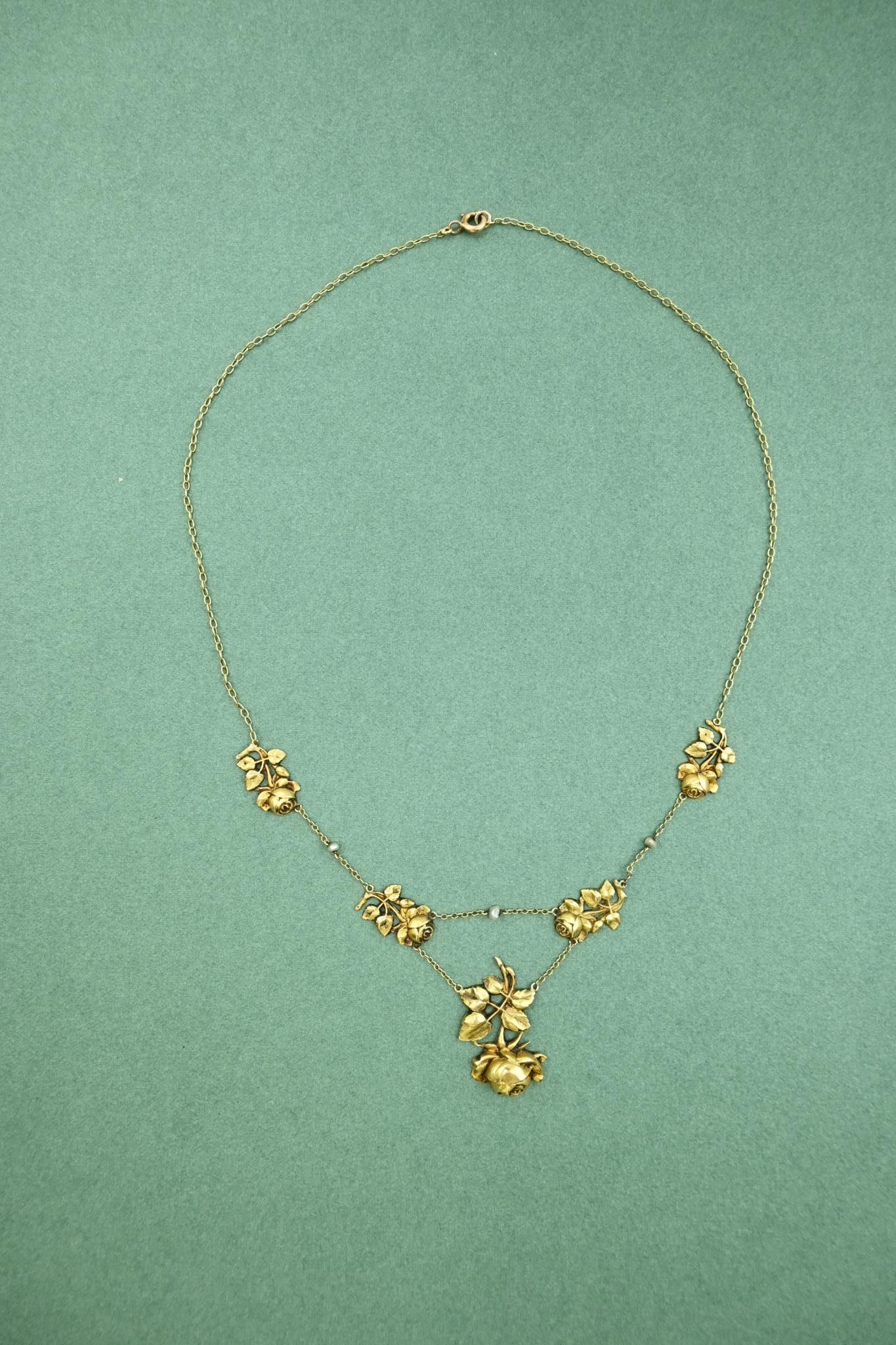 Necklace in 18K 750 gold with five roses in foliage and three small pearls. Art Nouveau work.