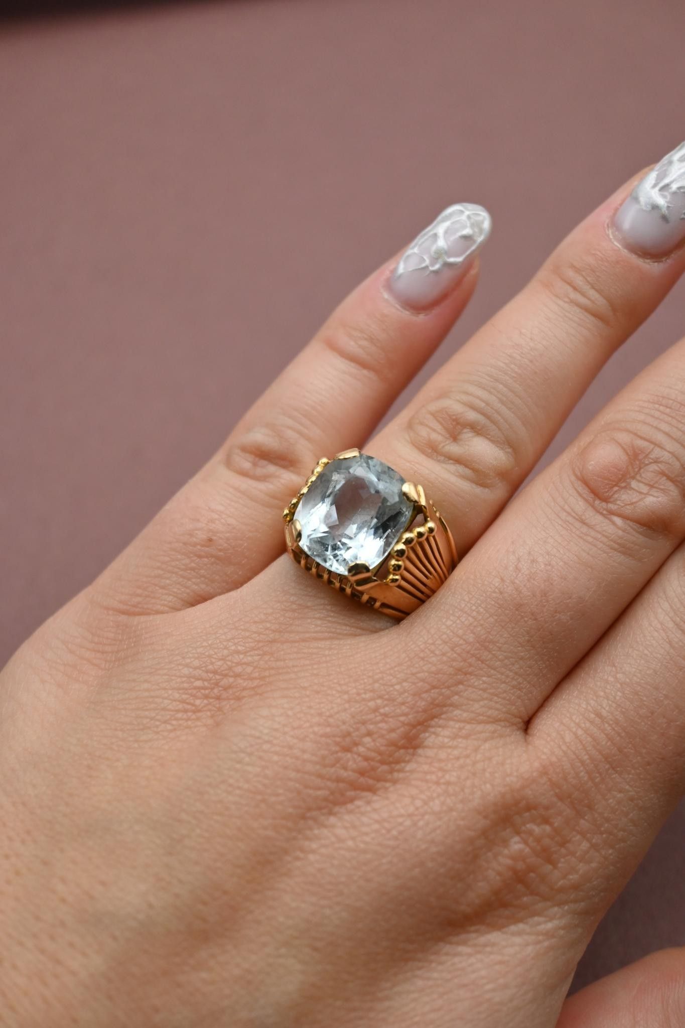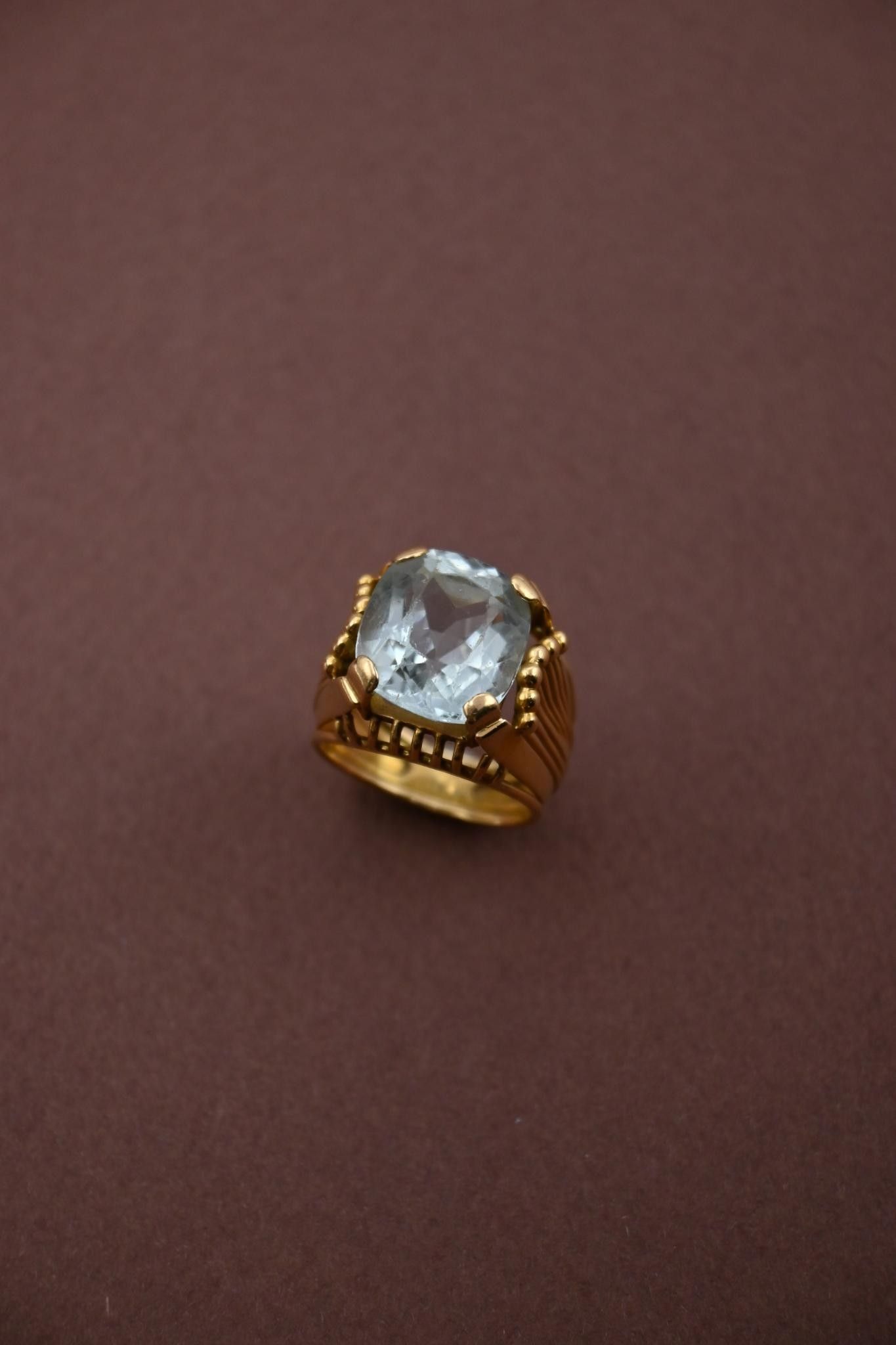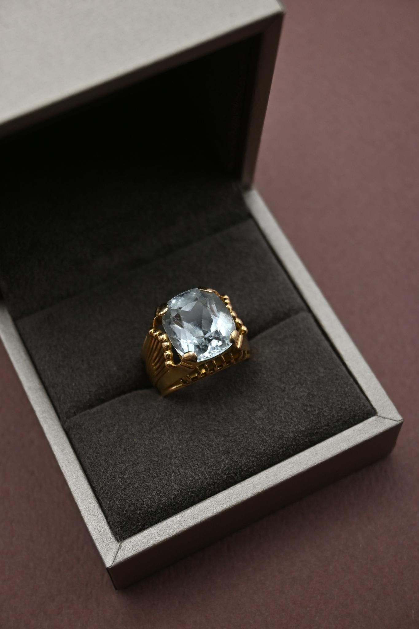 18K gold ring centred on a cushion aquamarine (stone rubbed and tilted in its setting).