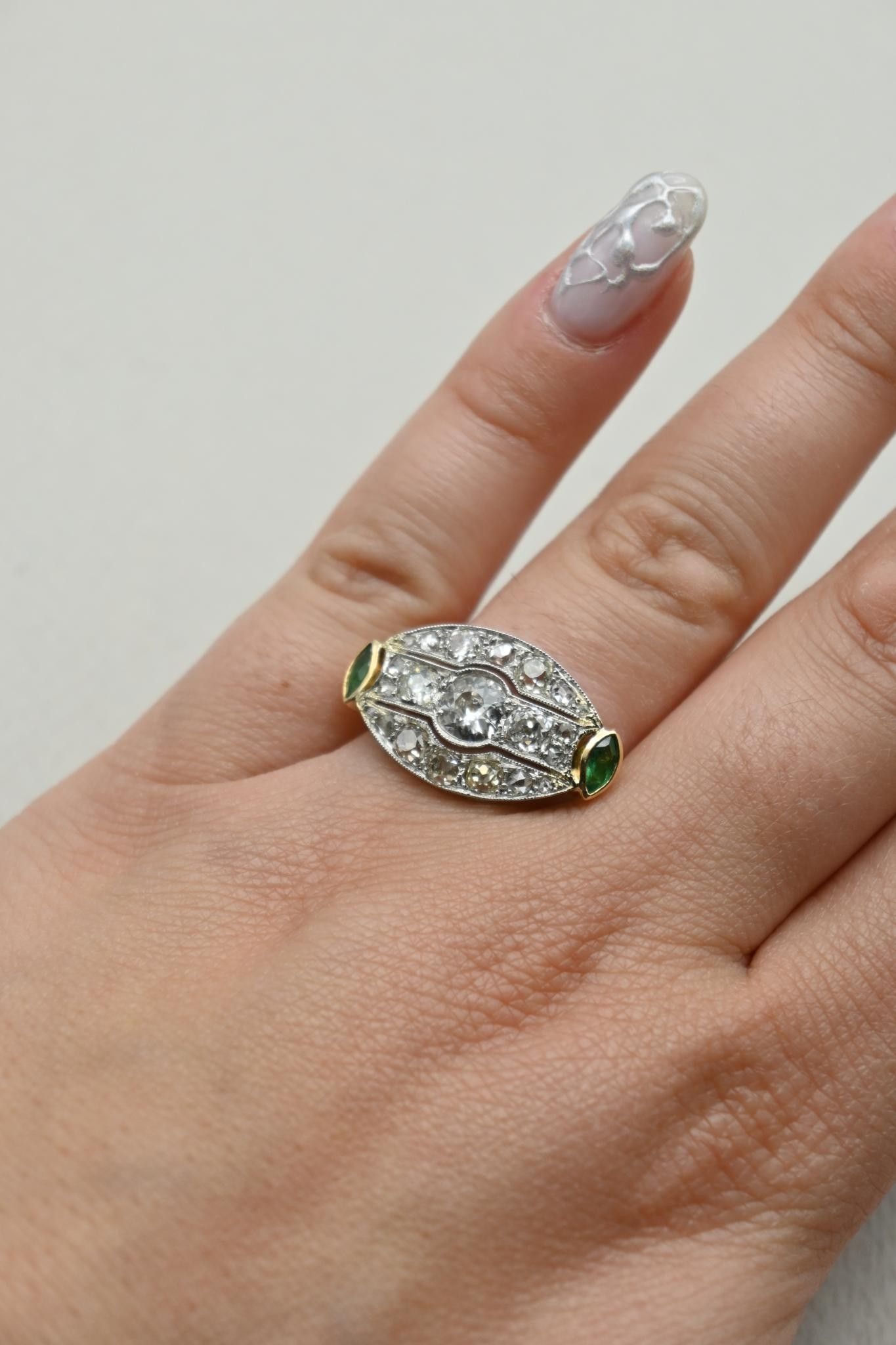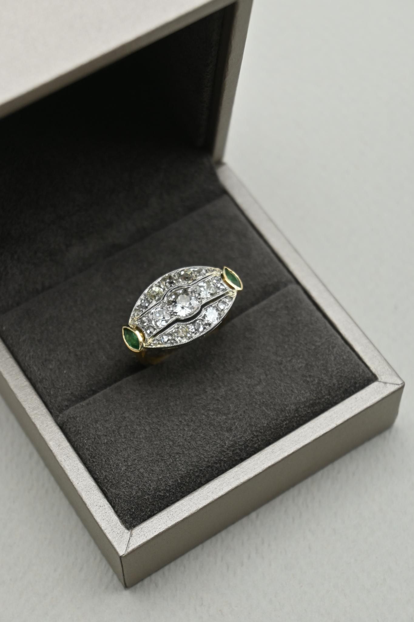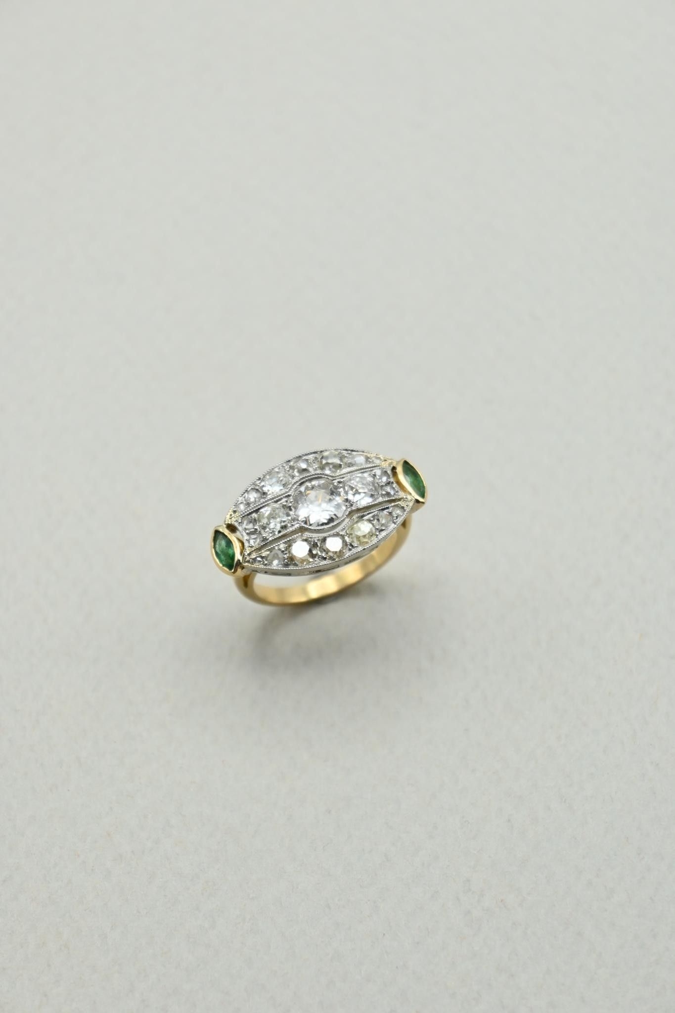 Inverted Marquise ring in 18K 750 thousandths gold with long plateau set with a central old-cut diamond weighing approximately 0.60 carat in a pavement of diamonds, also old-cut, totalling 1.20 carats. Two navette emeralds around the edge.