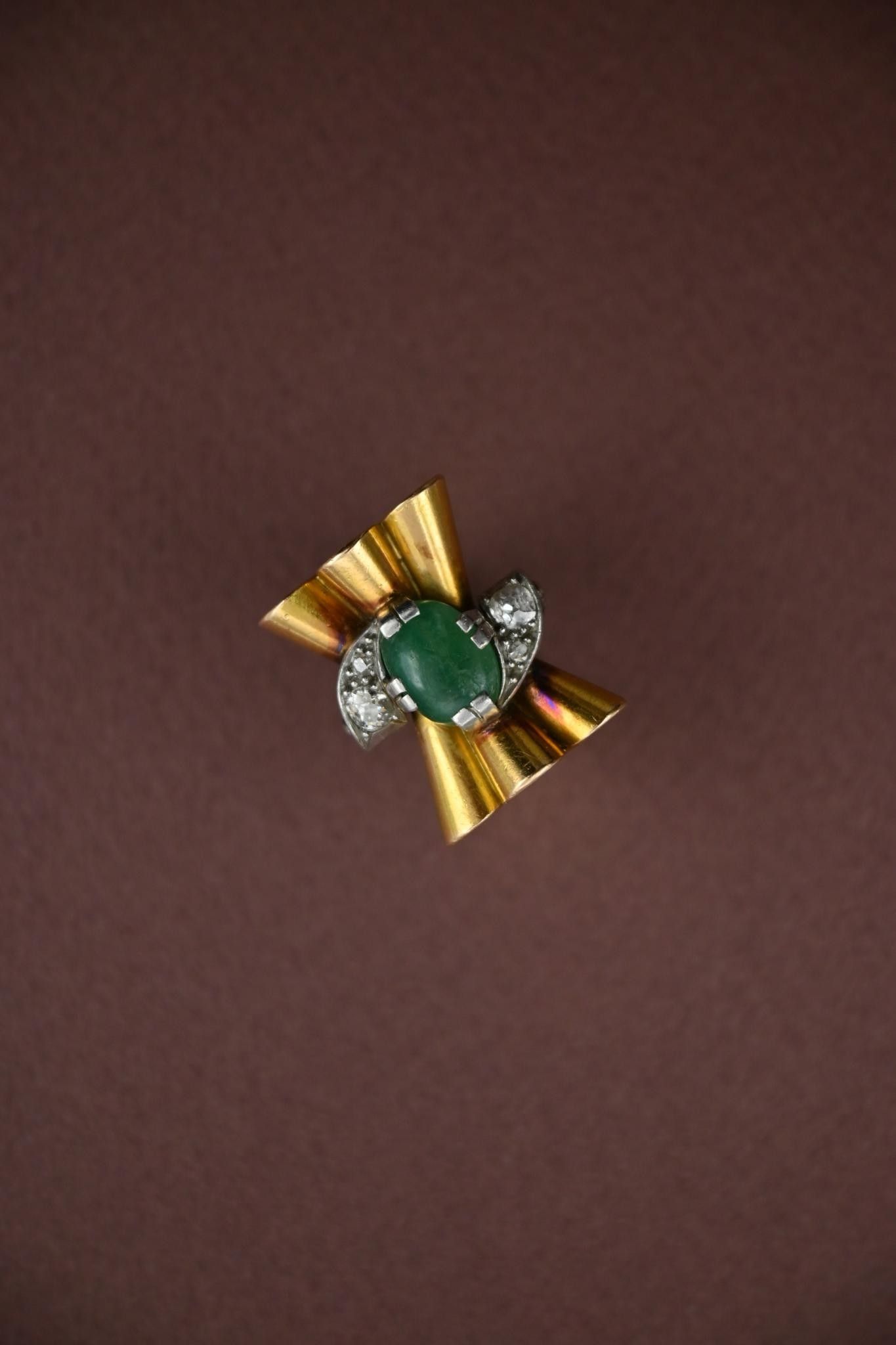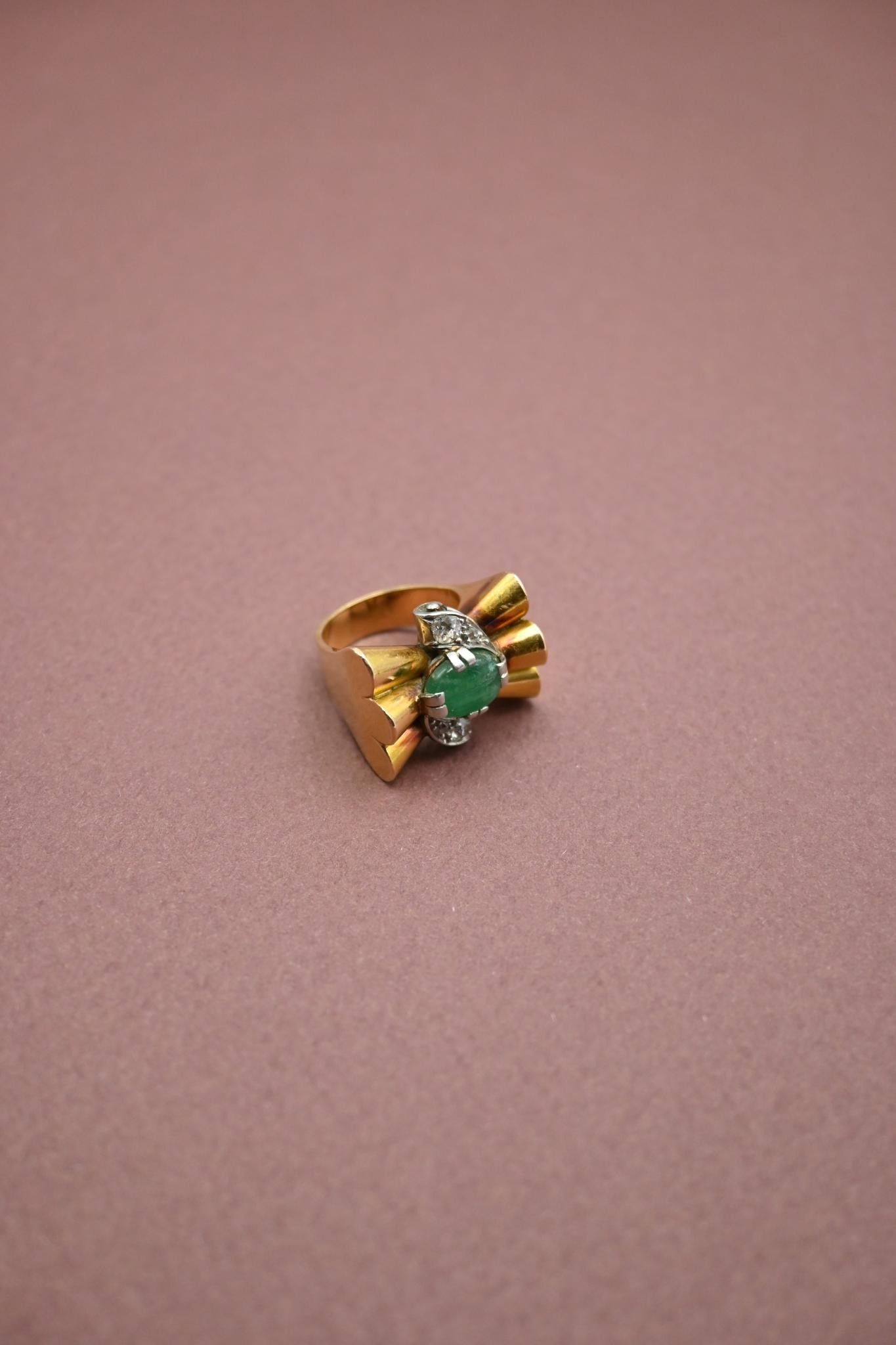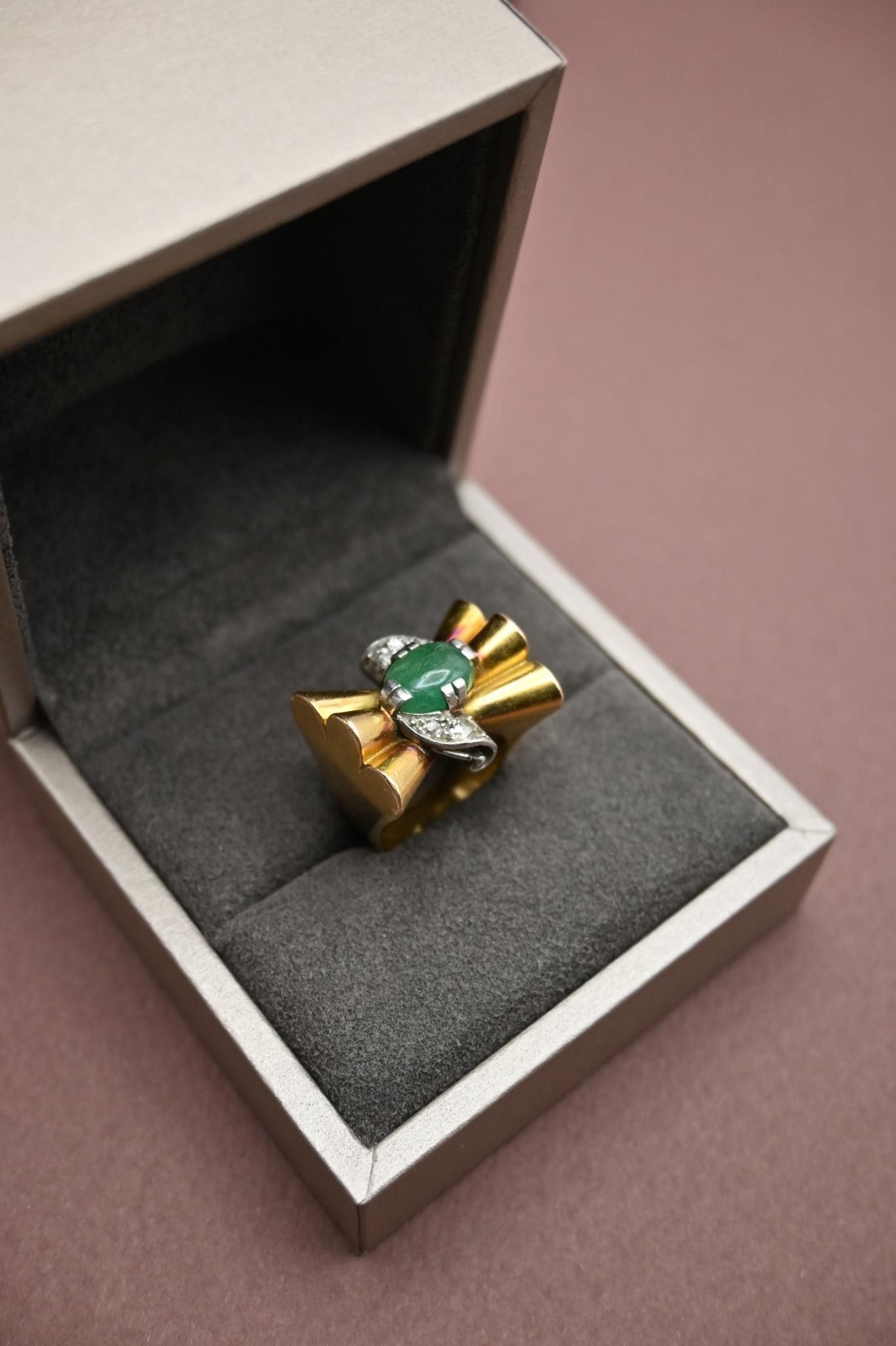 Tank ring in 18K 750k gold featuring a knot centred on an emerald cabochon set with old-cut diamonds (set in platinum). Finger size: 51 Gross weight: 16.4 g (slight crazing to the stone)