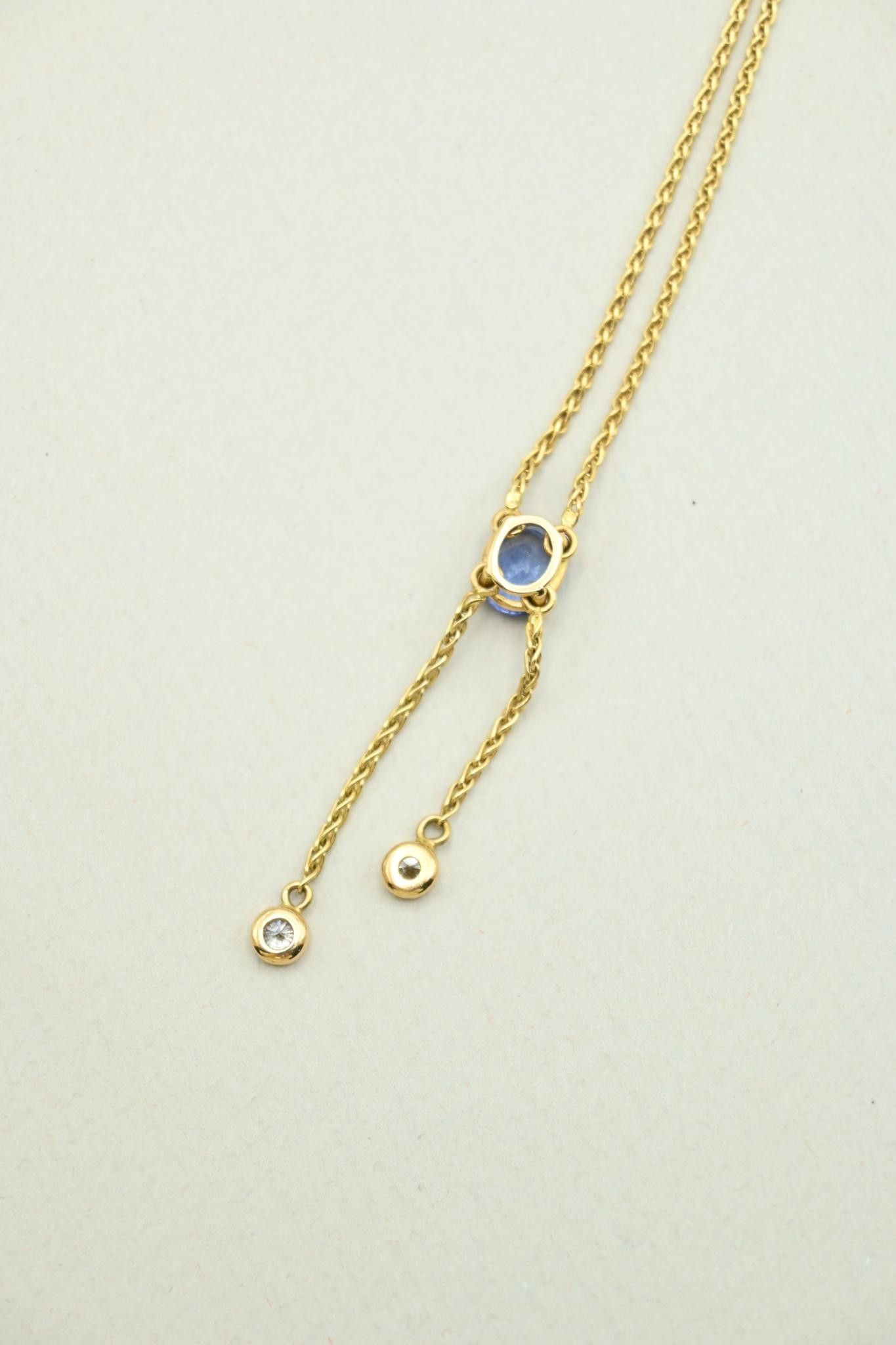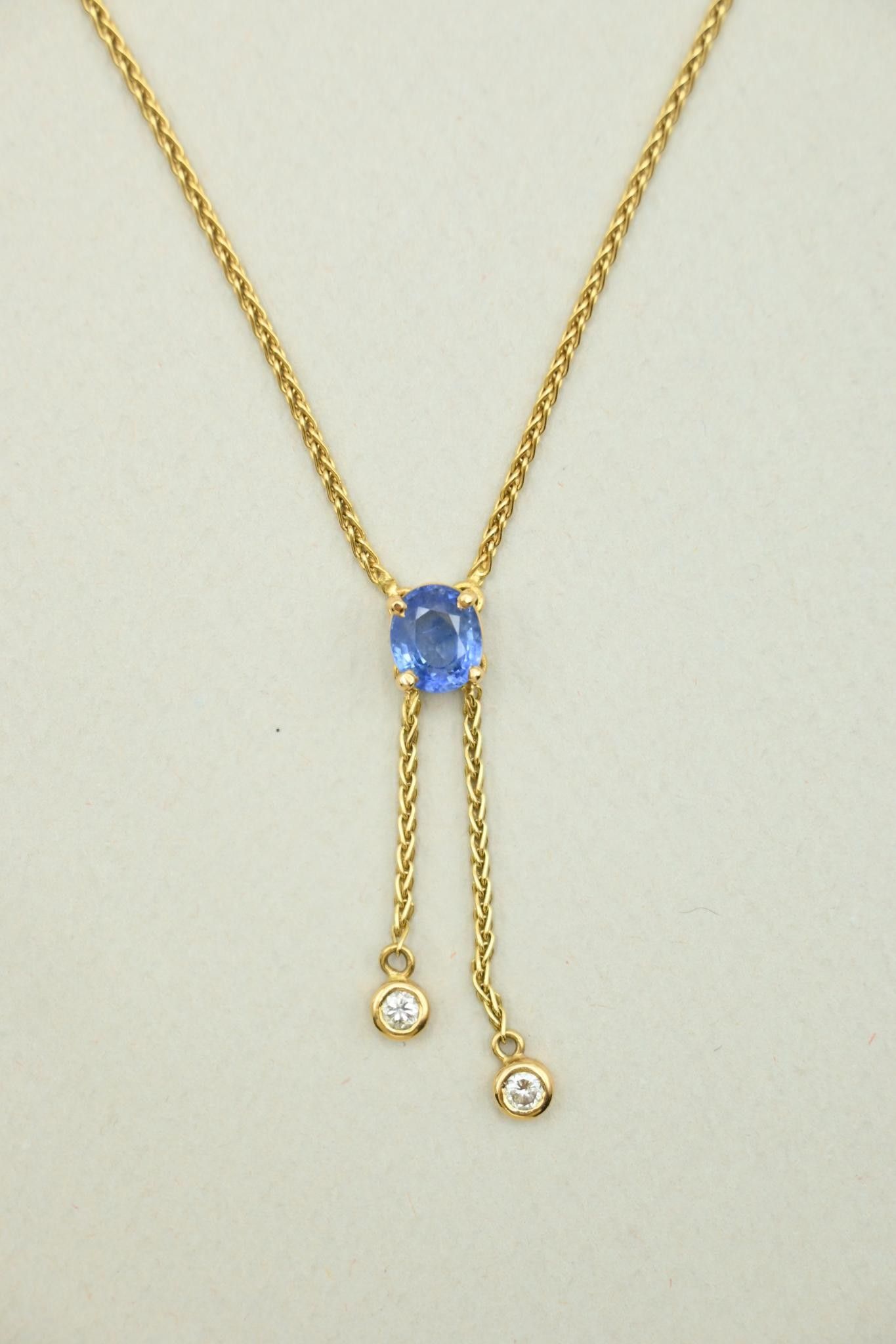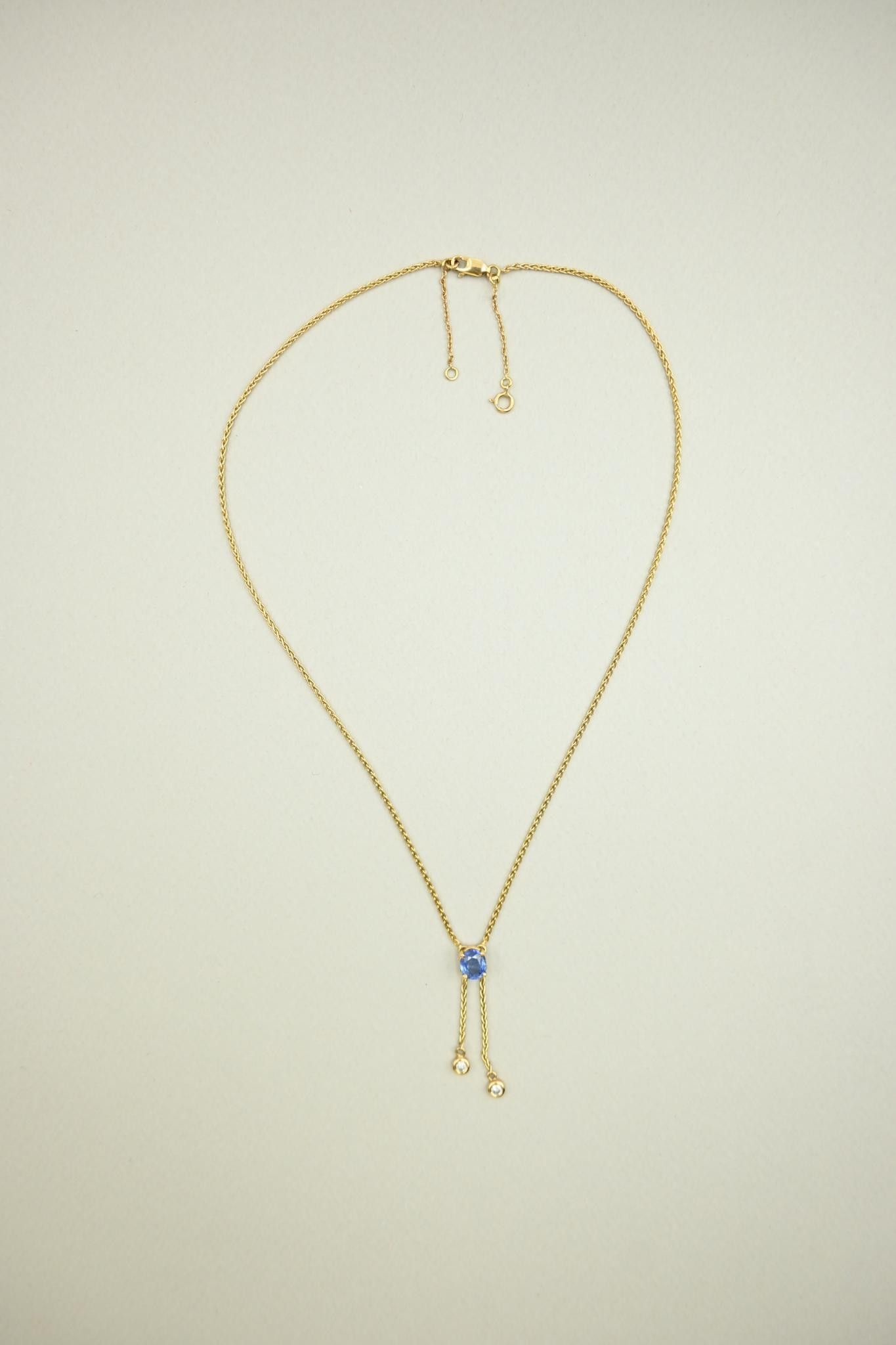 Negligee necklace in 18K 750 karat gold with a motif adorned with an oval Ceylon sapphire and double pendants set with 0.05 carat modern-cut diamonds.