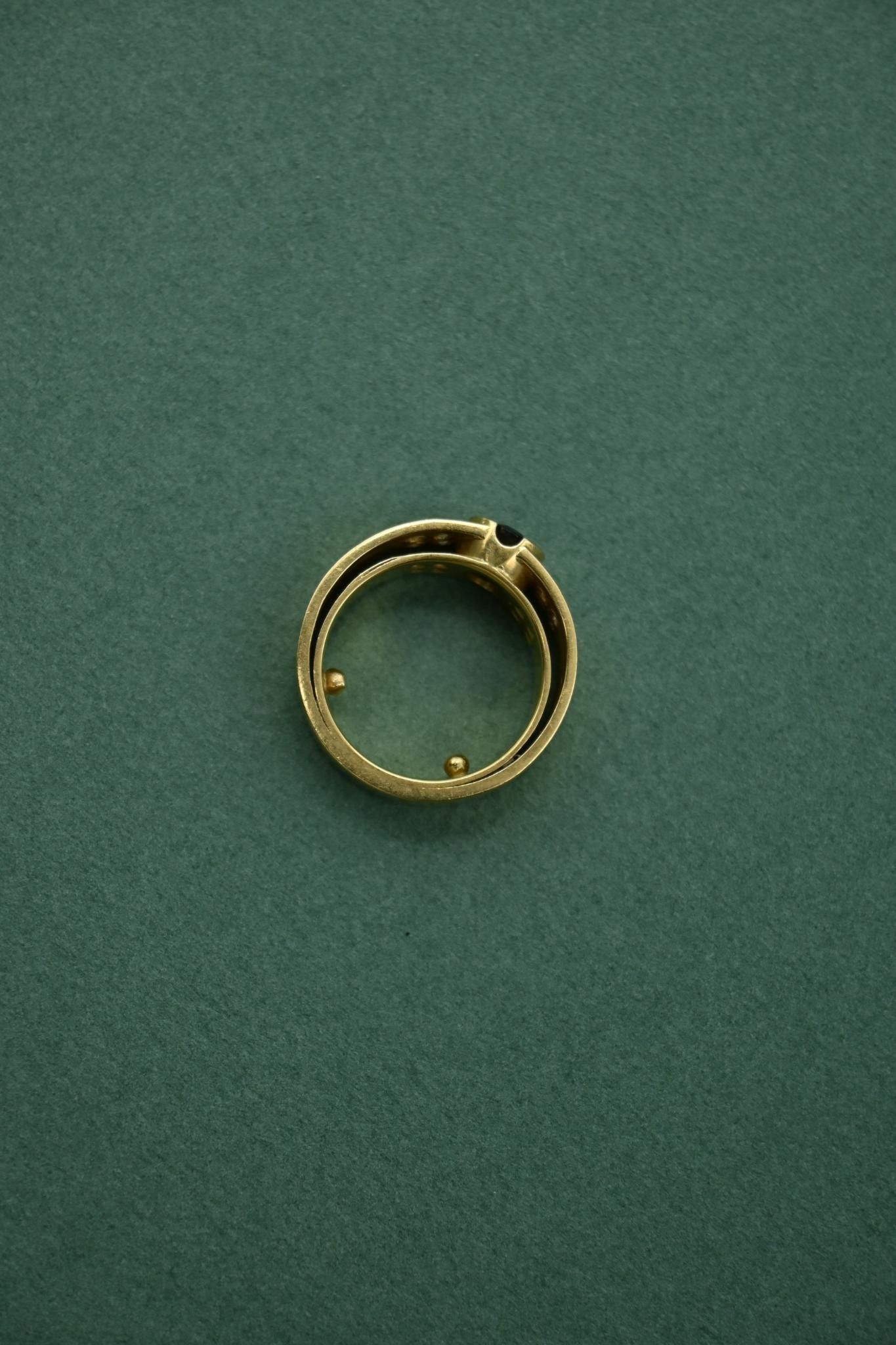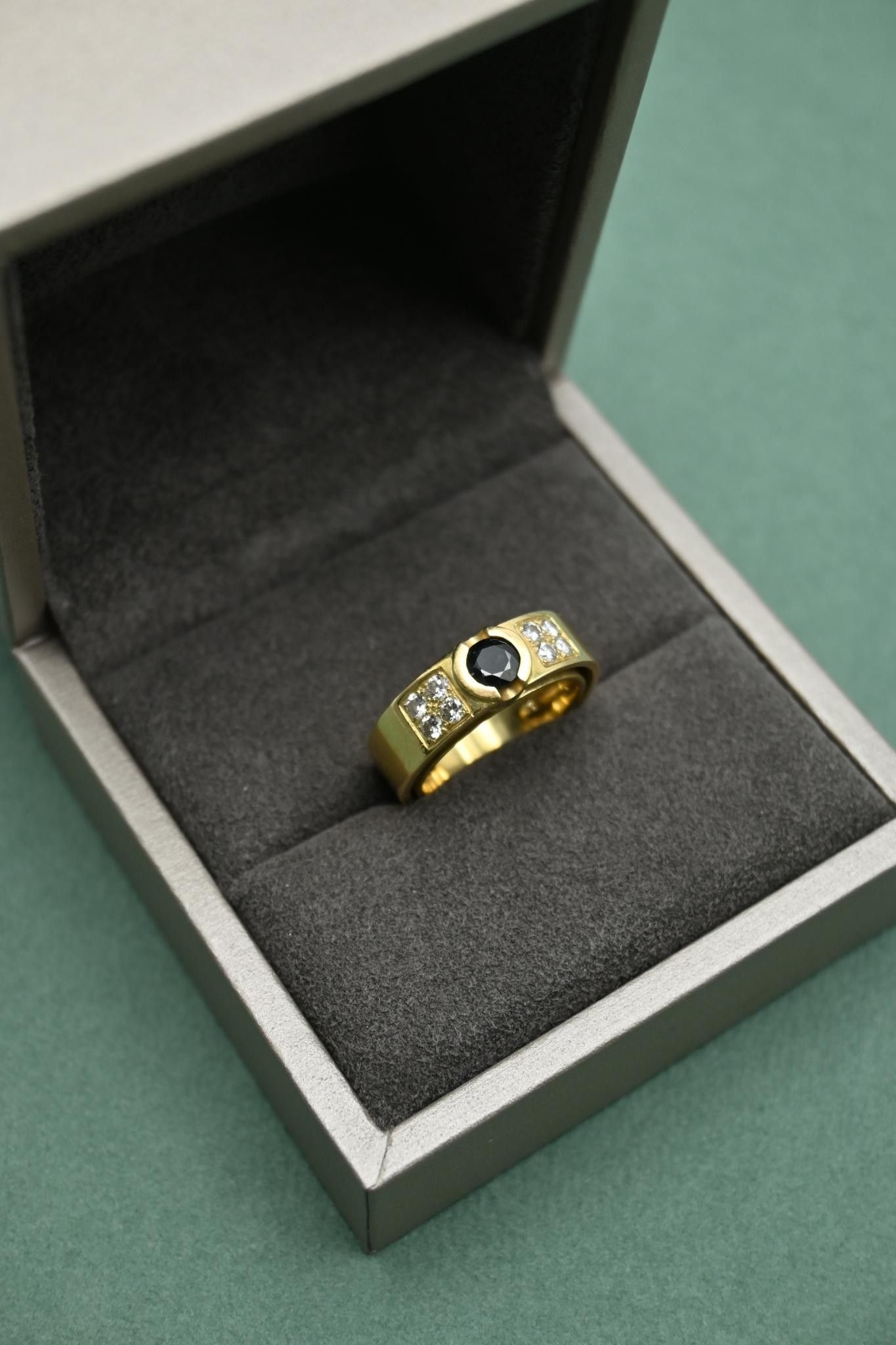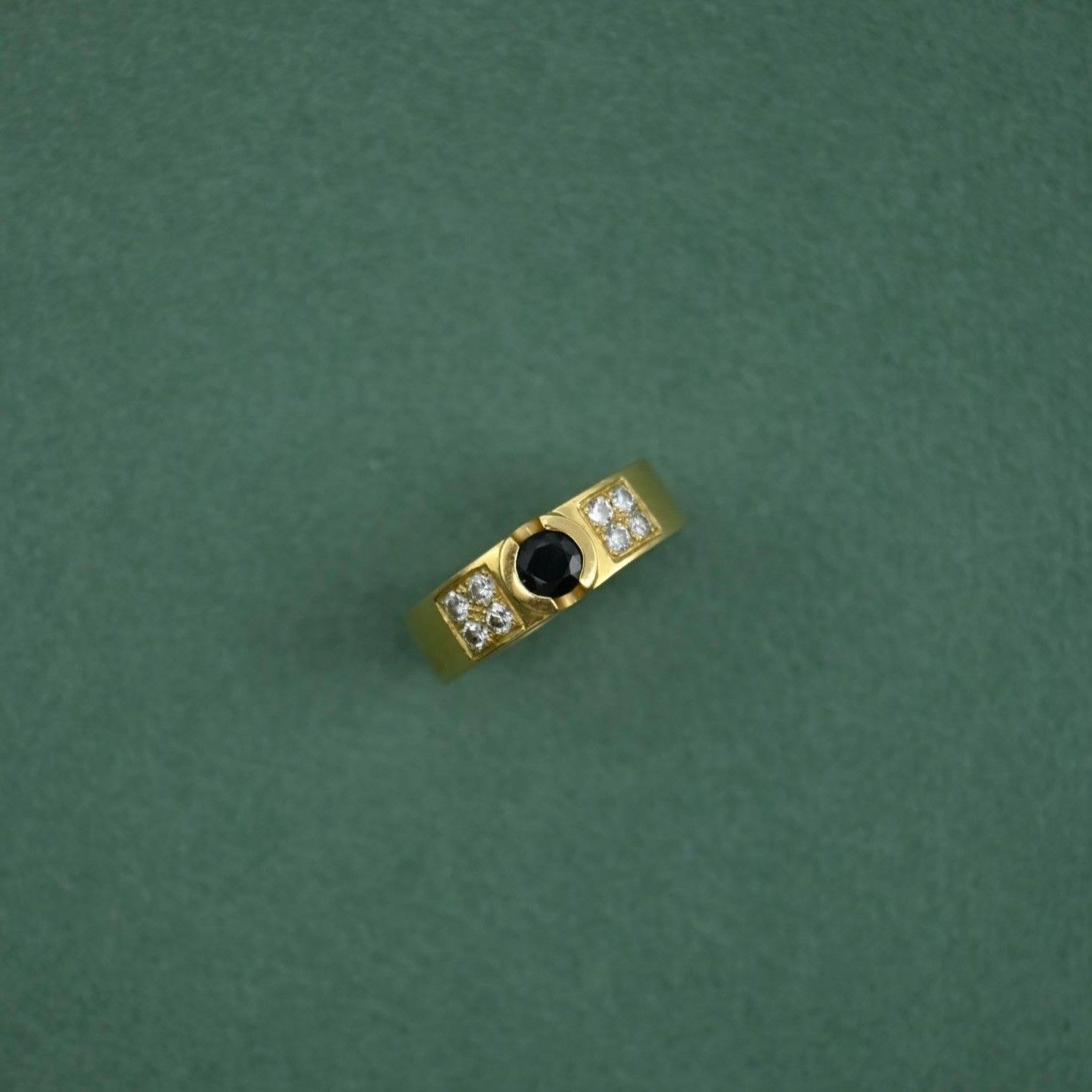Large 18K gold ring centred on a round sapphire with eight small diamonds. Tightening ring inside with retaining balls.