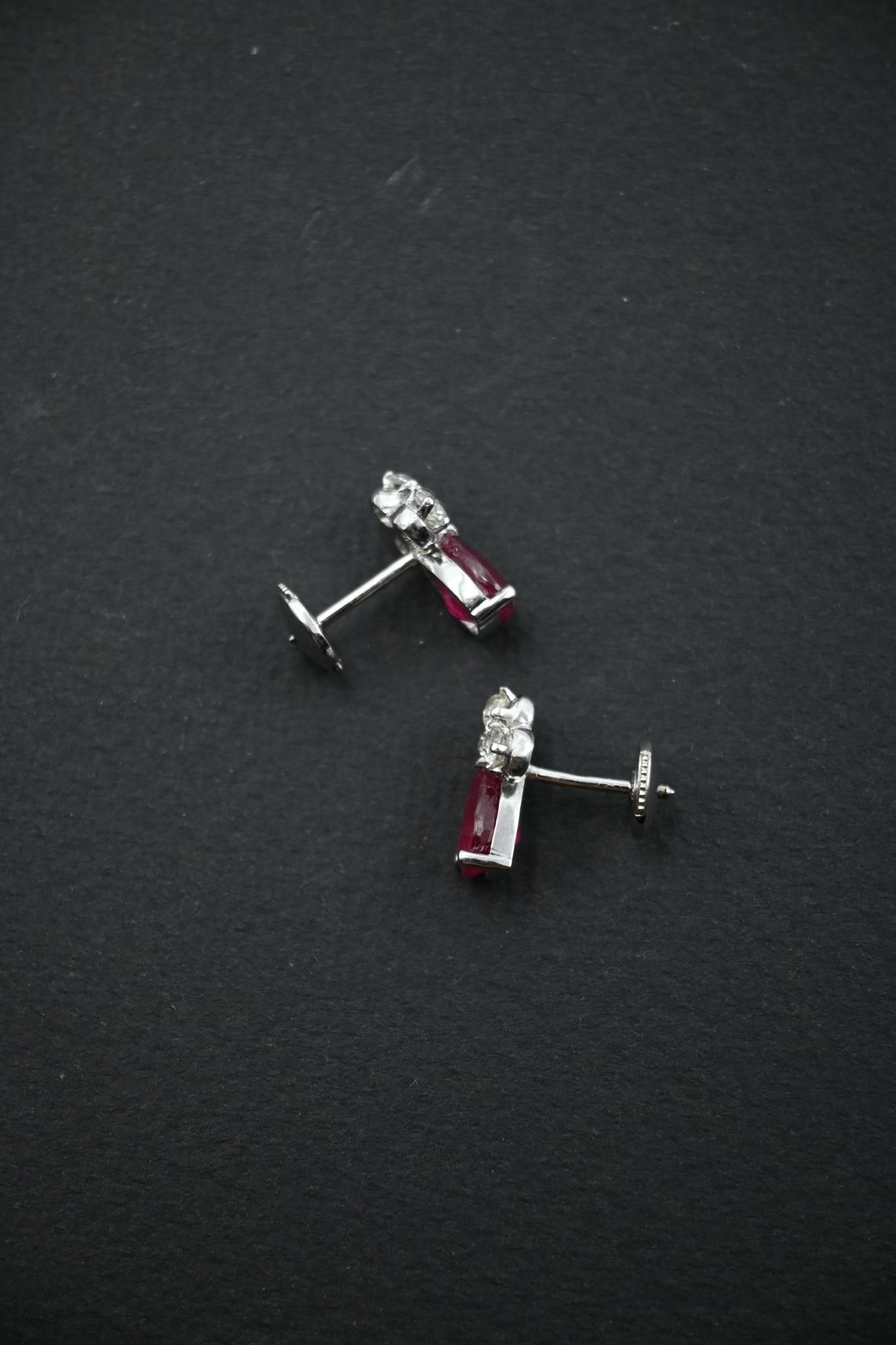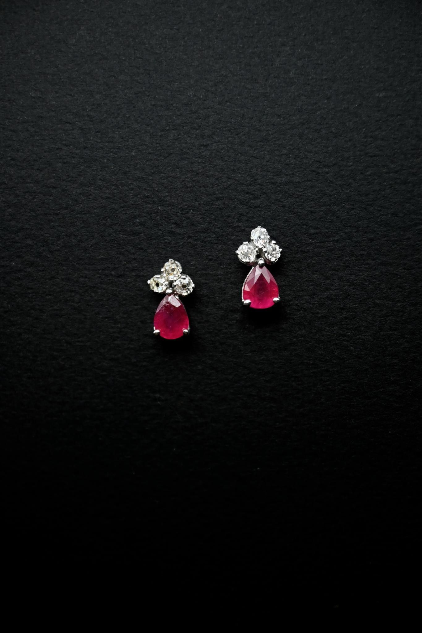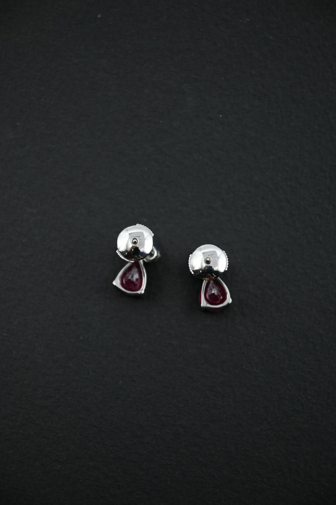 Pair of 18K 750 thousandths gold earrings each set with a drop of glansfield ruby topped with three old-cut diamonds weighing approximately 0.15 carat each.