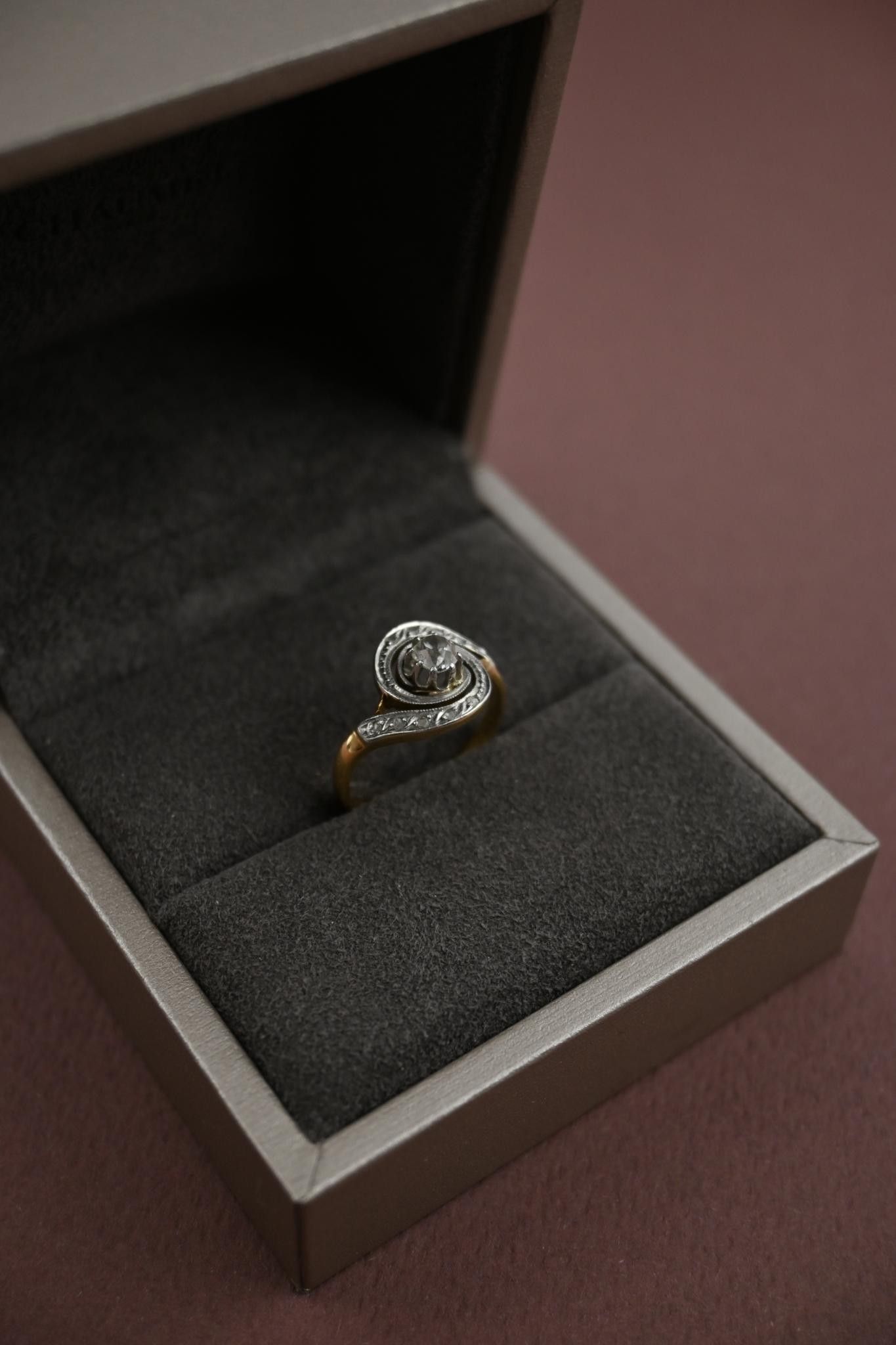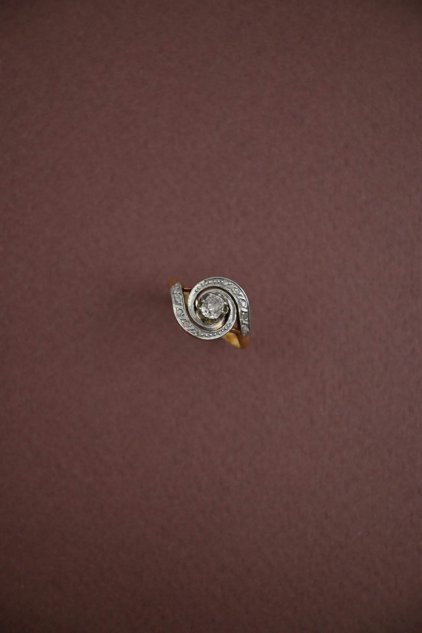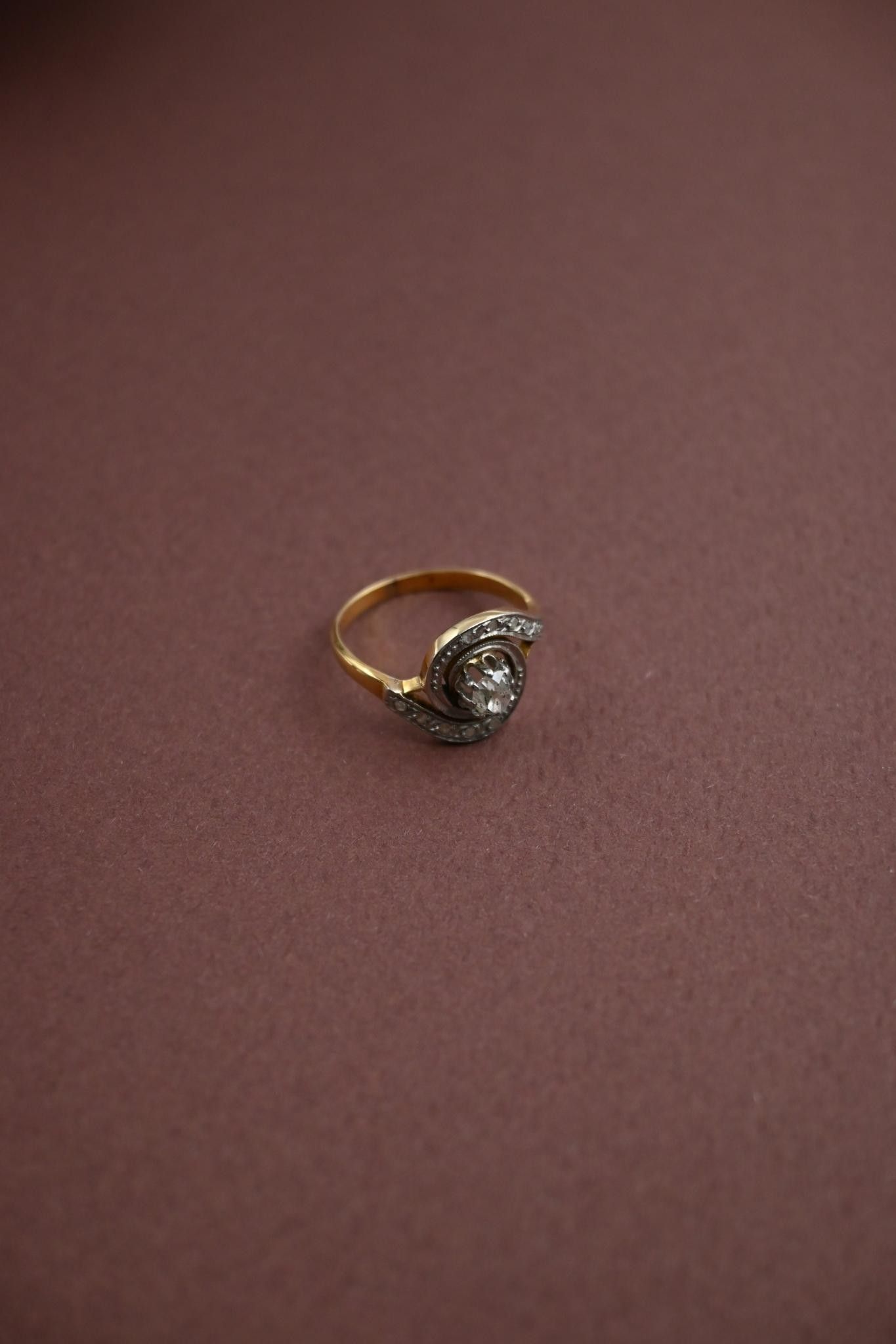 Tourbillon ring in 18K gold 750 thousandths, old-cut diamond approx. 0.25 carat and small rose-cut diamonds.