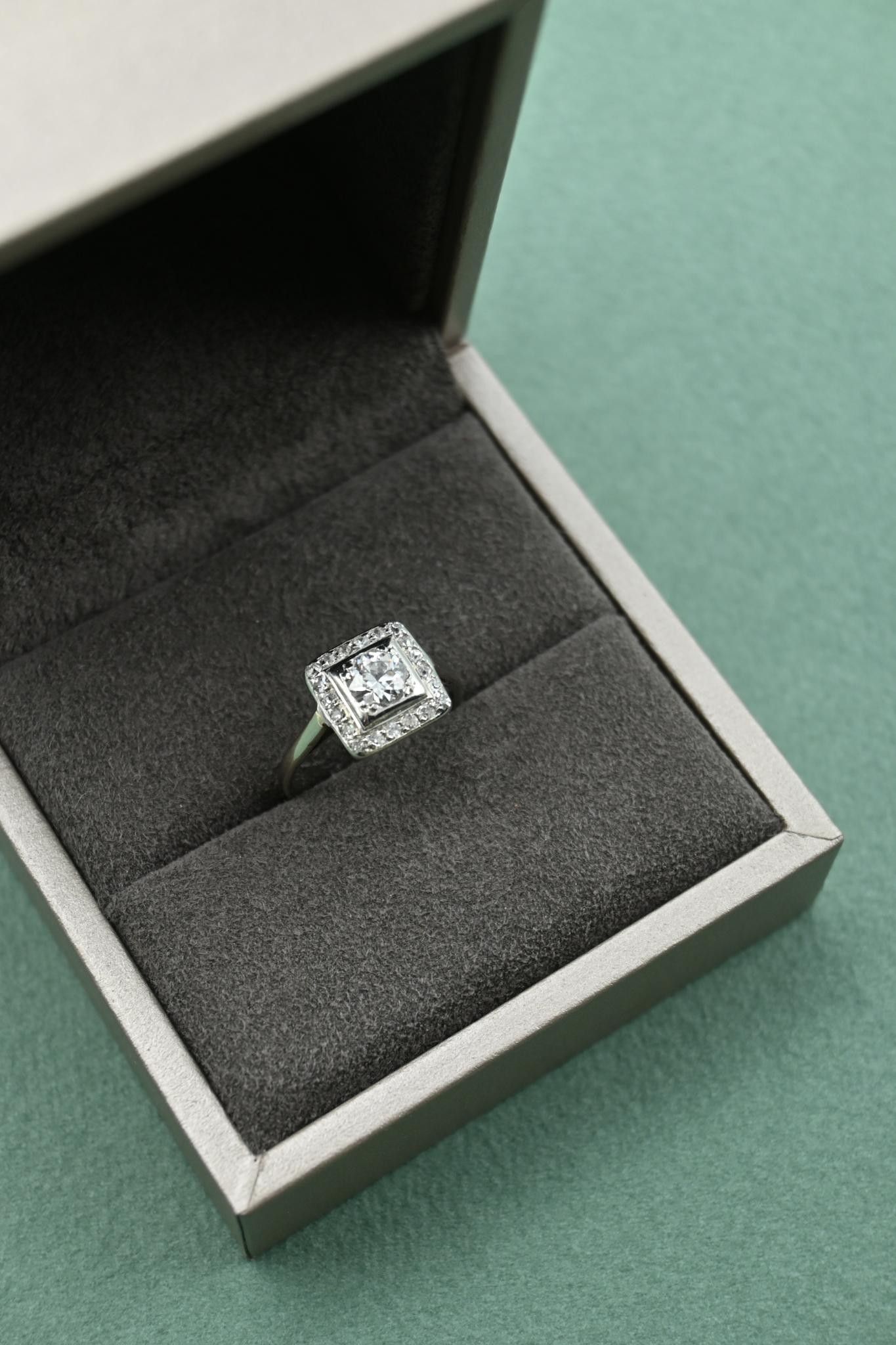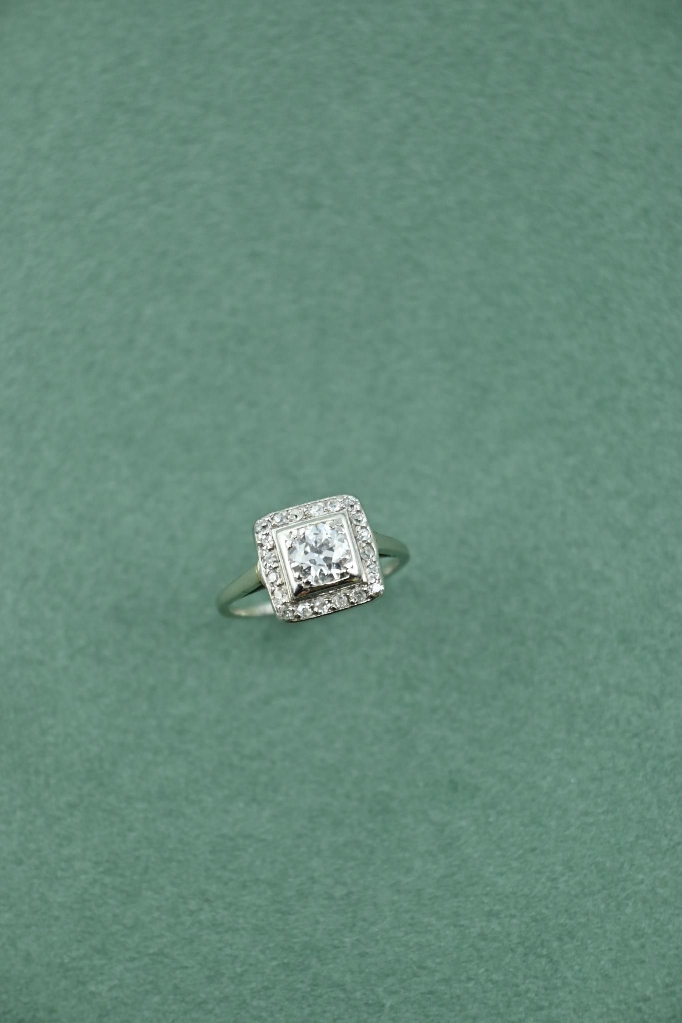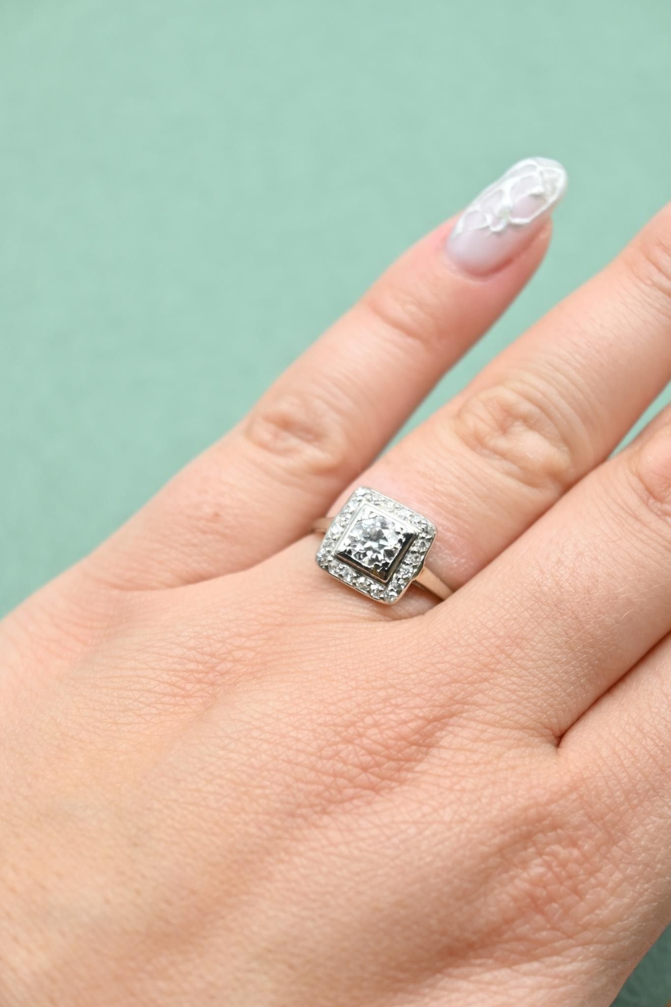 18K white gold ring centred on an old-cut diamond weighing approximately 0.60 carat on a square plate paved with small diamonds.