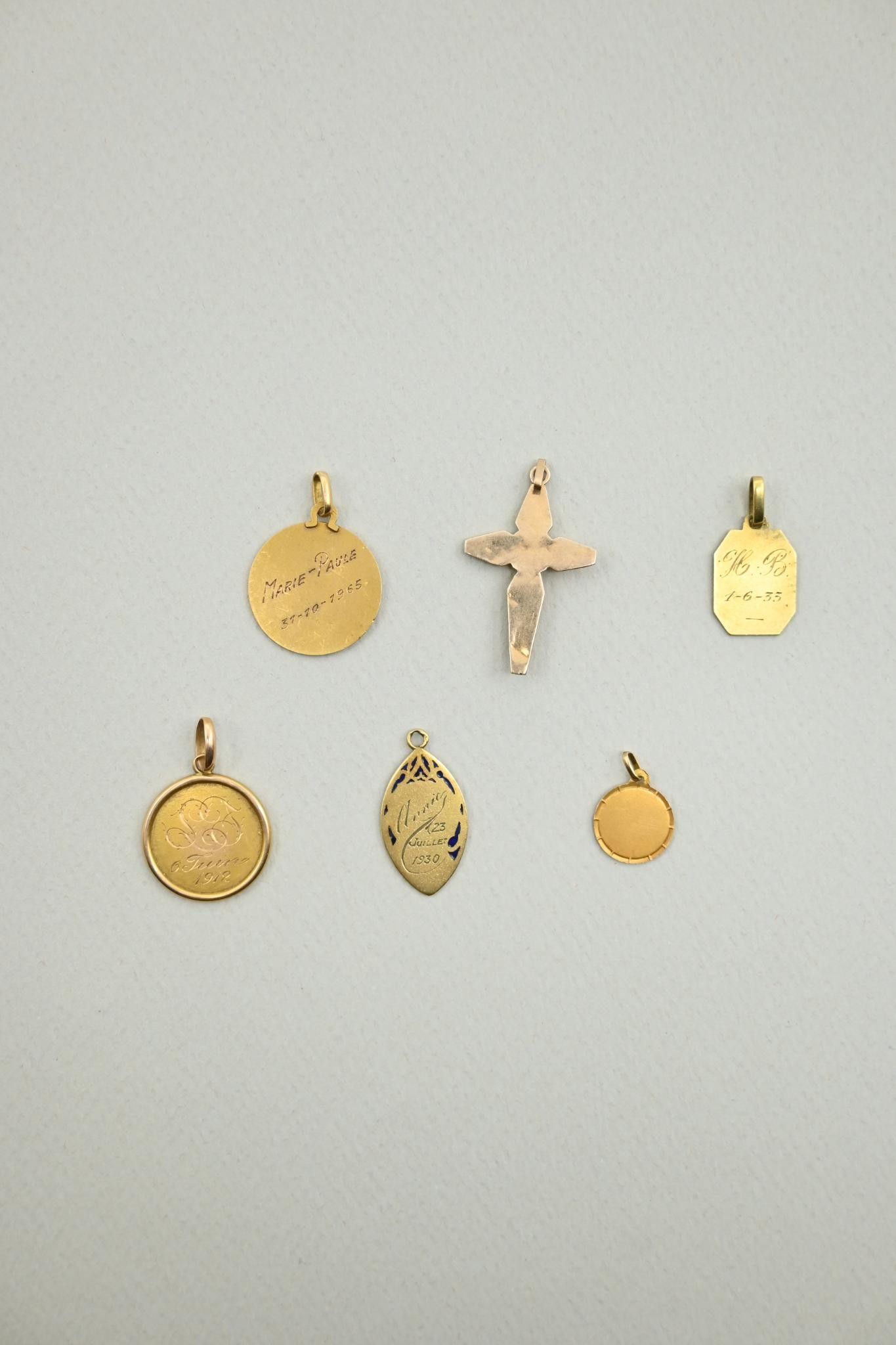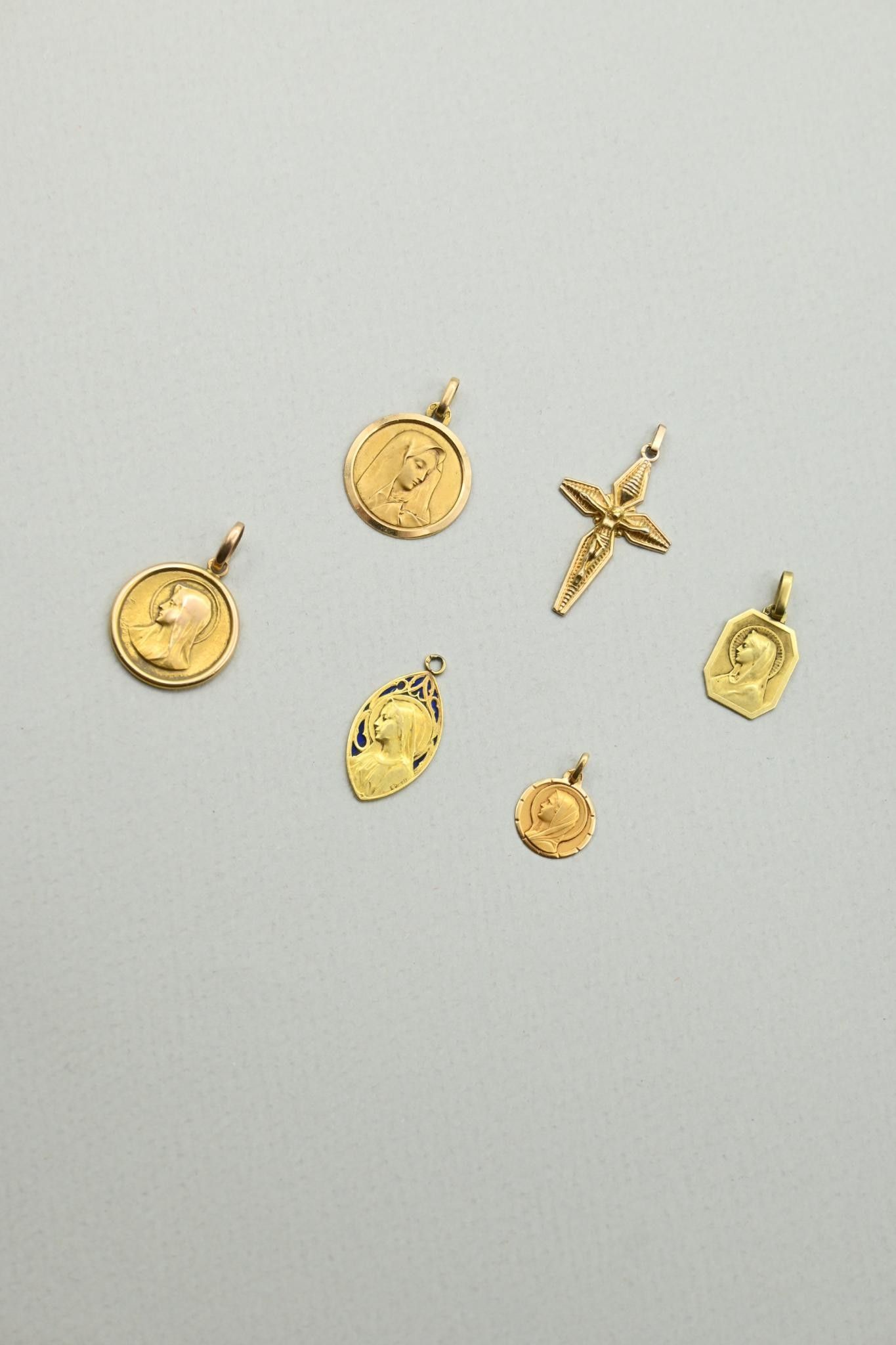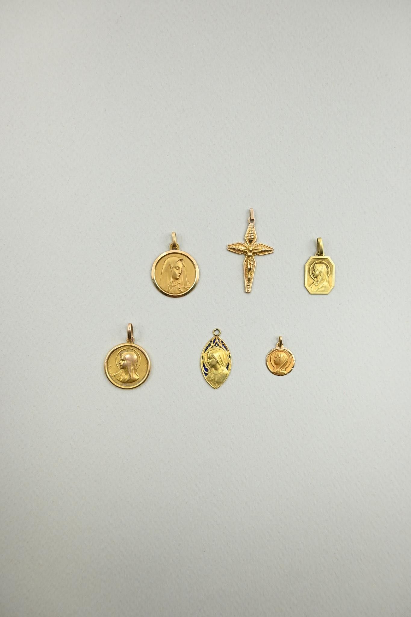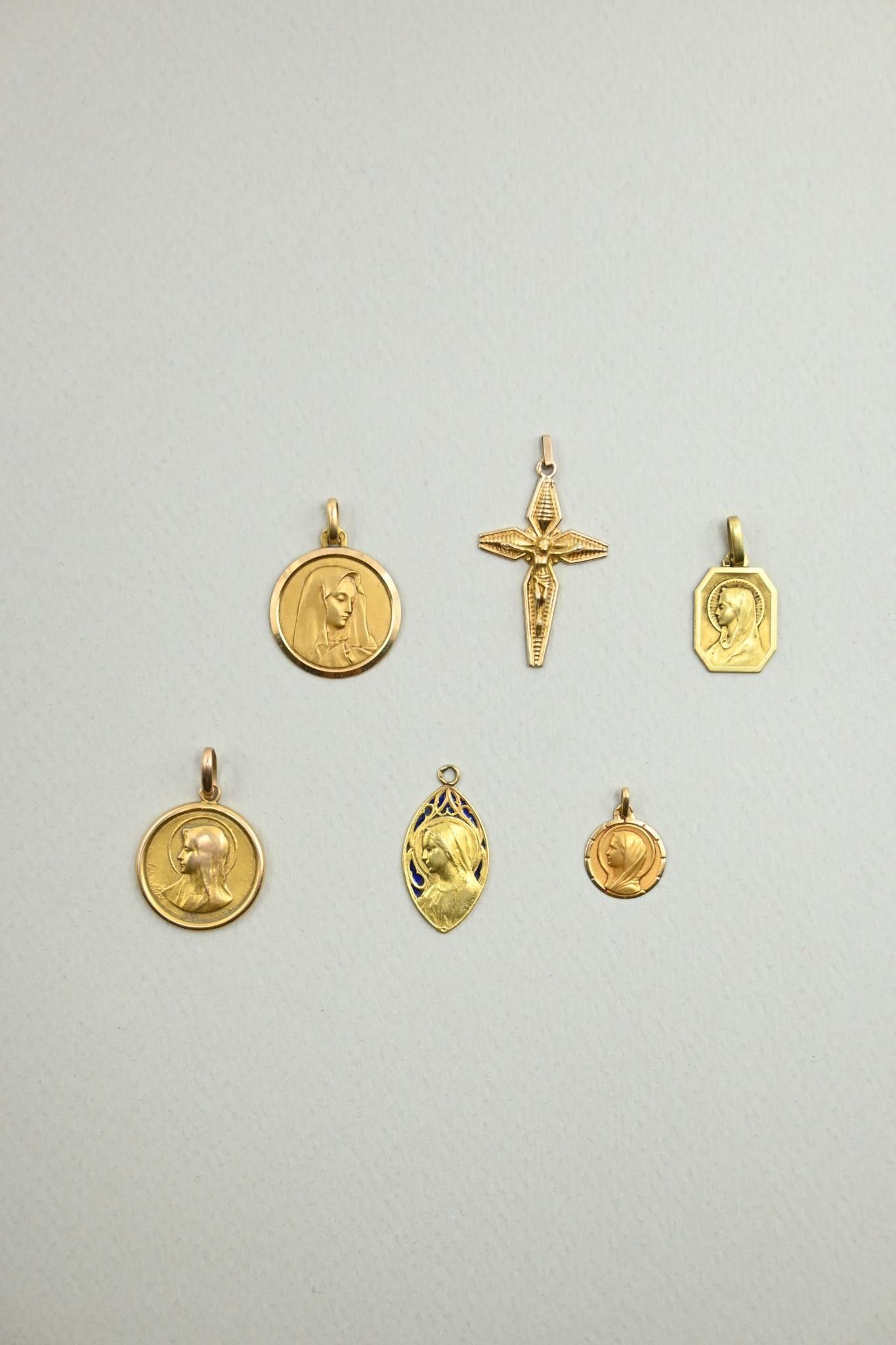 Religious set in 18K 750 thousandths gold comprising five medals and a cross (engraved)