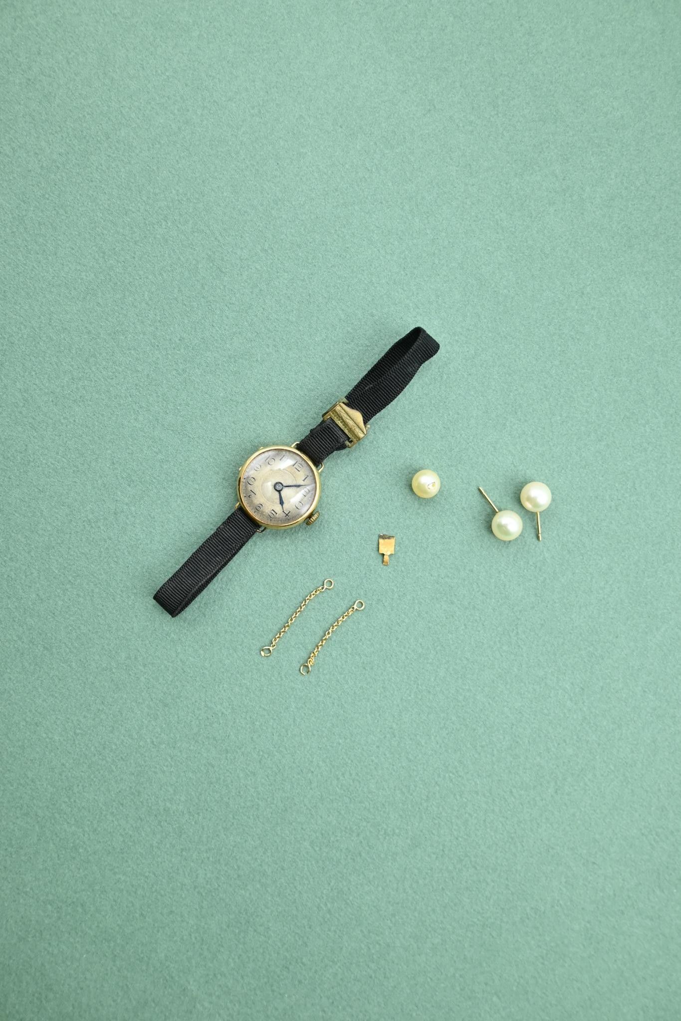 Lot of 18K 750 thousandths gold jewellery comprising a lady's watch (black fabric strap), two earrings with cultured pearls (missing pushers), three pieces of gold and a pearl.
