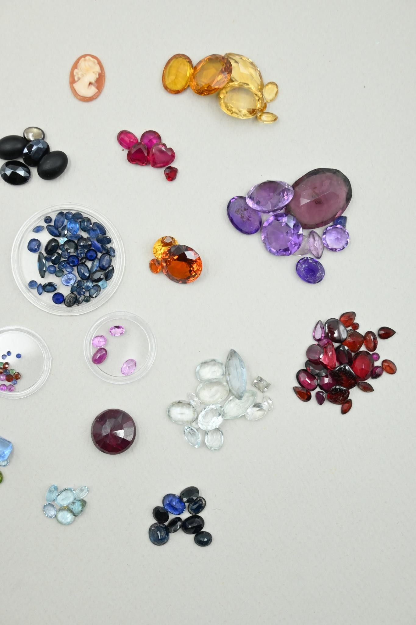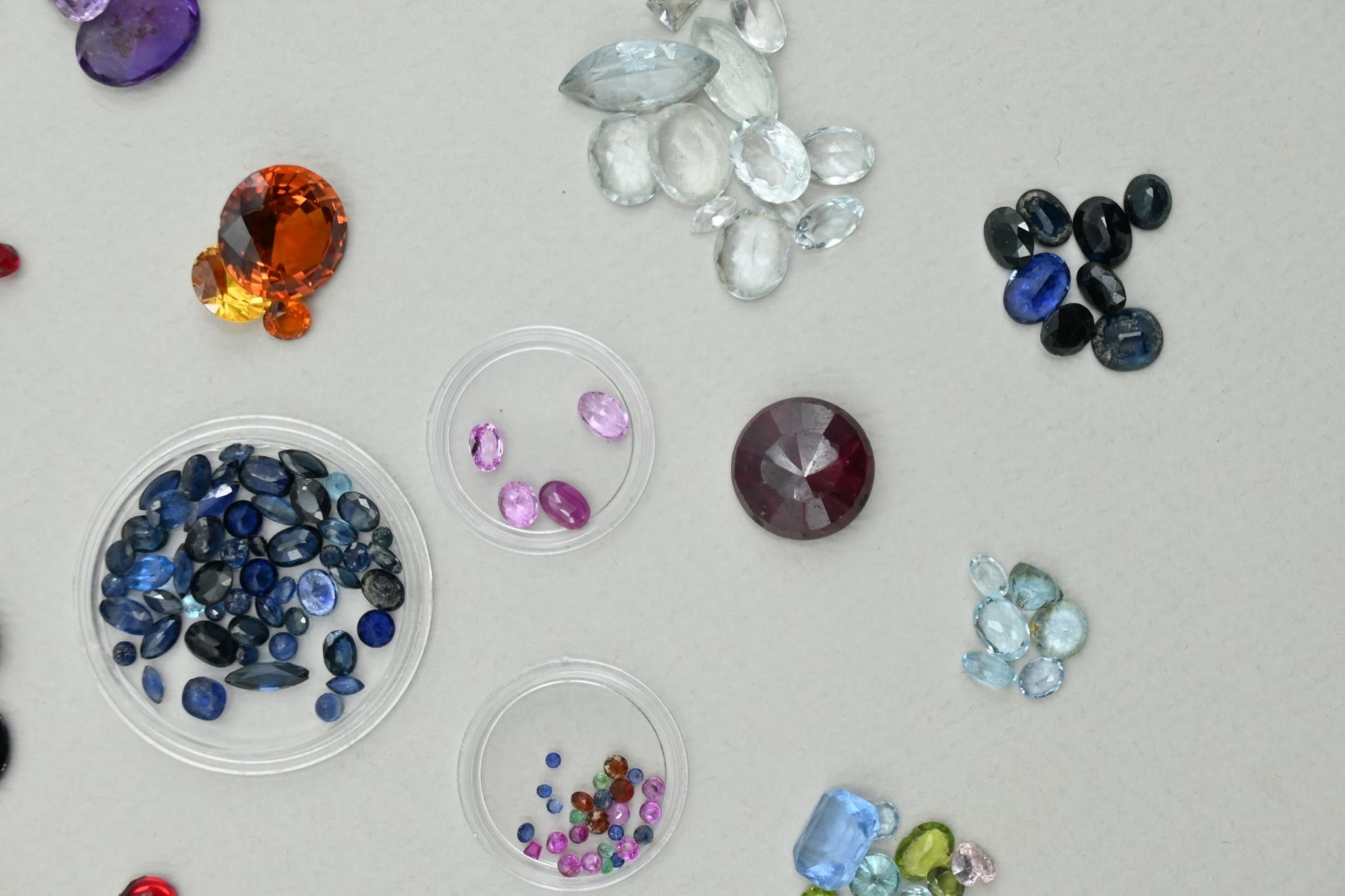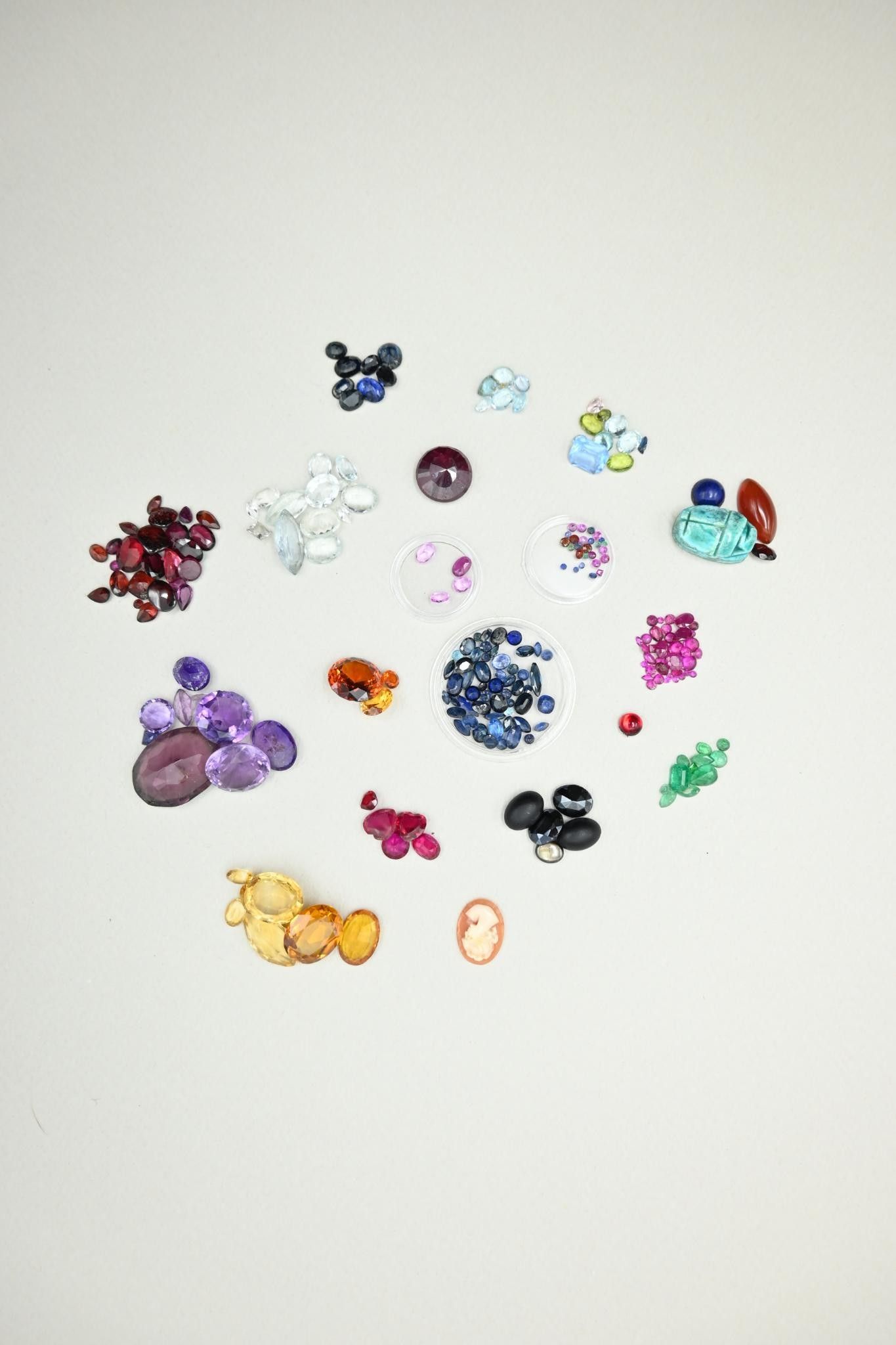 Collection of gemstones and precious stones on paper (from old jewellery), some stones are synthetic (various states).