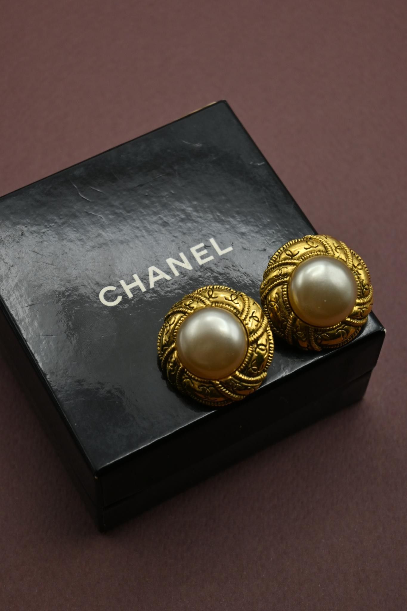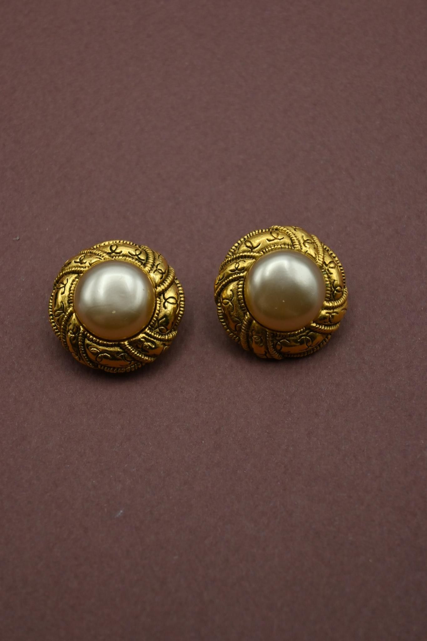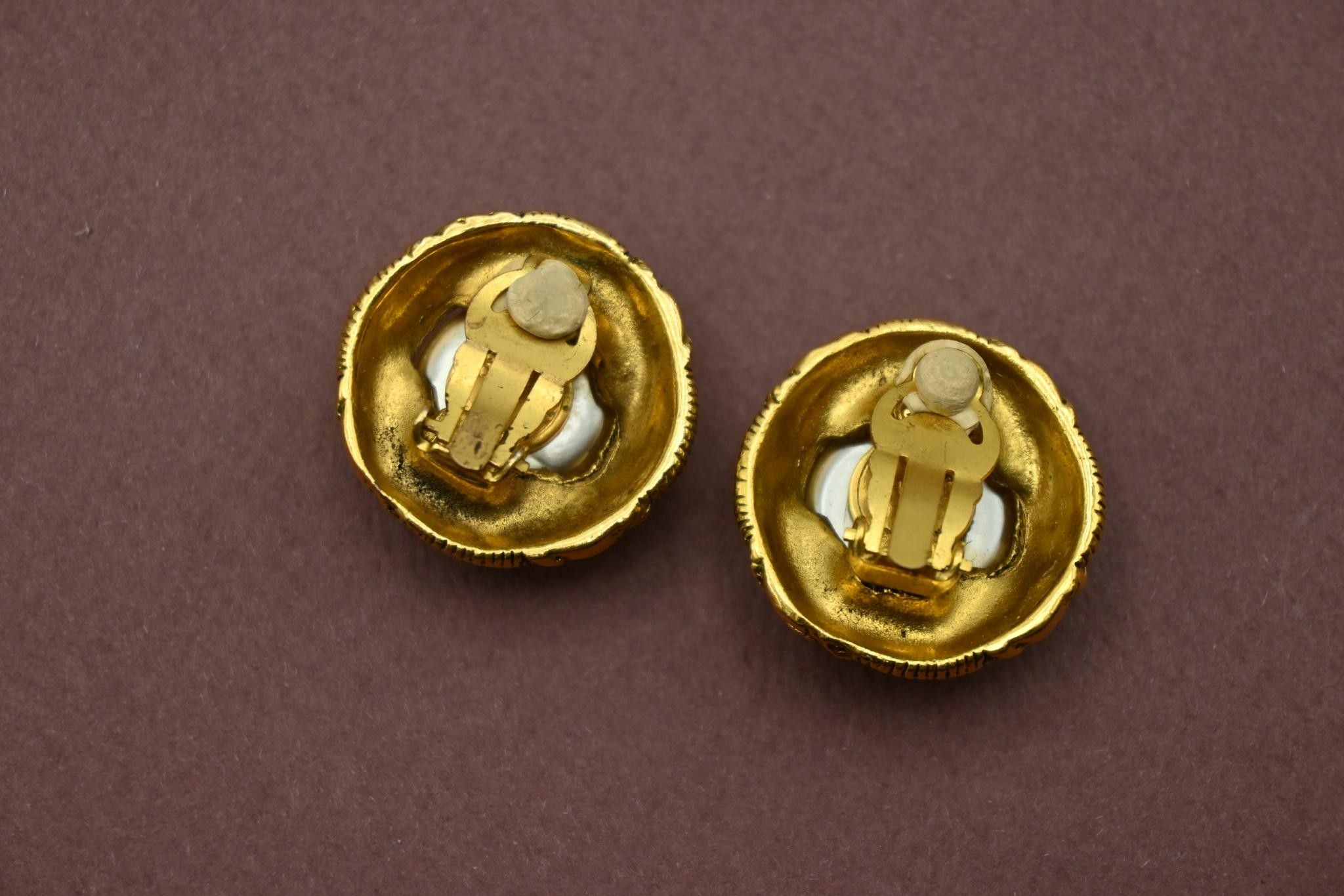 Pair of round ear clips in gilded metal centred with a half pearl and logo.