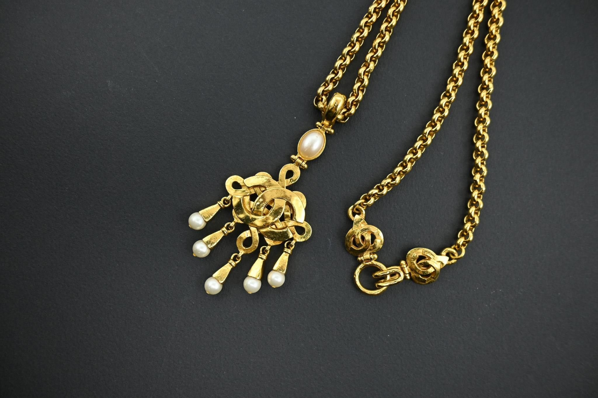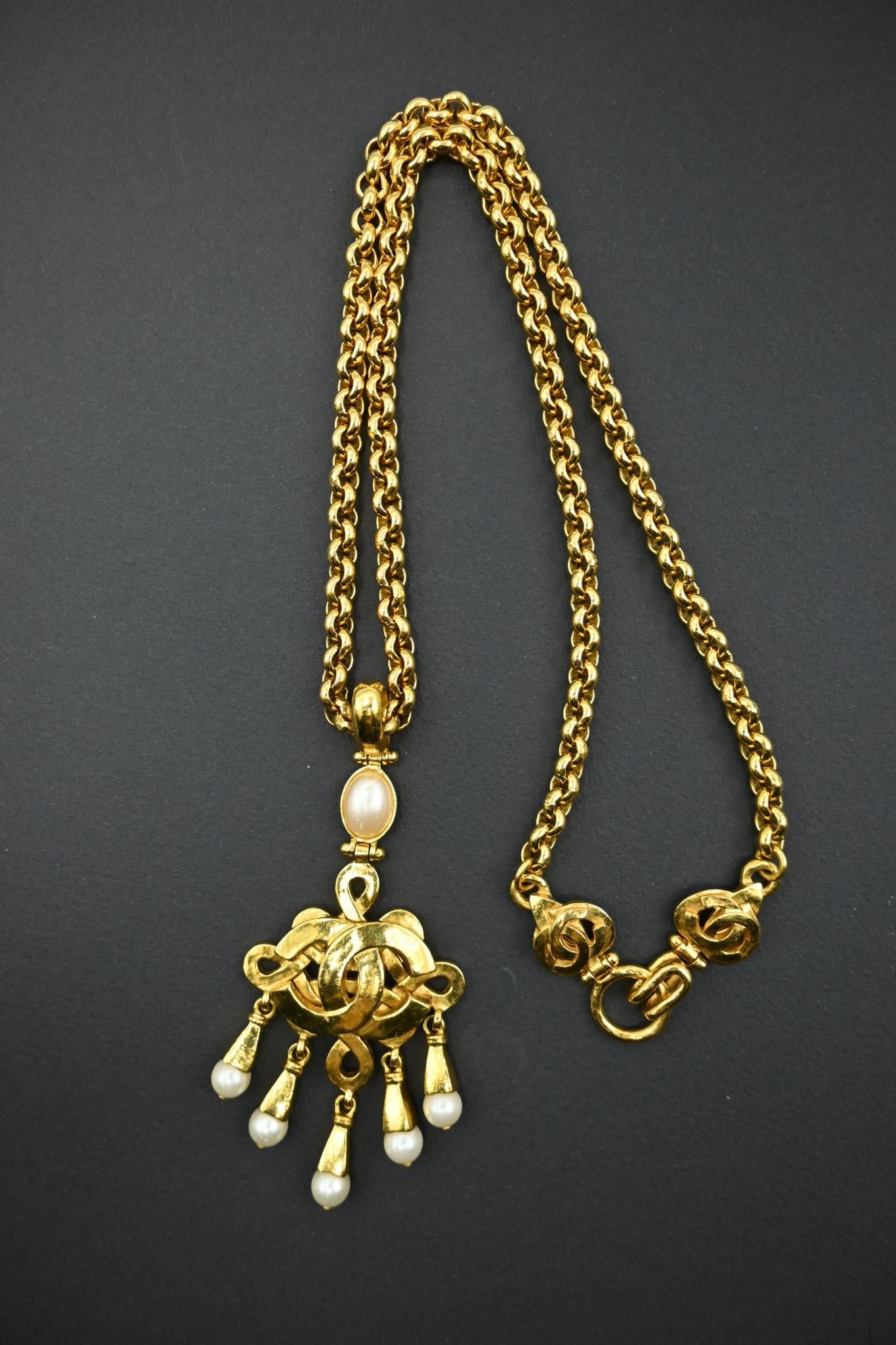 CHANEL Jaseron long necklace in gilt metal holding a logo pe…
