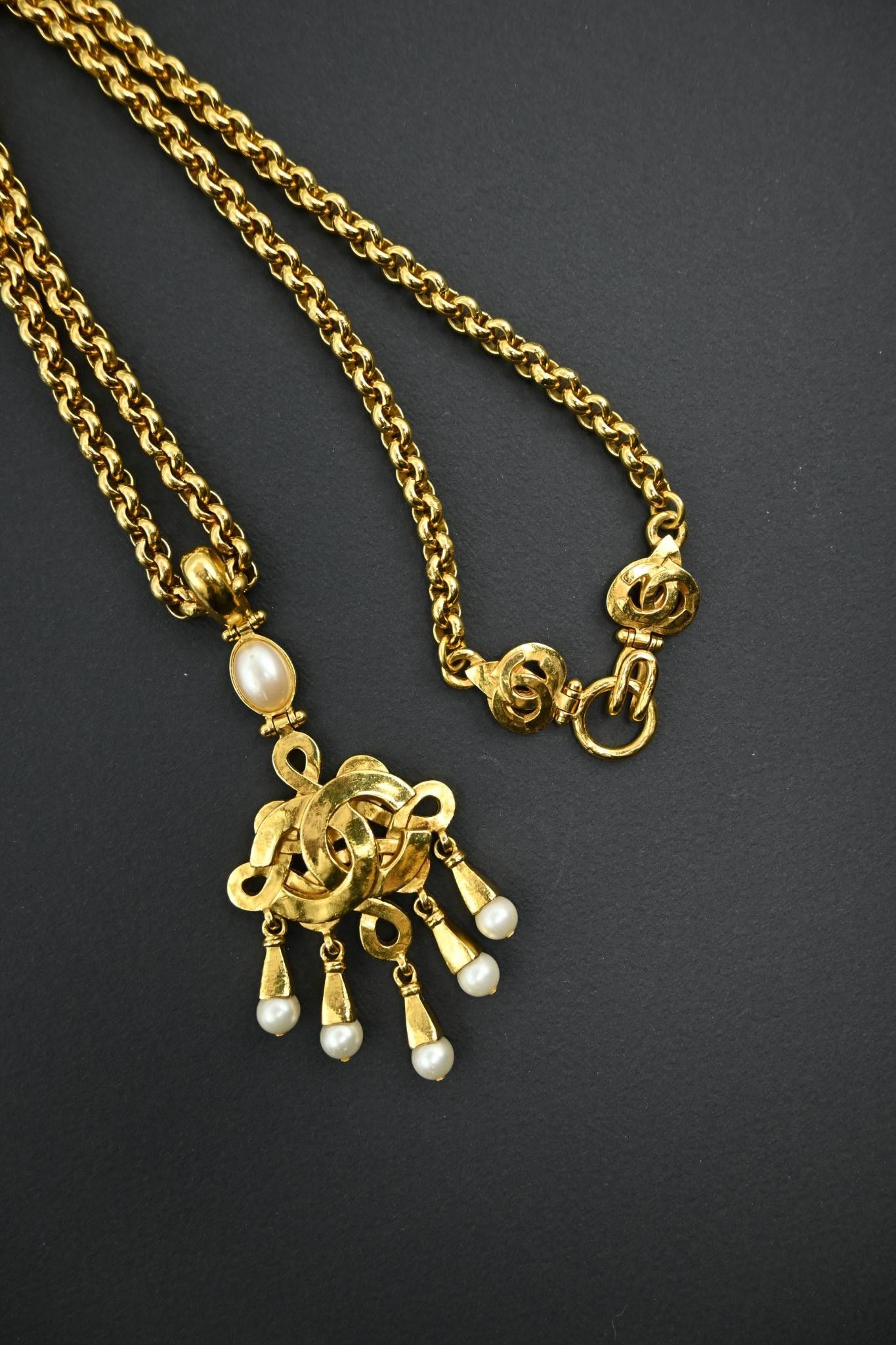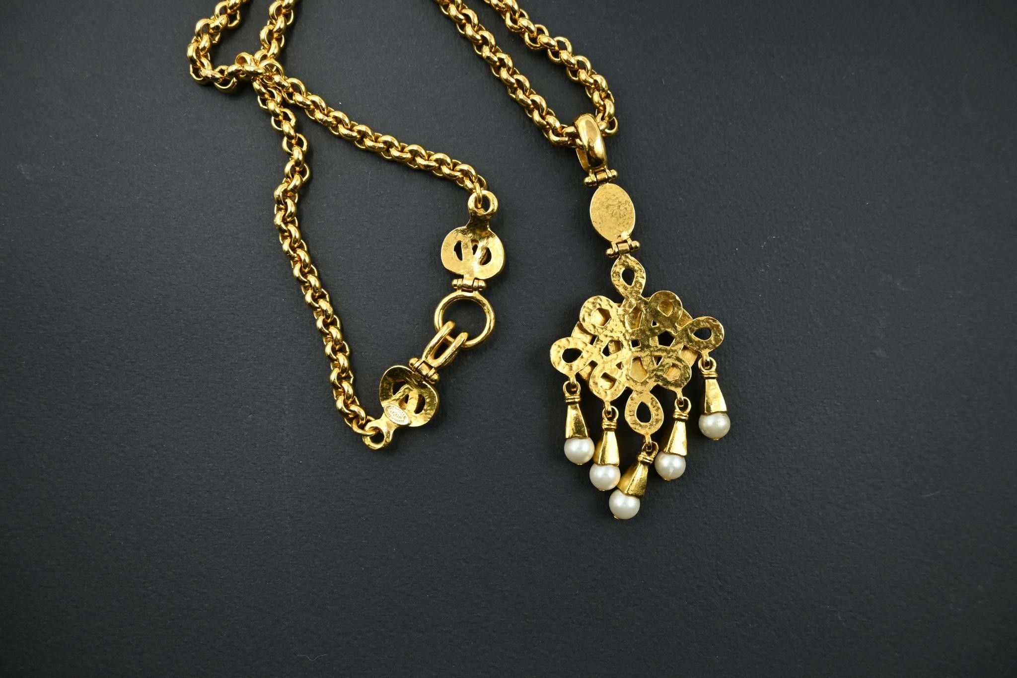 Jaseron long necklace in gilt metal holding a logo pendant with fantasy pearl pendants.
