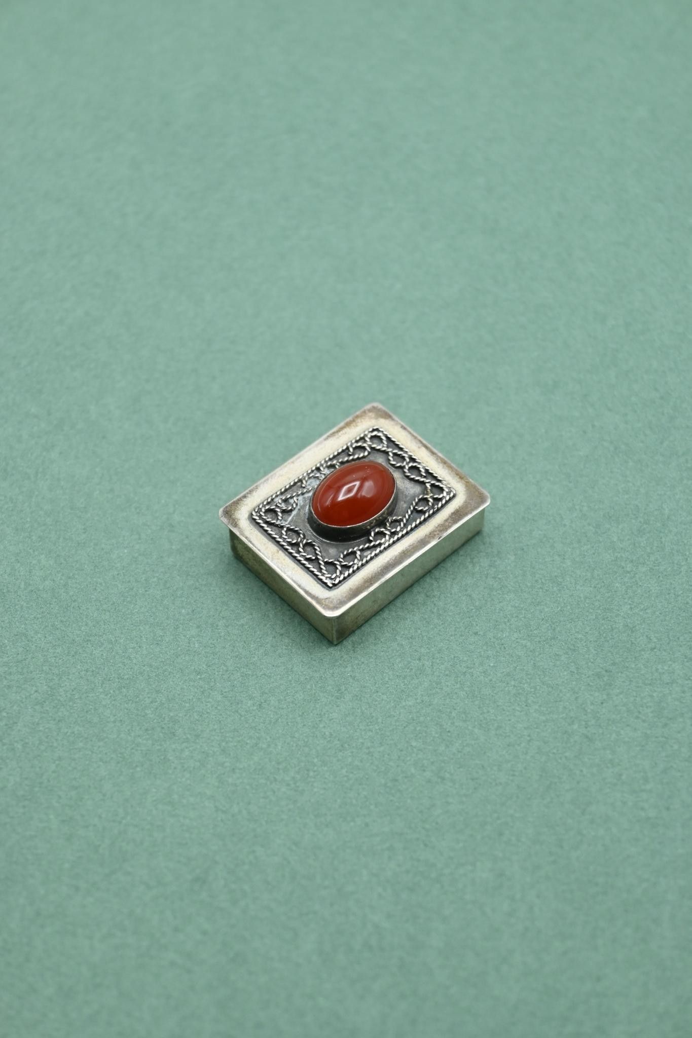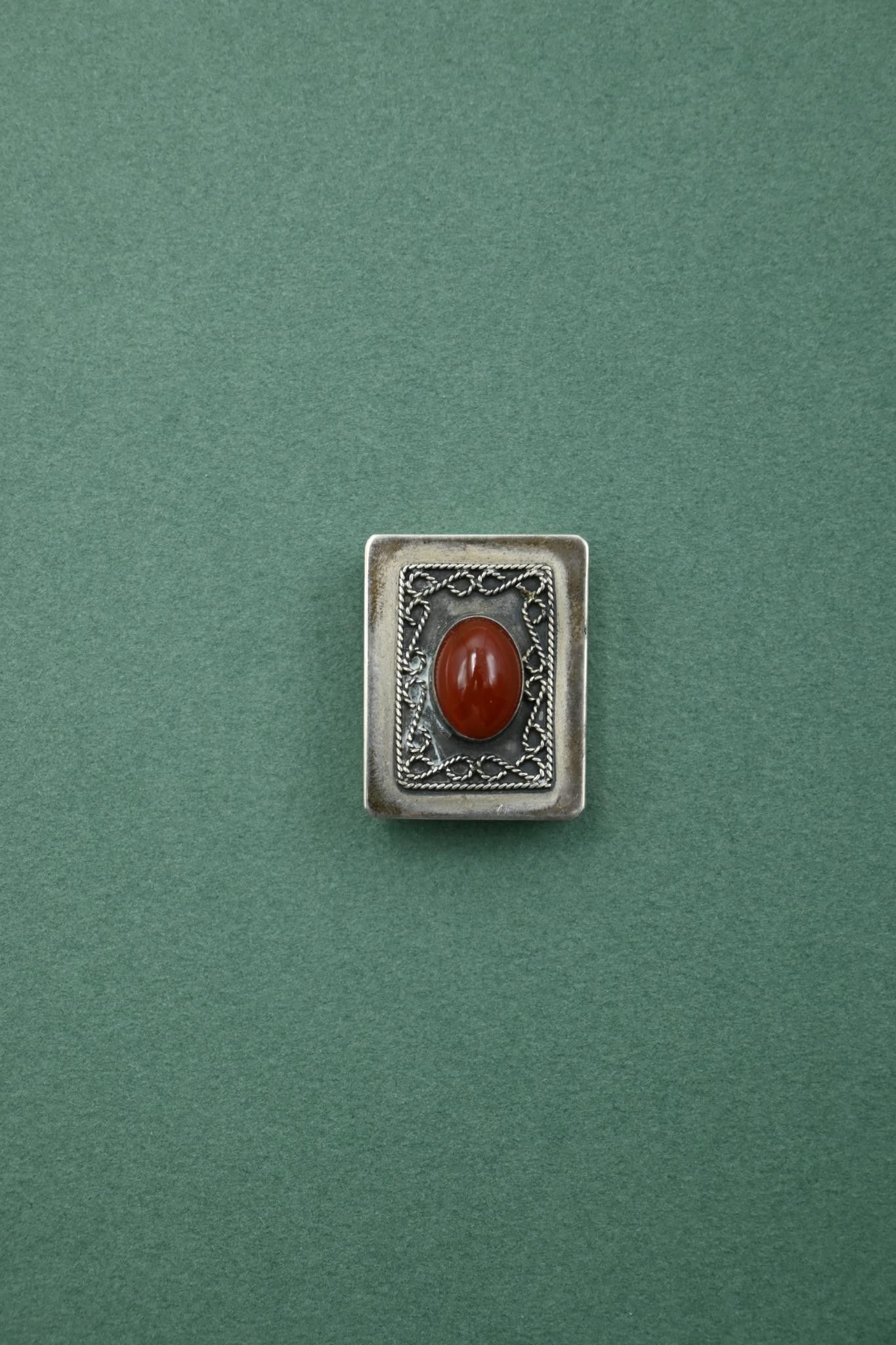 Small rectangular pill box in silver 925 thousandths adorned with a red cabochon stone in the centre of a filigree decoration.