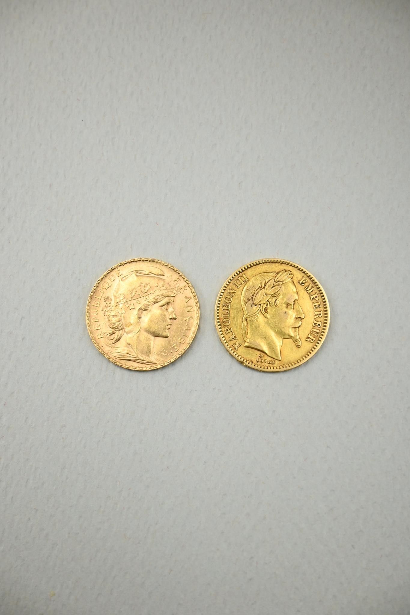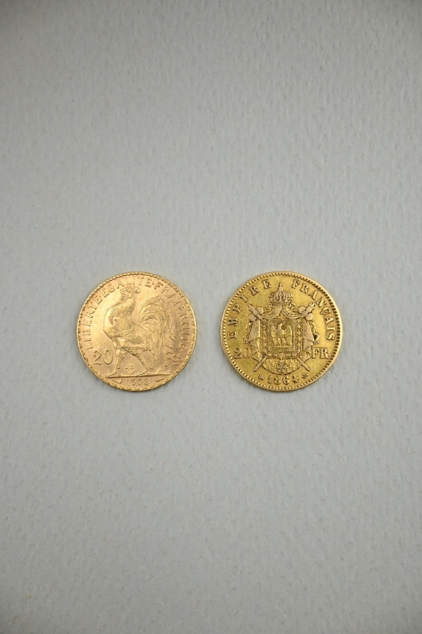 Lot of two 20 franc gold coins, 1864 and 1908.