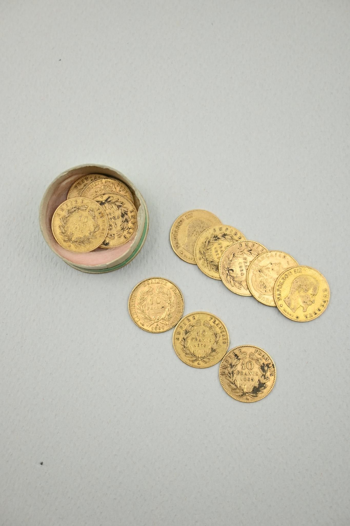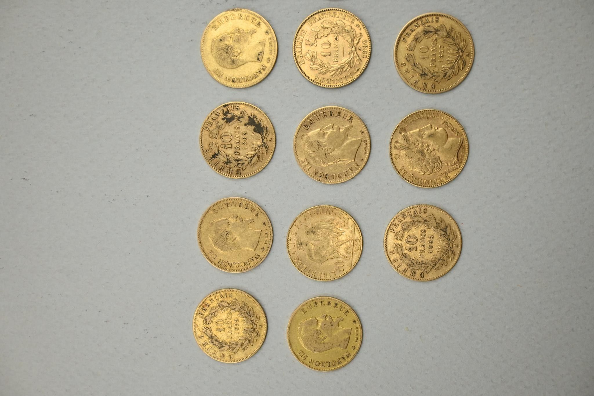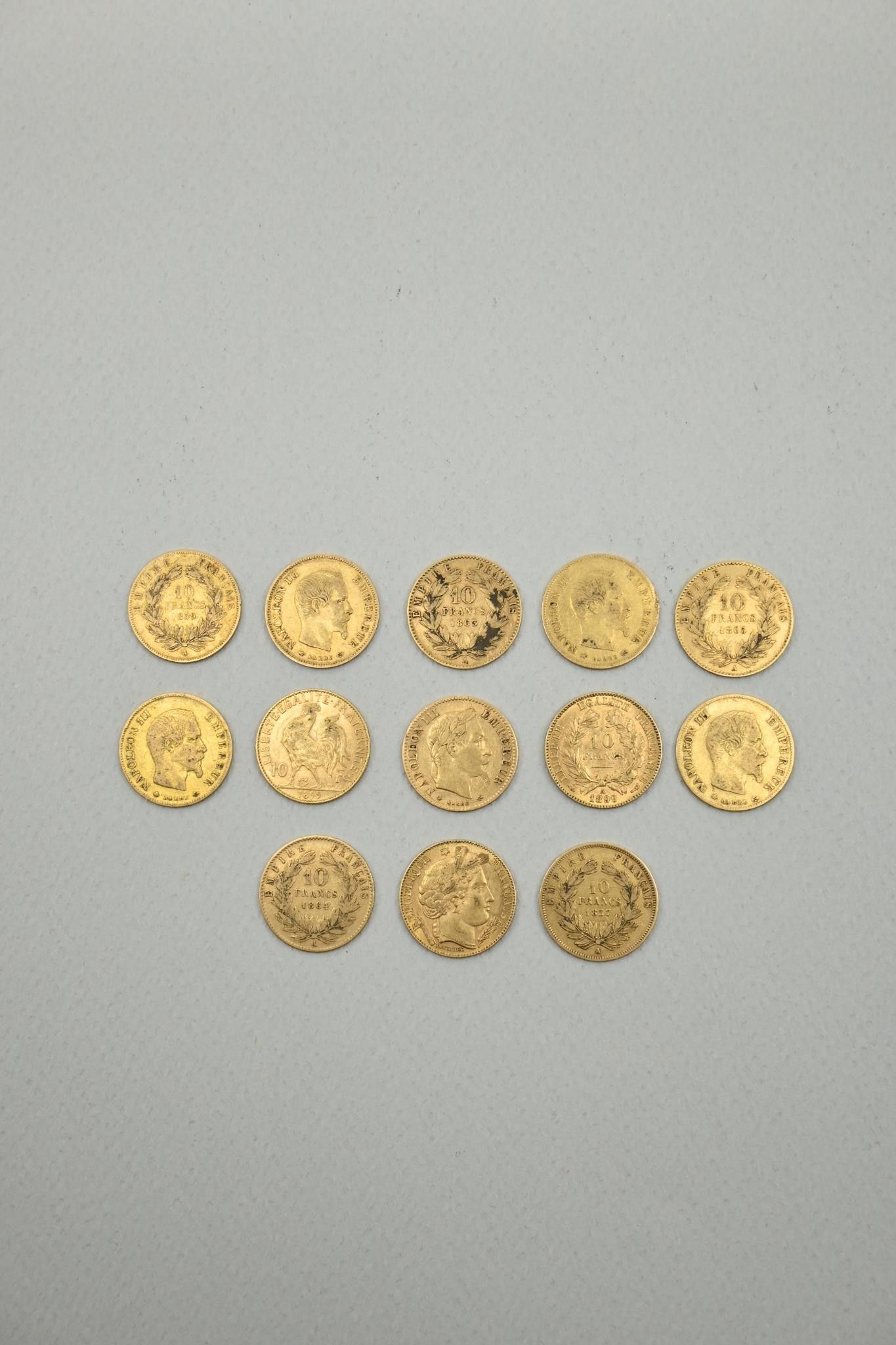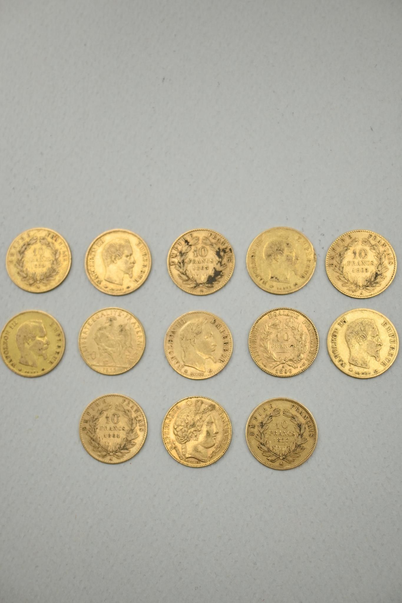 Thirteen 10 franc gold coins. Weight : 41,49 g