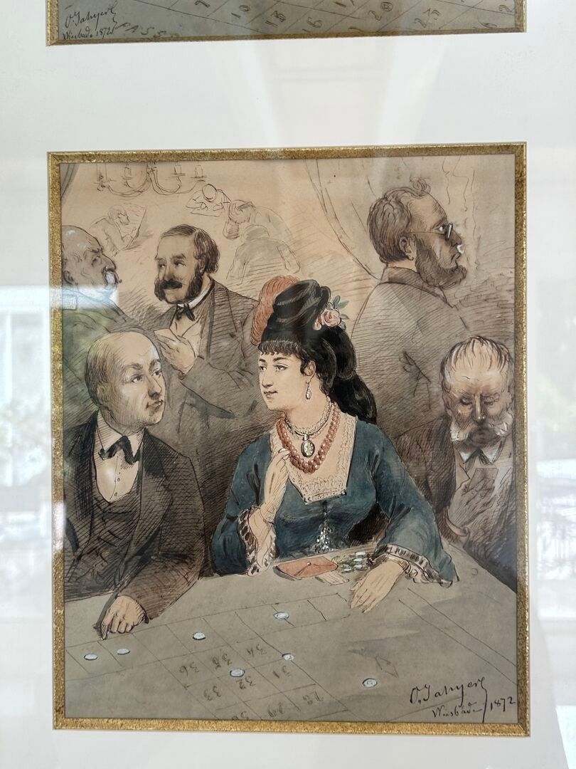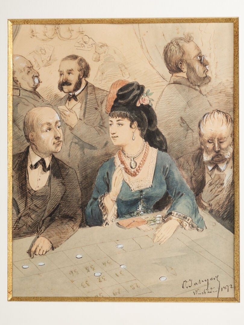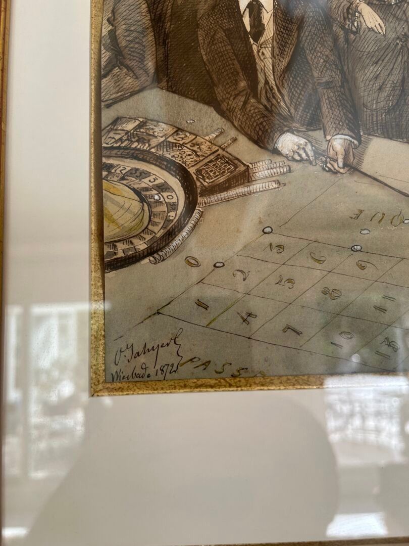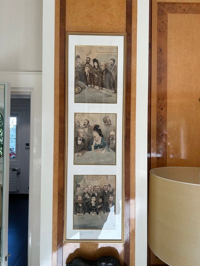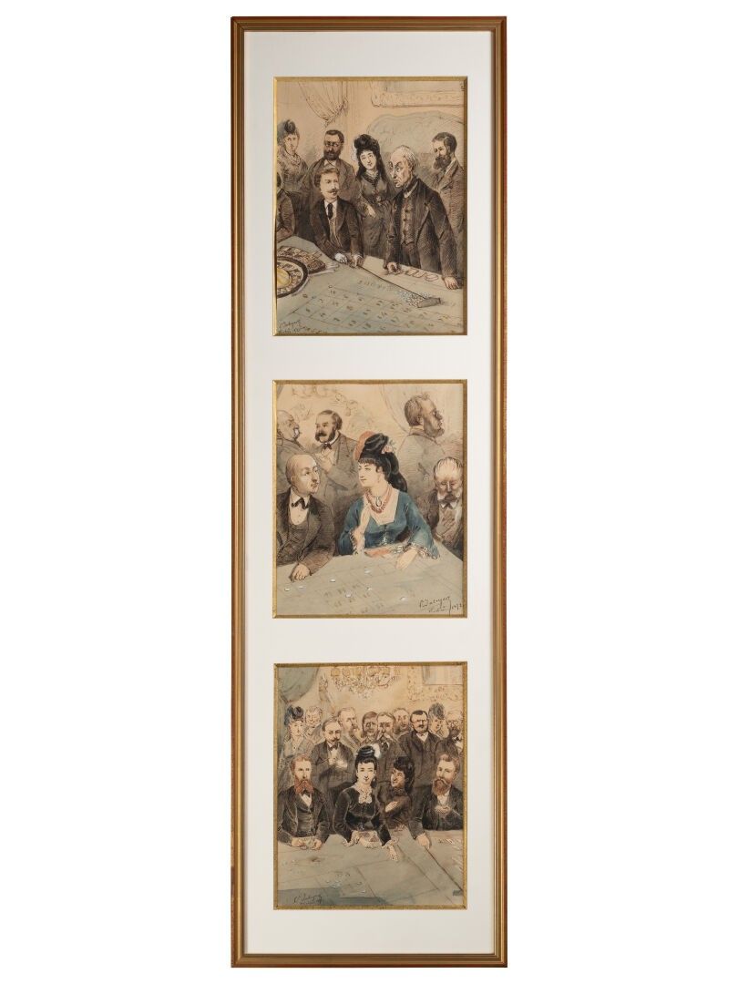 Octave Ed. JAHYER (1826-?). The roulette wheel Set of three inks and watercolours on paper in the same frame Signed and dated 1872 28 x 22 cm - 26.5 x 22 cm - 30.5 x 22 cm (view)