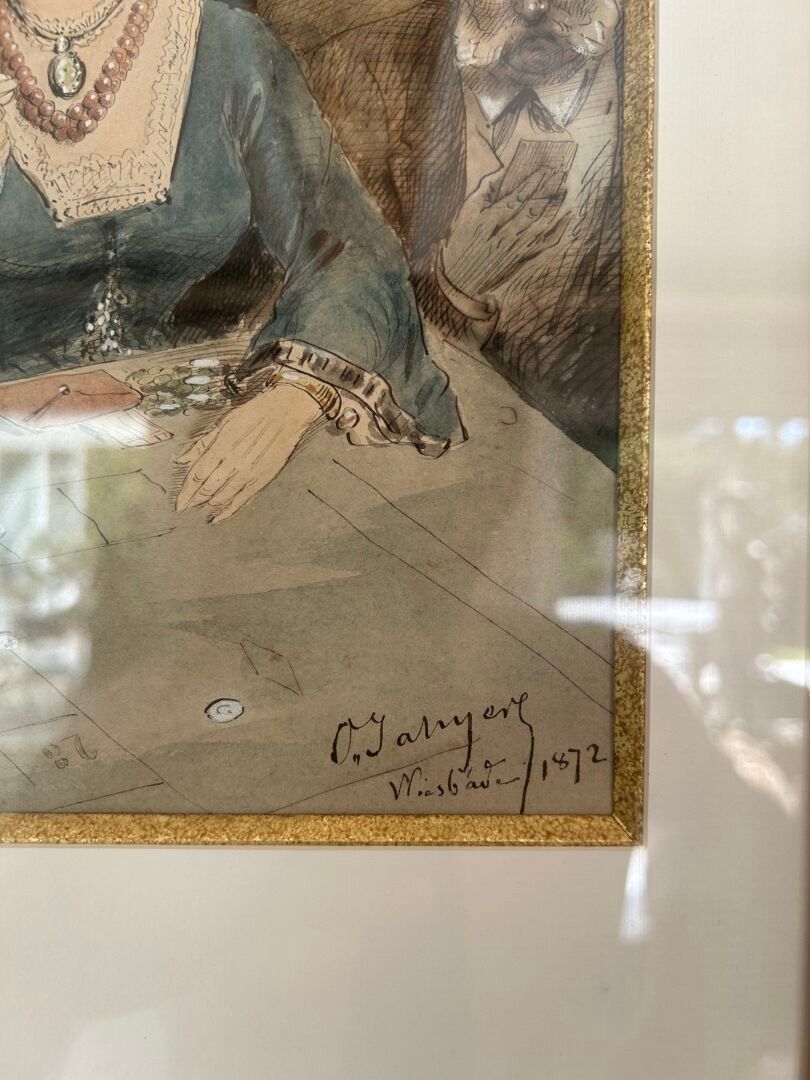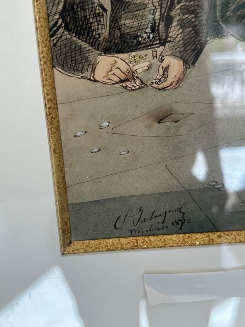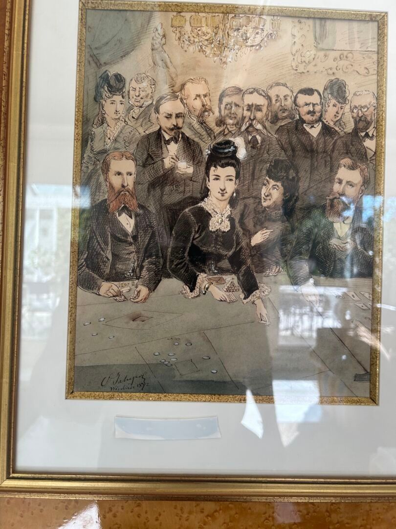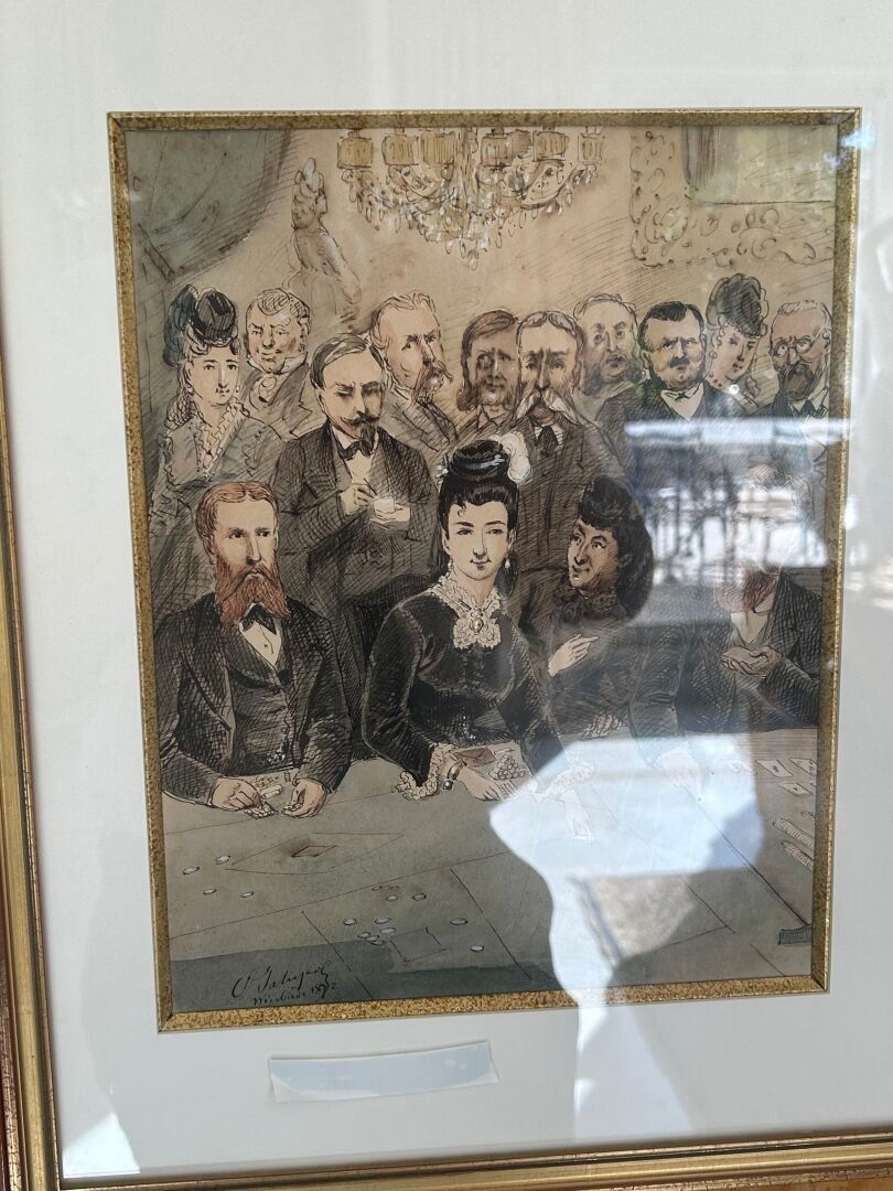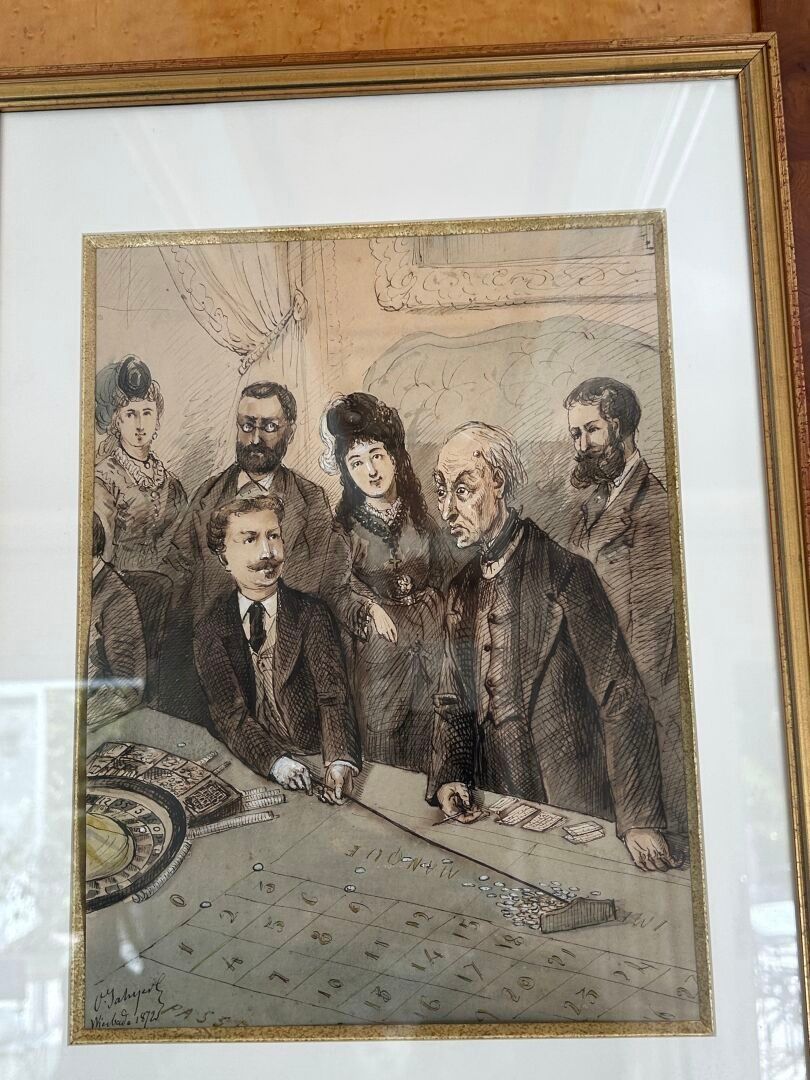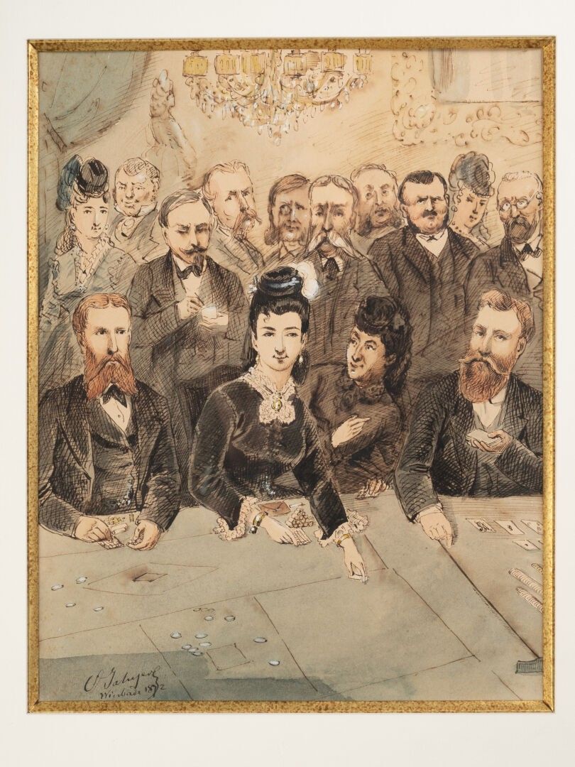 Octave Ed. JAHYER (1826-?). The roulette wheel Set of three inks and watercolours on paper in the same frame Signed and dated 1872 28 x 22 cm - 26.5 x 22 cm - 30.5 x 22 cm (view)