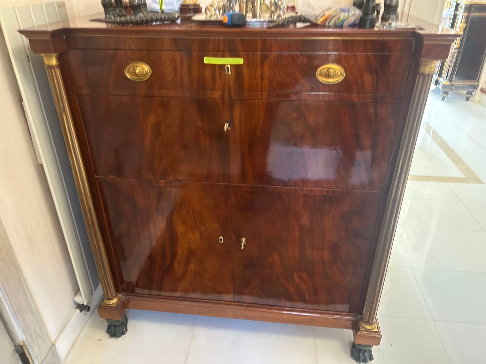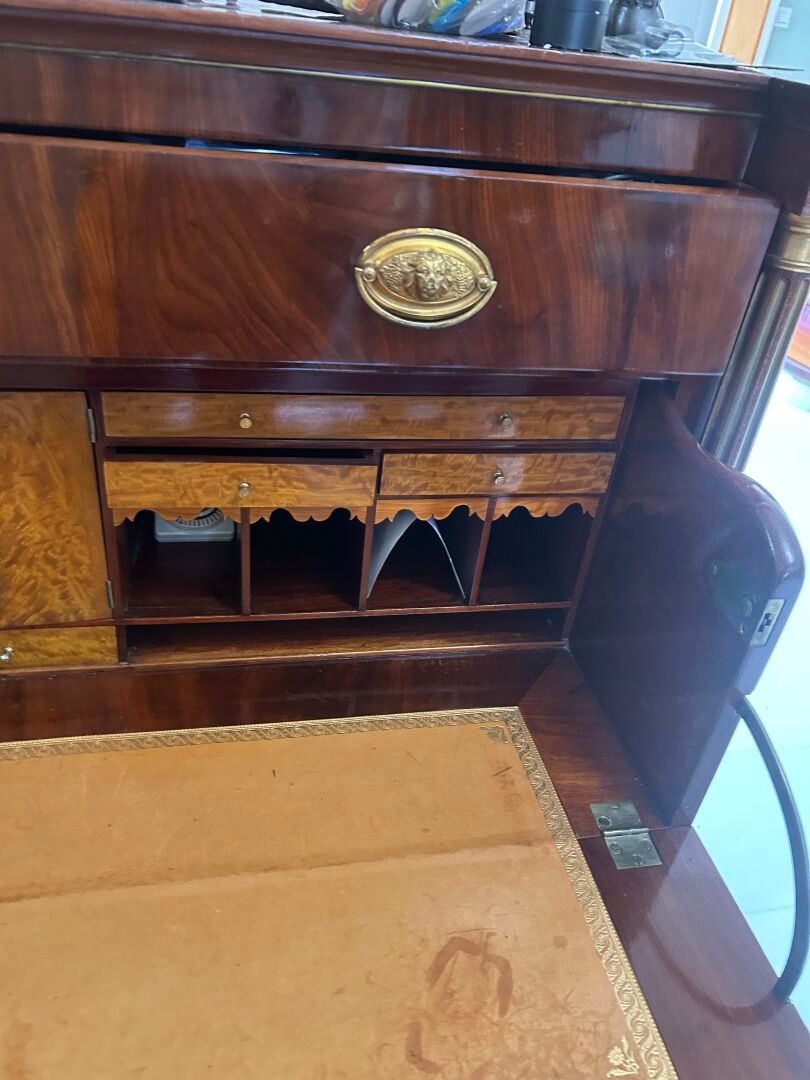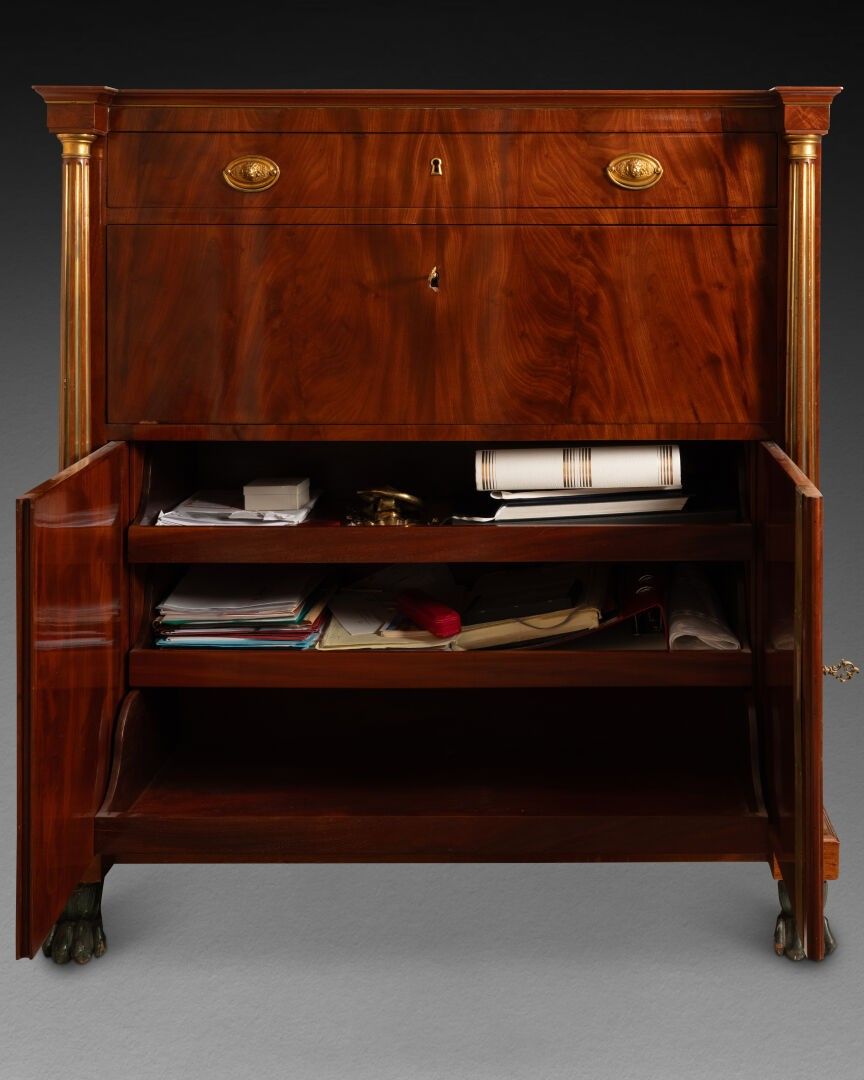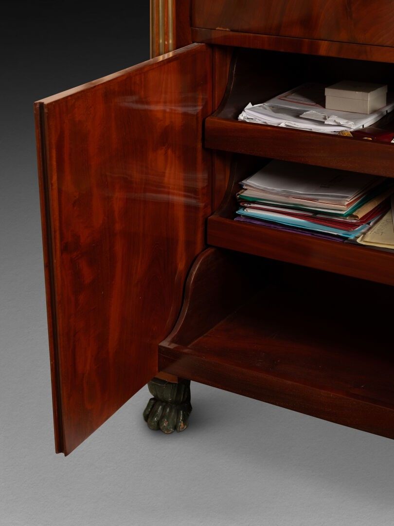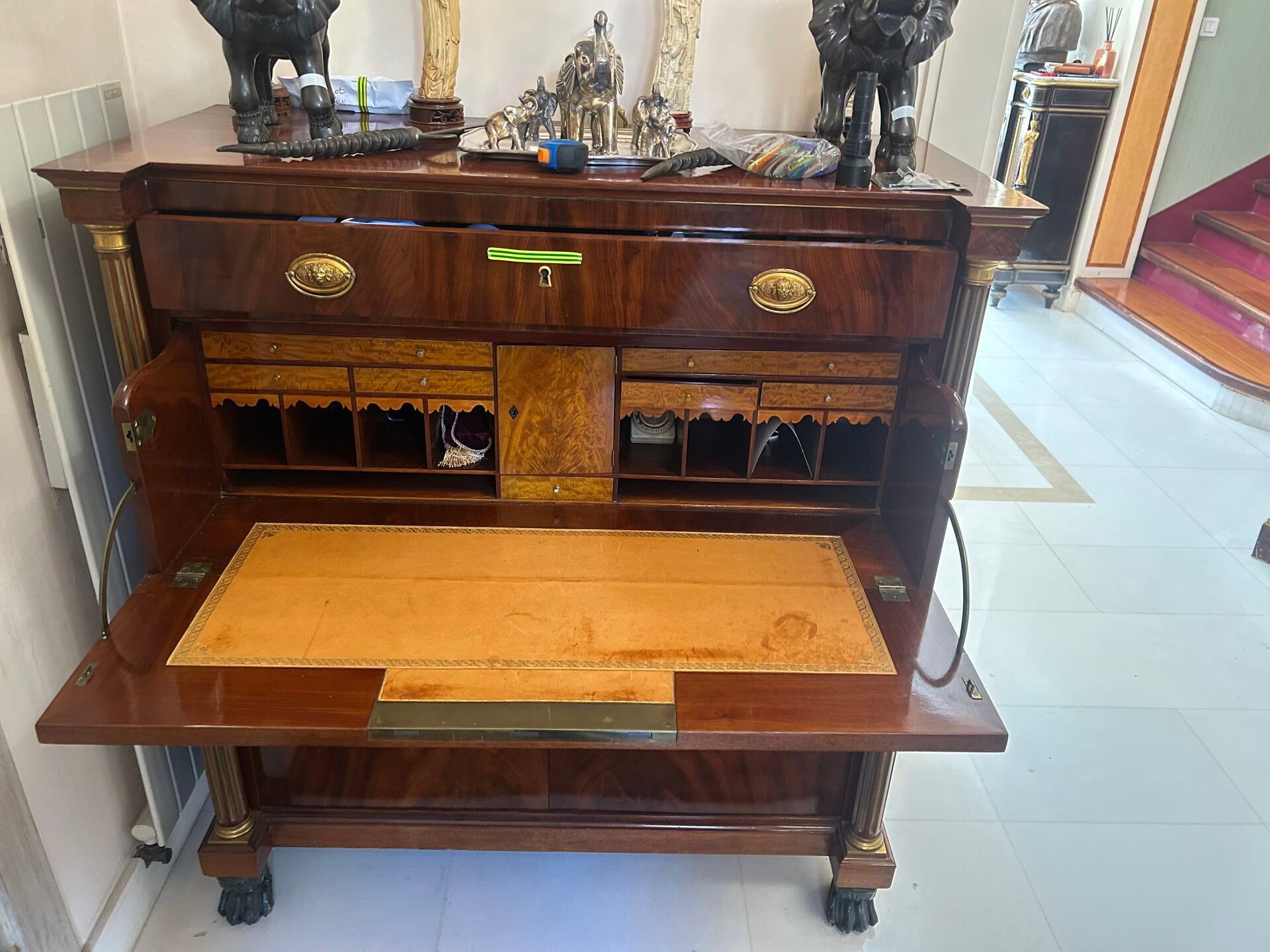 Large living room SECRETARY opening with a drawer in the waist, a flap drawer and two leaves. The fluted columns are tapered and terminate in claw feet. Chased gilt bronze ornamentation for the drawer handles.