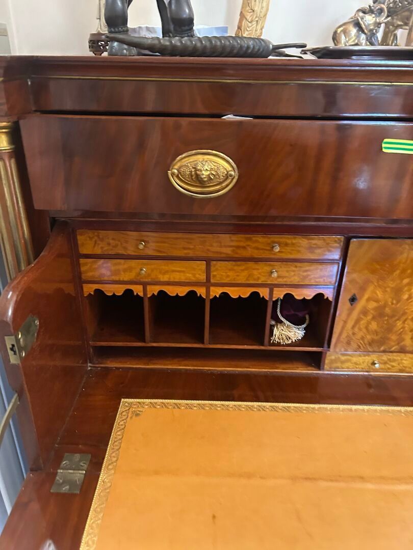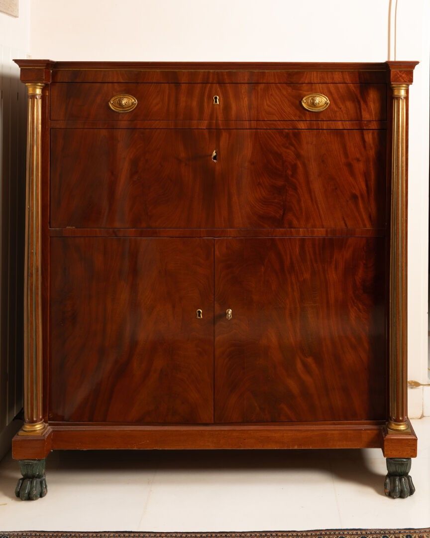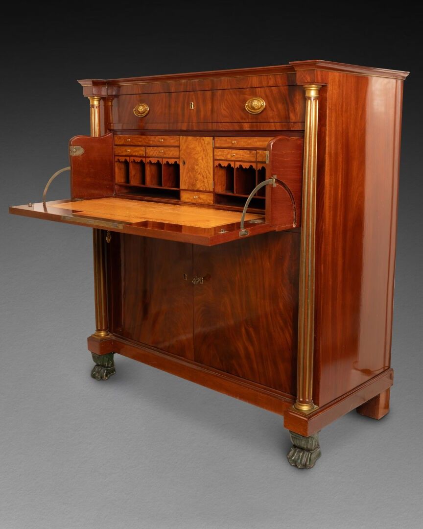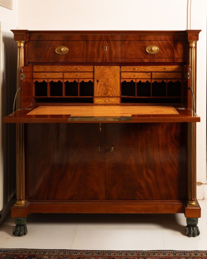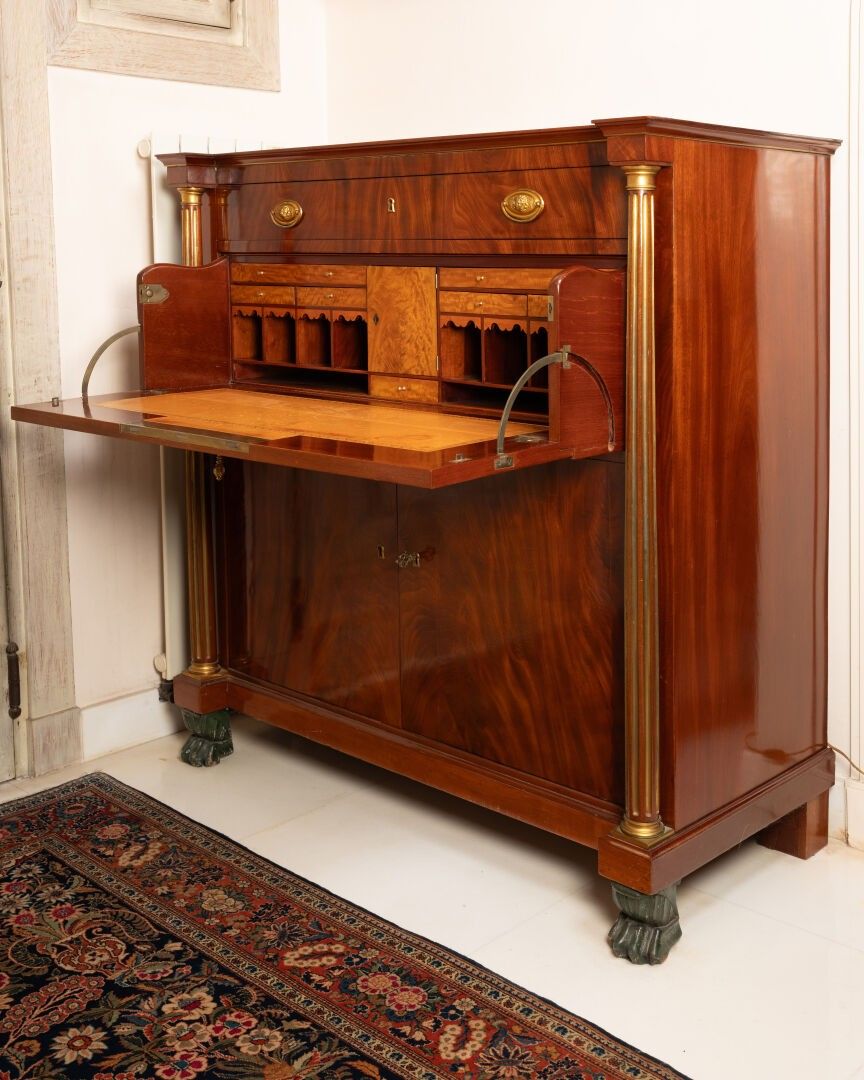 Large living room SECRETARY opening with a drawer in the waist, a flap drawer and two leaves. The fluted columns are tapered and terminate in claw feet. Chased gilt bronze ornamentation for the drawer handles.