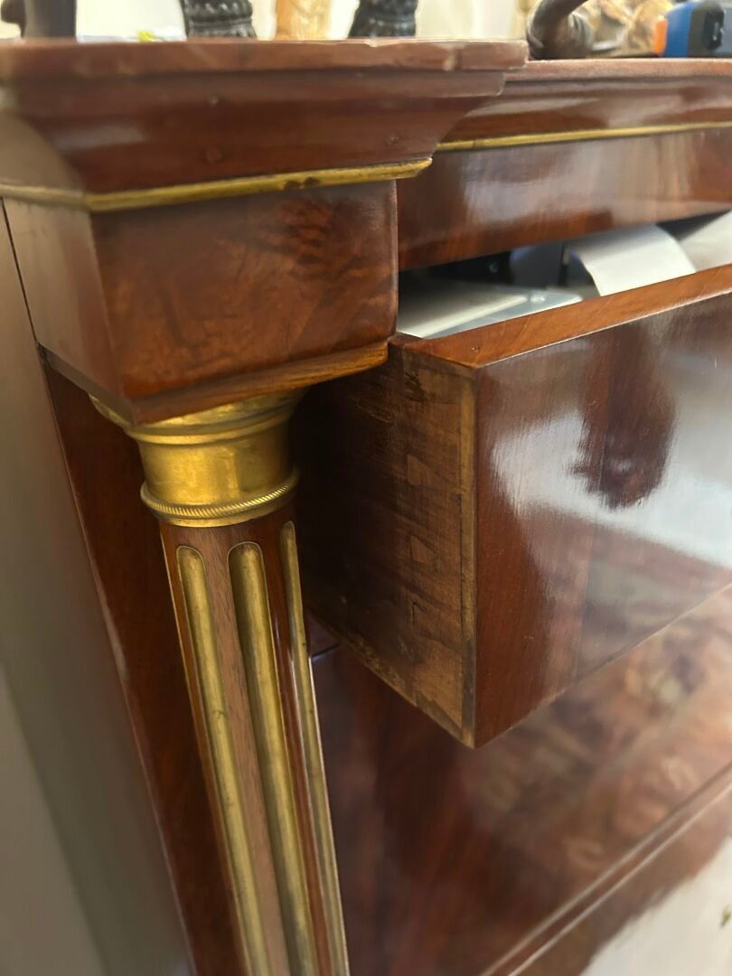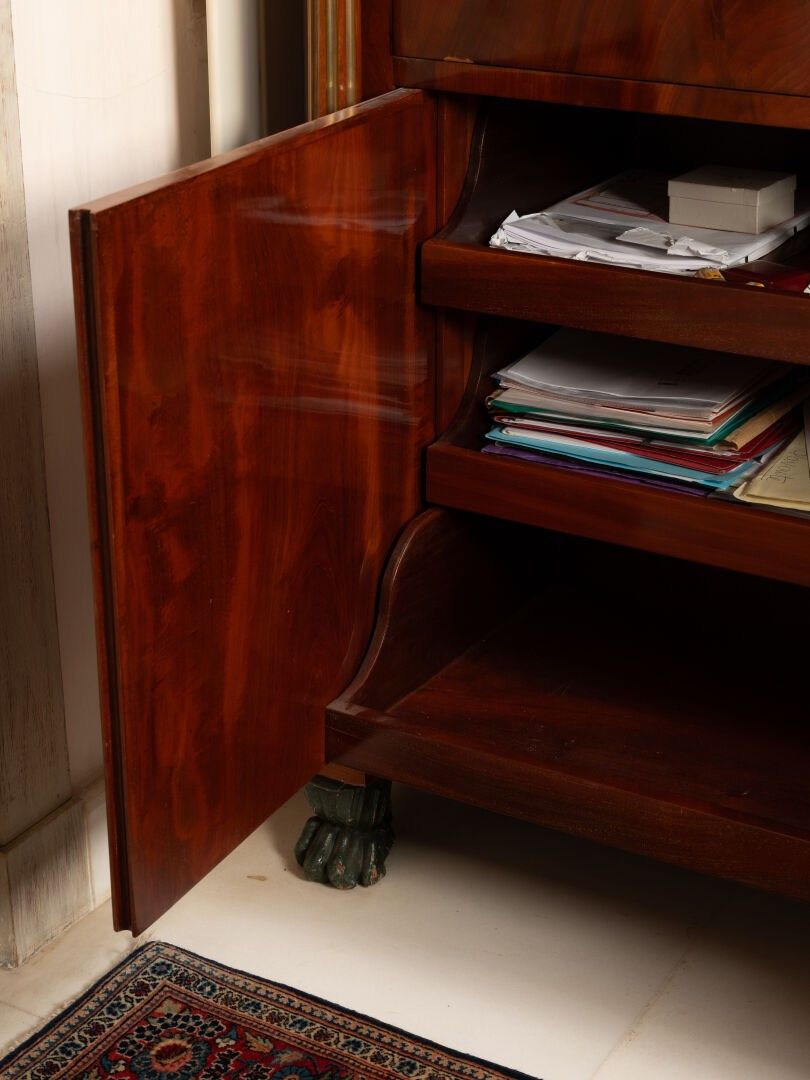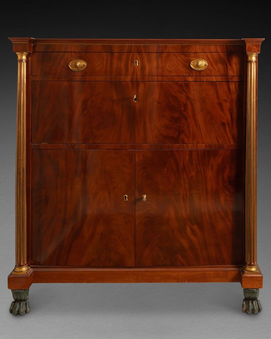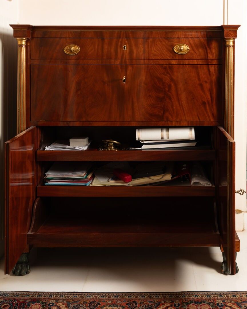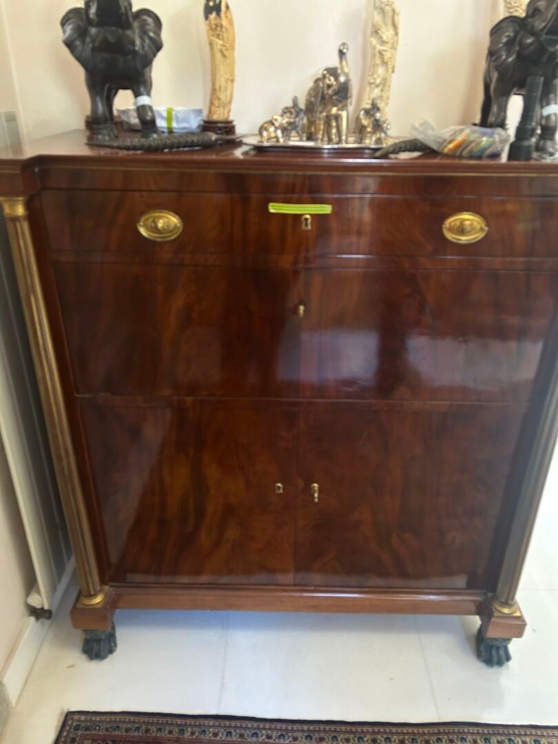 Large living room SECRETARY opening with a drawer in the waist, a flap drawer and two leaves. The fluted columns are tapered and terminate in claw feet. Chased gilt bronze ornamentation for the drawer handles.