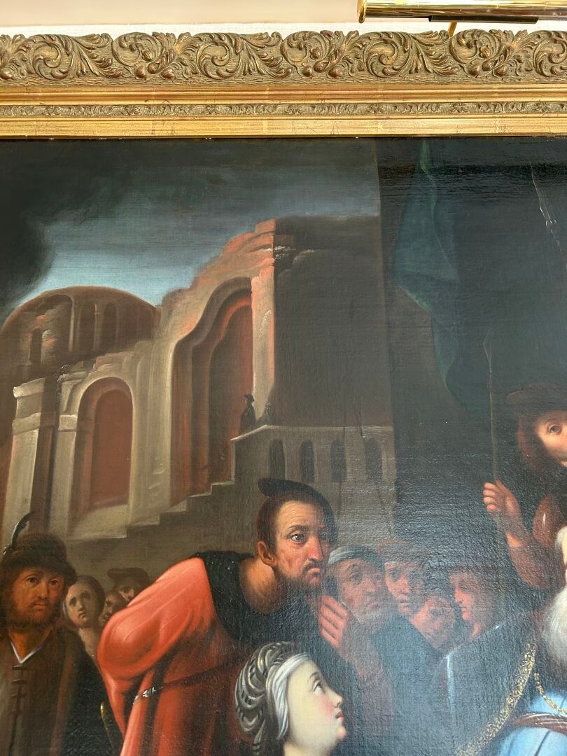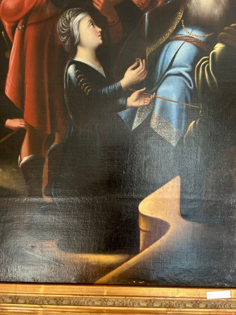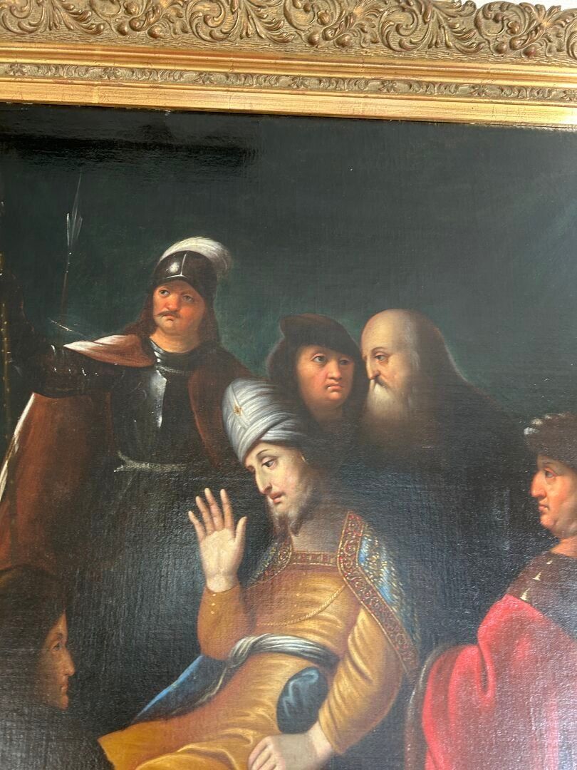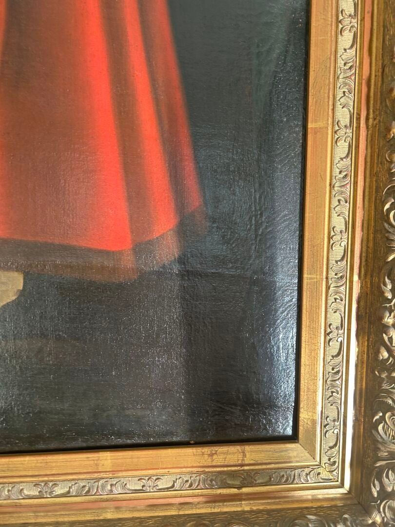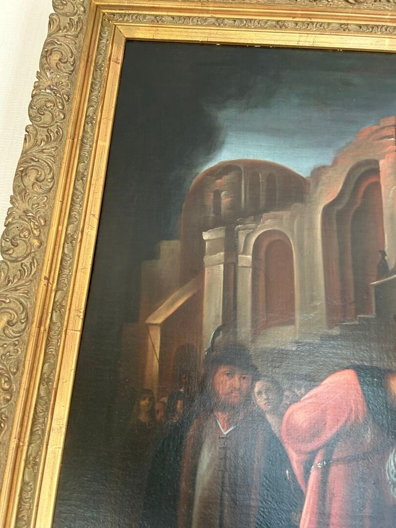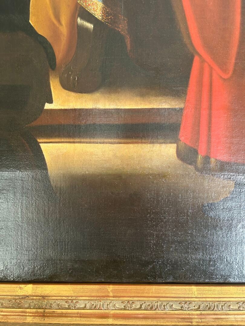 Oil on canvas, beautiful wood and gilded stucco frame with acanthus leaf scrolls