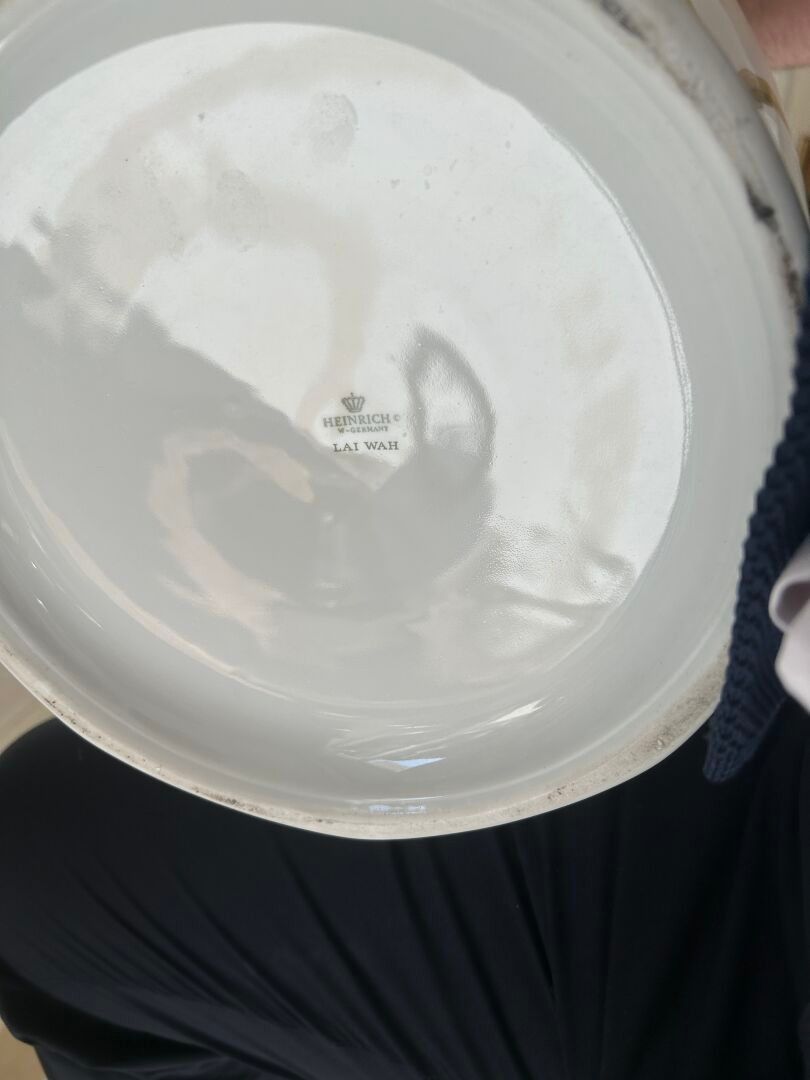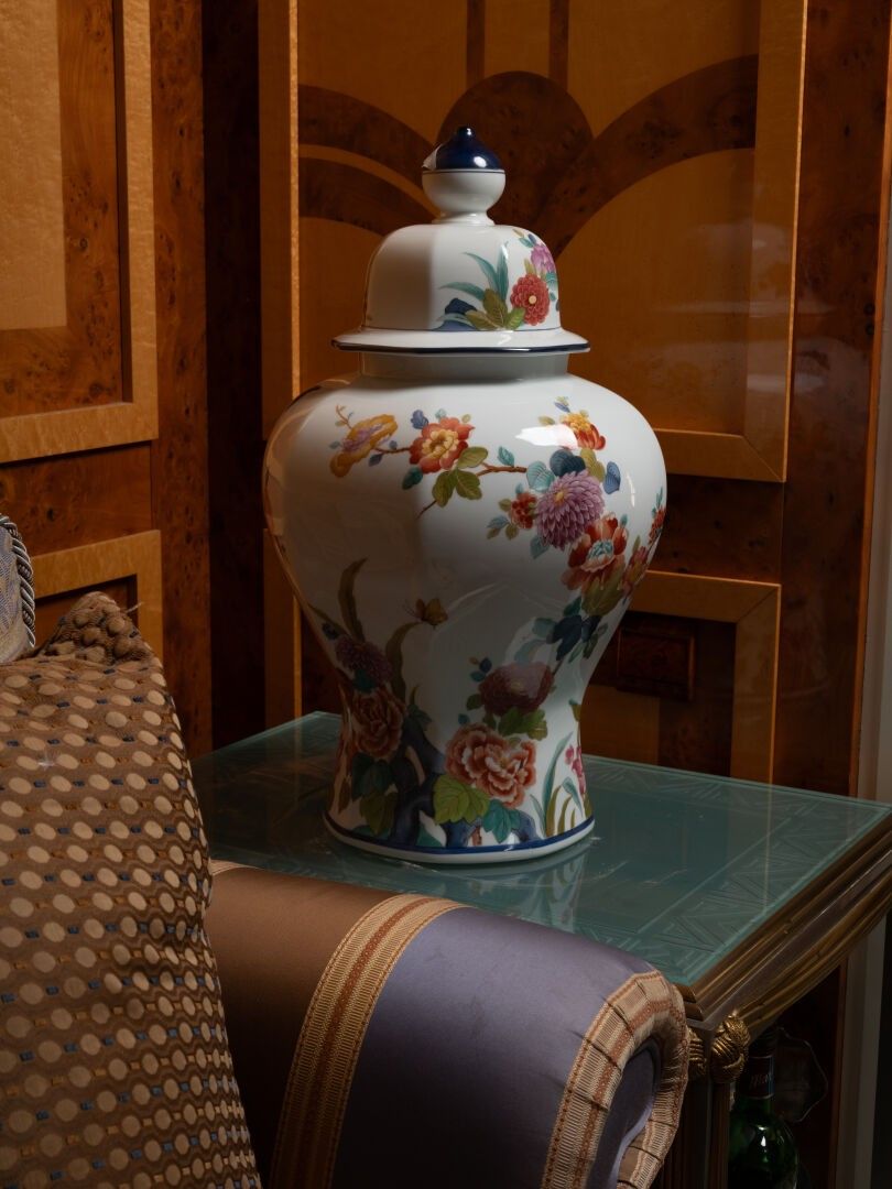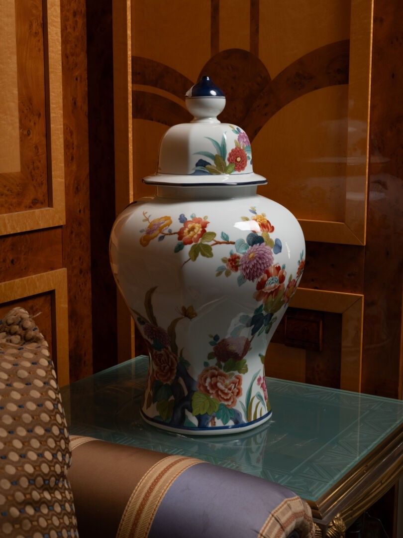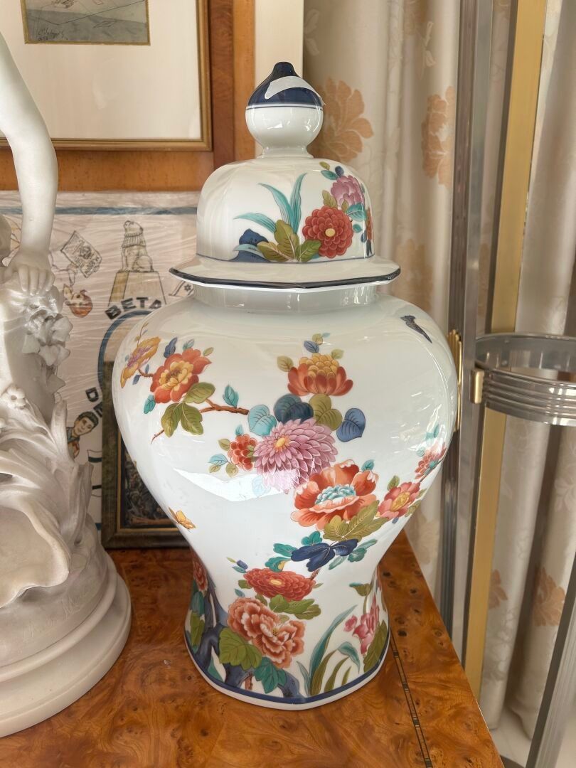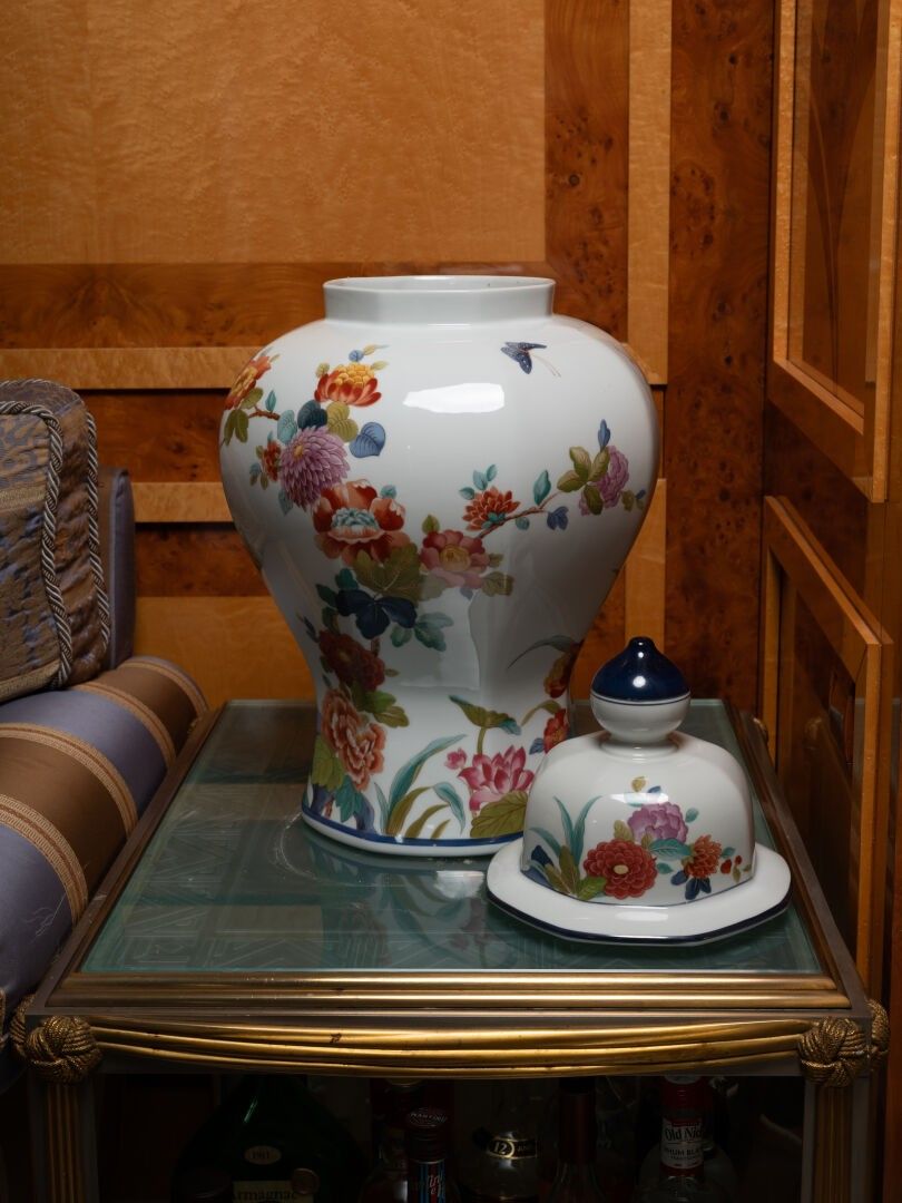 HEINRICH - Germany. Large covered POTICHE with canted sides decorated with flowers and butterflies, Lai Wah model