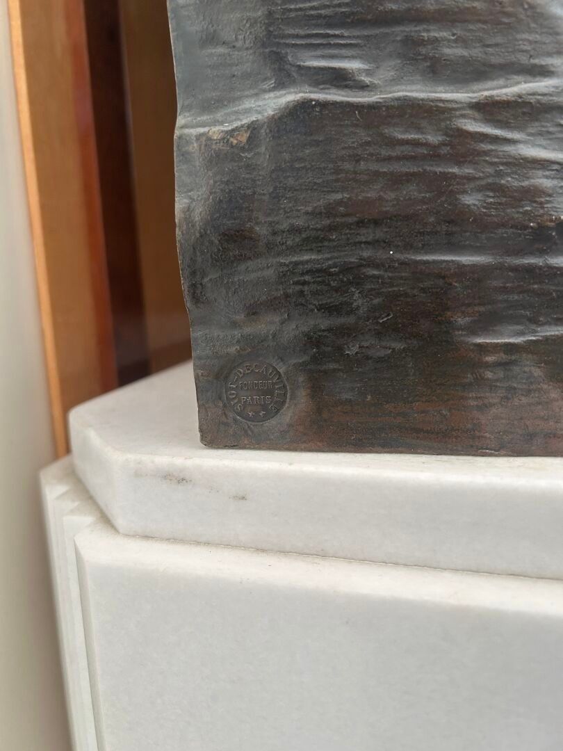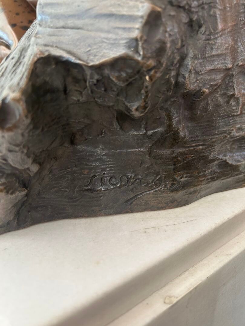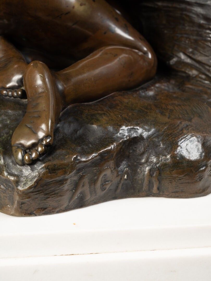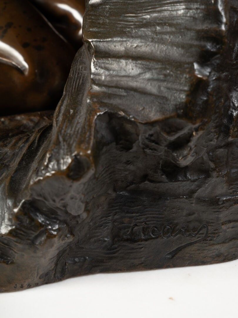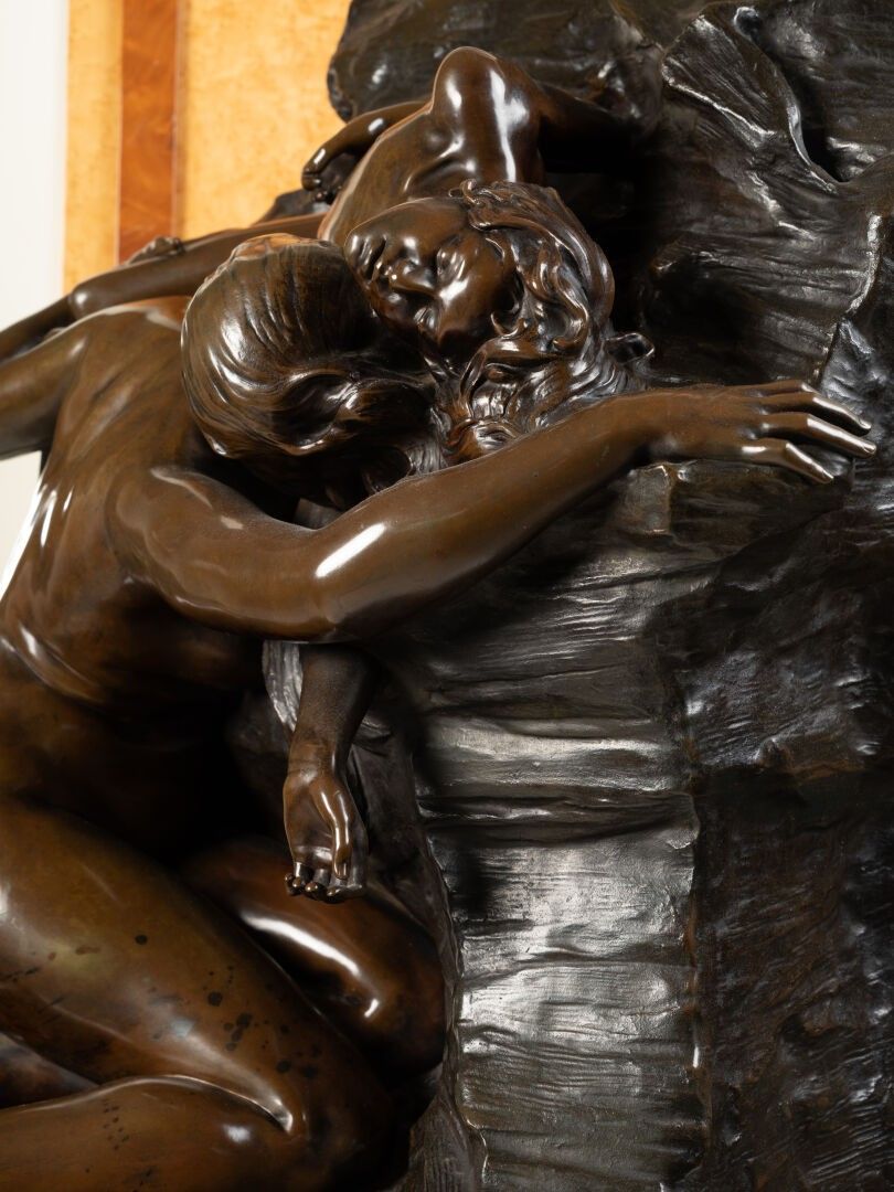 This bronze illustrates a biblical episode from Genesis: Hagar, Abraham's servant and the mother of Ishmael, driven into the desert with her son, implores heaven when the child is in agony, before God intervenes to save them. Produced in an academic style imbued with pathos and realism, the work highlights the expressiveness of the gestures and faces, conveying both the mother's pain and the child's fragility. This composition, which went through several versions (including a marble kept at the Musée des Beaux-Arts in Tours), testifies to Sicard's taste for subjects imbued with feeling and for a dramatic setting faithful to the canons of official sculpture at the end of the XIXᵉ century.
