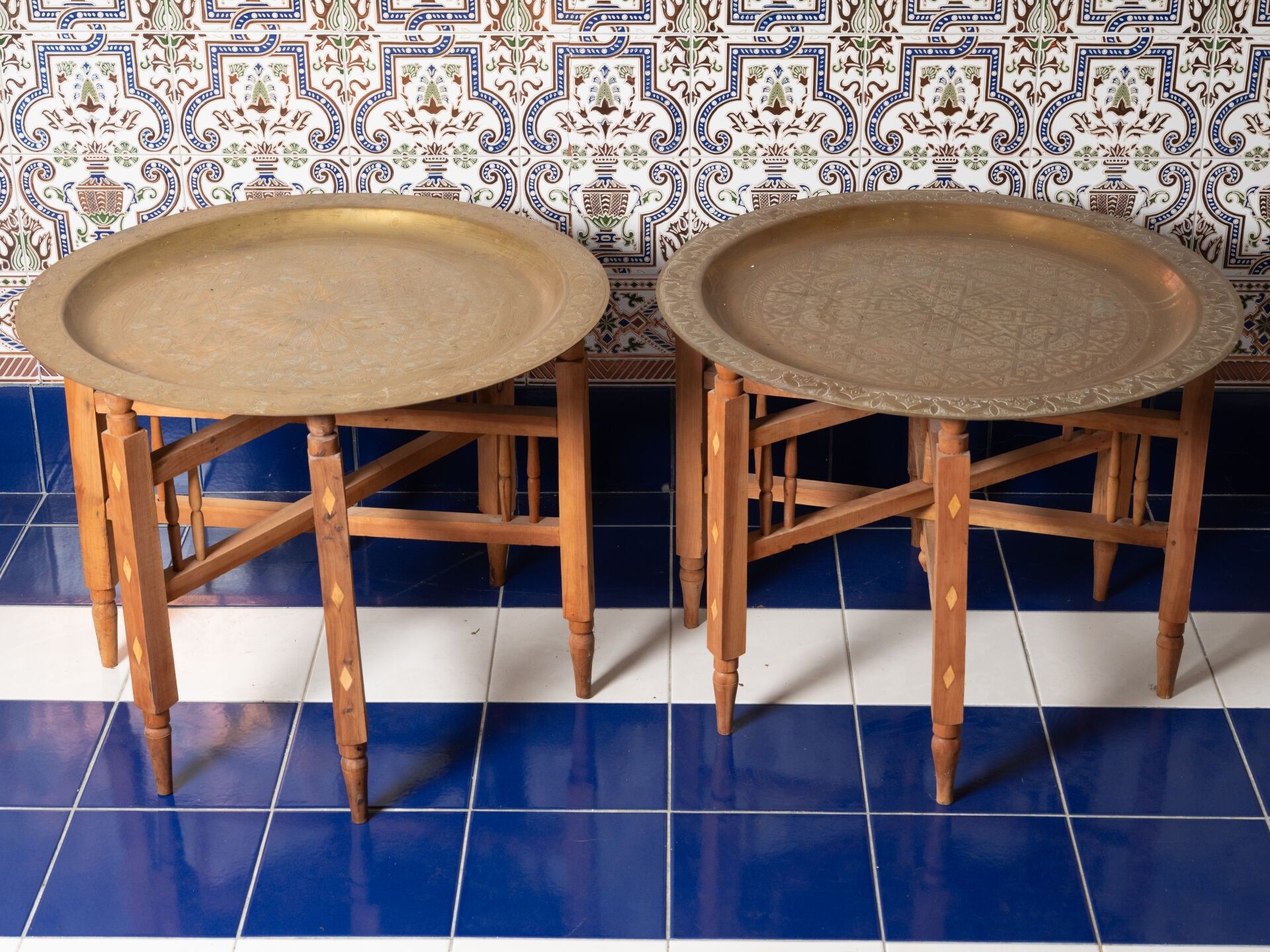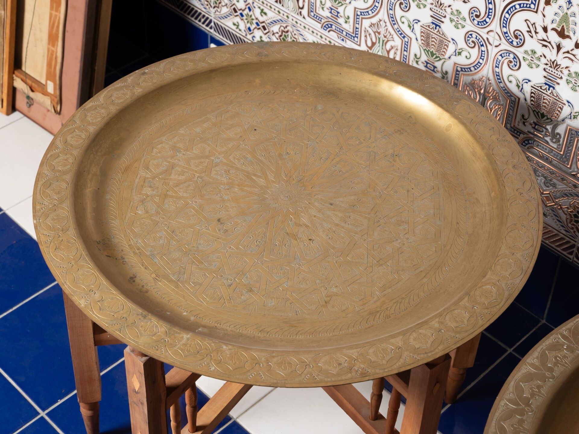 Two TEA TABLES Brass top with stylised geometric motifs, tur…