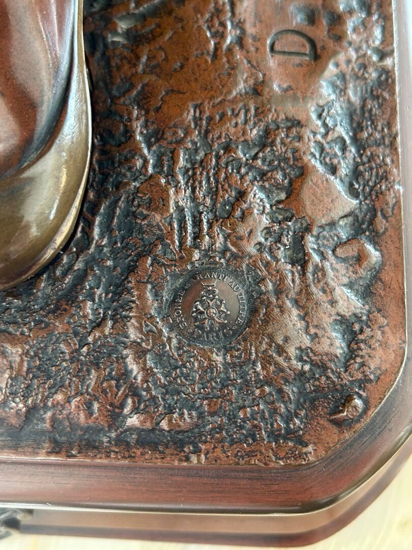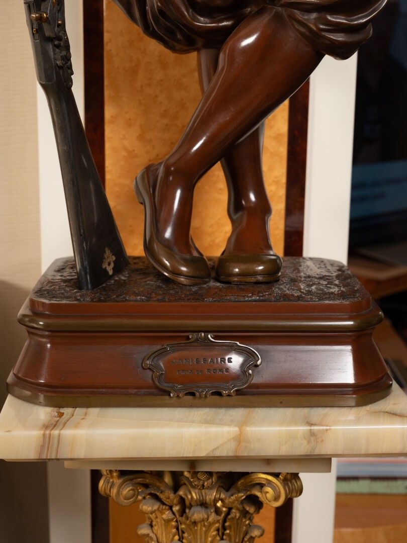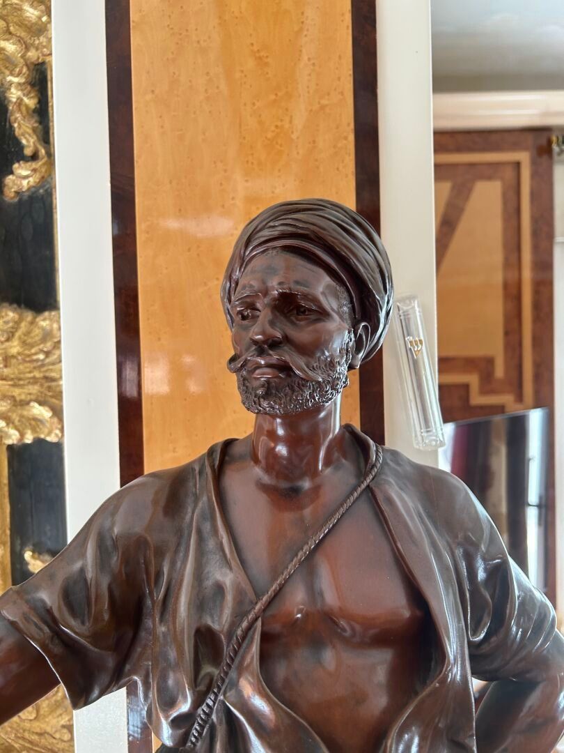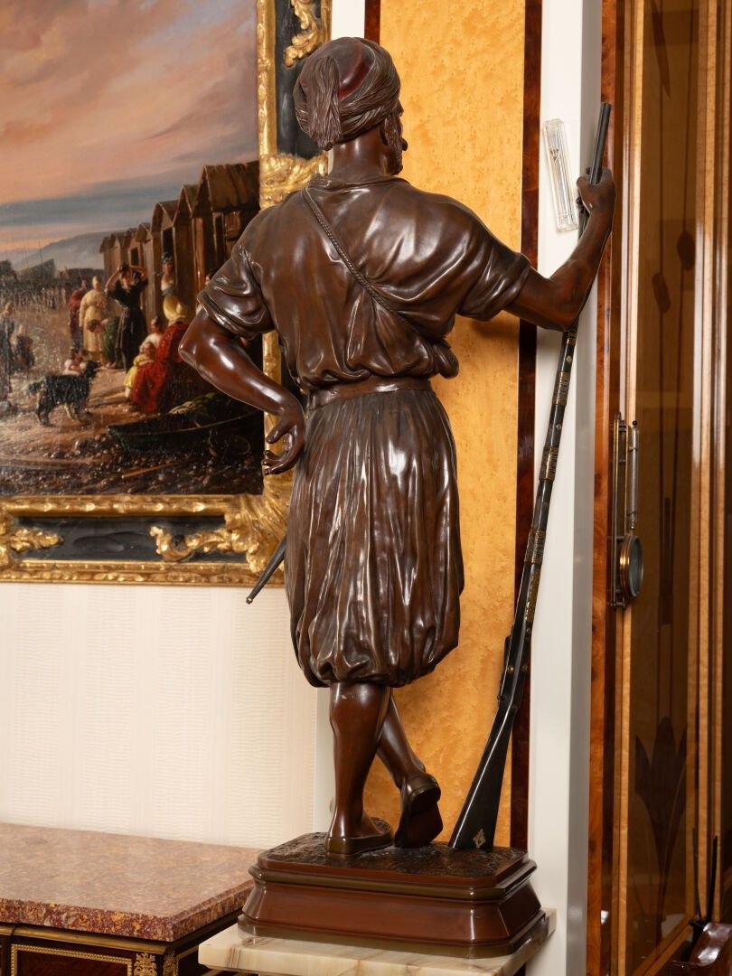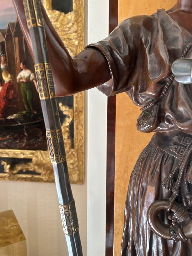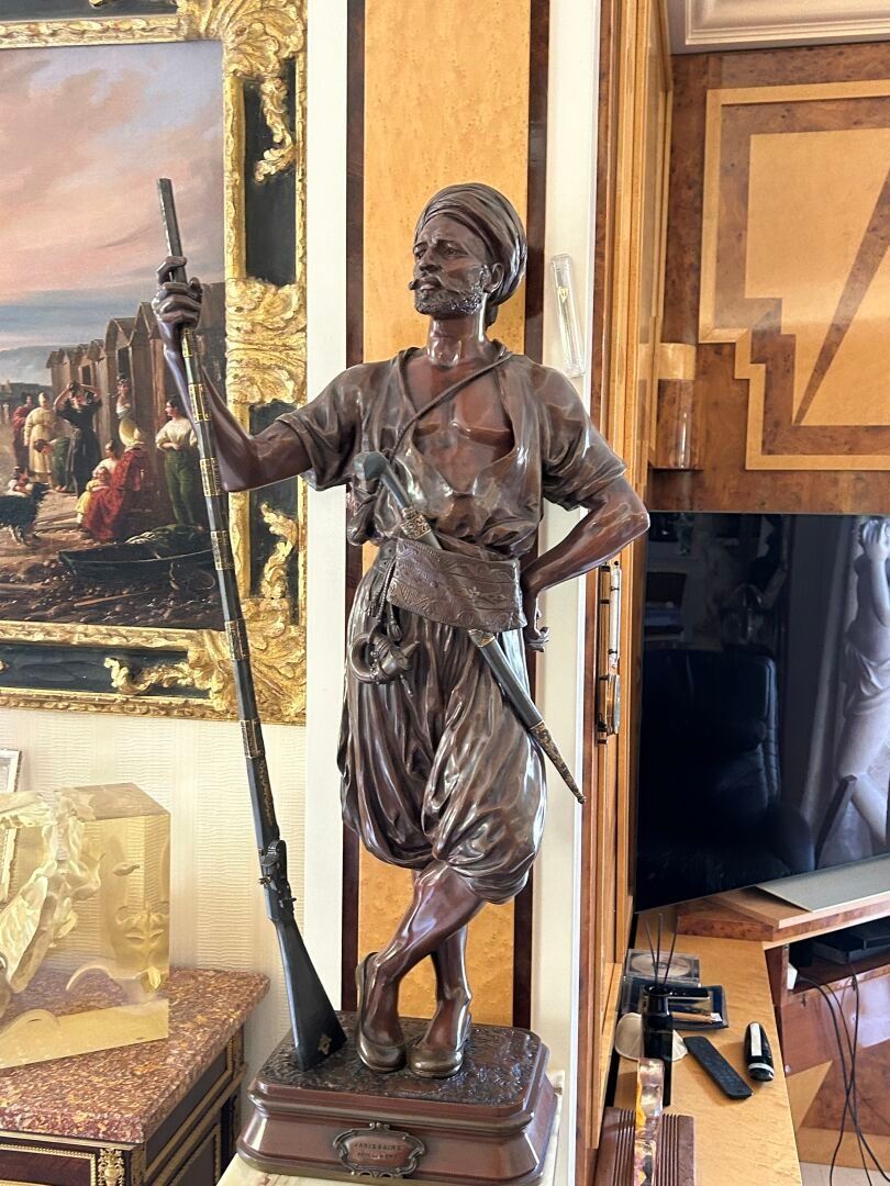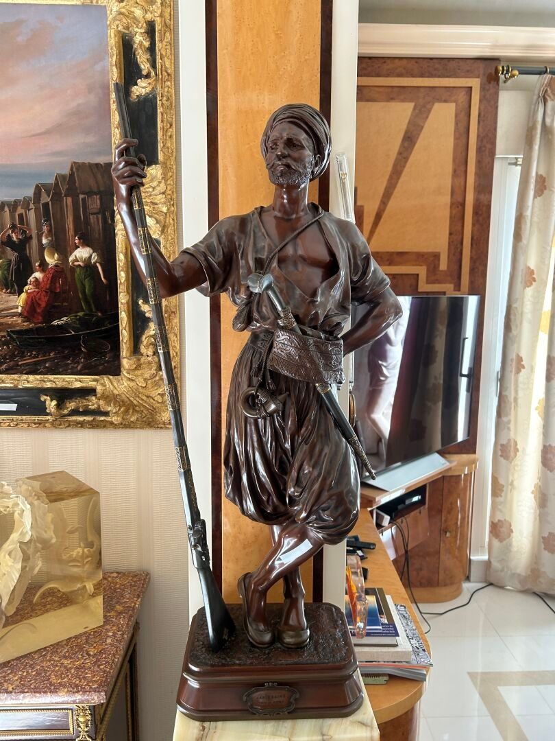 Jean Didier DEBUT (1824-1893). Janissary Bronze proof with triple patina, signed on the terrace Titled on a cartouche H. 91 cm - W. 29.5 cm - D. 21 cm Note: Jean-Didier Debut, born in Paris in 1824 and died in 1893, was a French sculptor belonging to the academic tradition of the XIXᵉ century. A pupil of David d'Angers, he trained at the École des Beaux-Arts in Paris, where he acquired a solid command of modelling and marble work. Winner of the Prix de Rome in 1851, he stayed at the Villa Medici in Rome, where he immersed himself in ancient art and the Italian Renaissance, influences that would have a lasting impact on his work. On his return to France, Debut took part in numerous official Salons, where he presented sculptures combining classical rigour and romantic sensibility. His repertoire included mythological, religious and allegorical subjects, as well as busts and public monuments, demonstrating great technical skill and measured elegance. His works, often imbued with grace and sobriety, reflect the balance sought between idealism and naturalism. Although less well known to the general public today, Jean-Didier Debut remains representative of the academic sculpture of the Second Empire, marked by formal perfection and a taste for the beautiful ideal.
