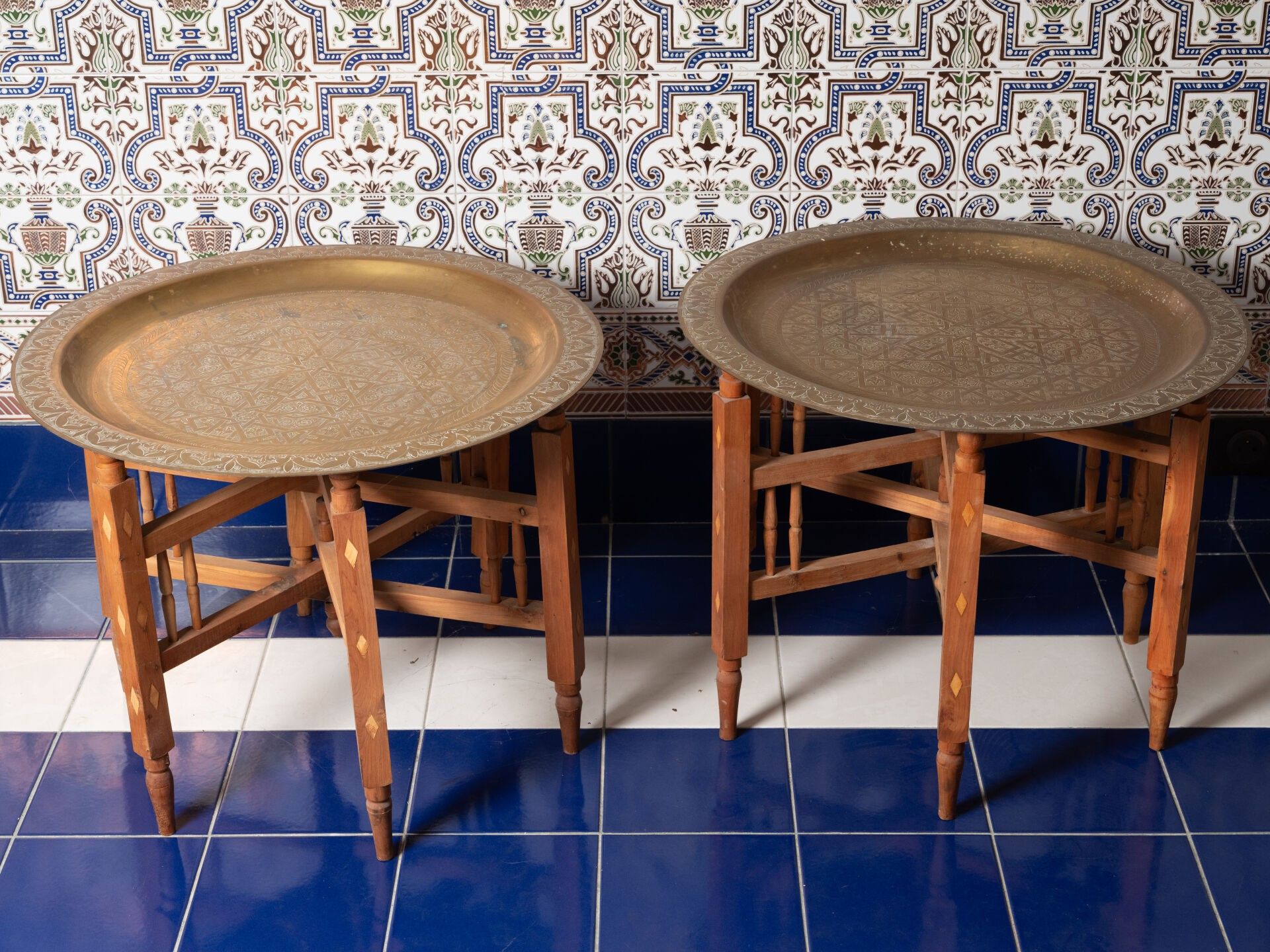 Two TEA TABLES Brass top with stylised geometric motifs, tur…
