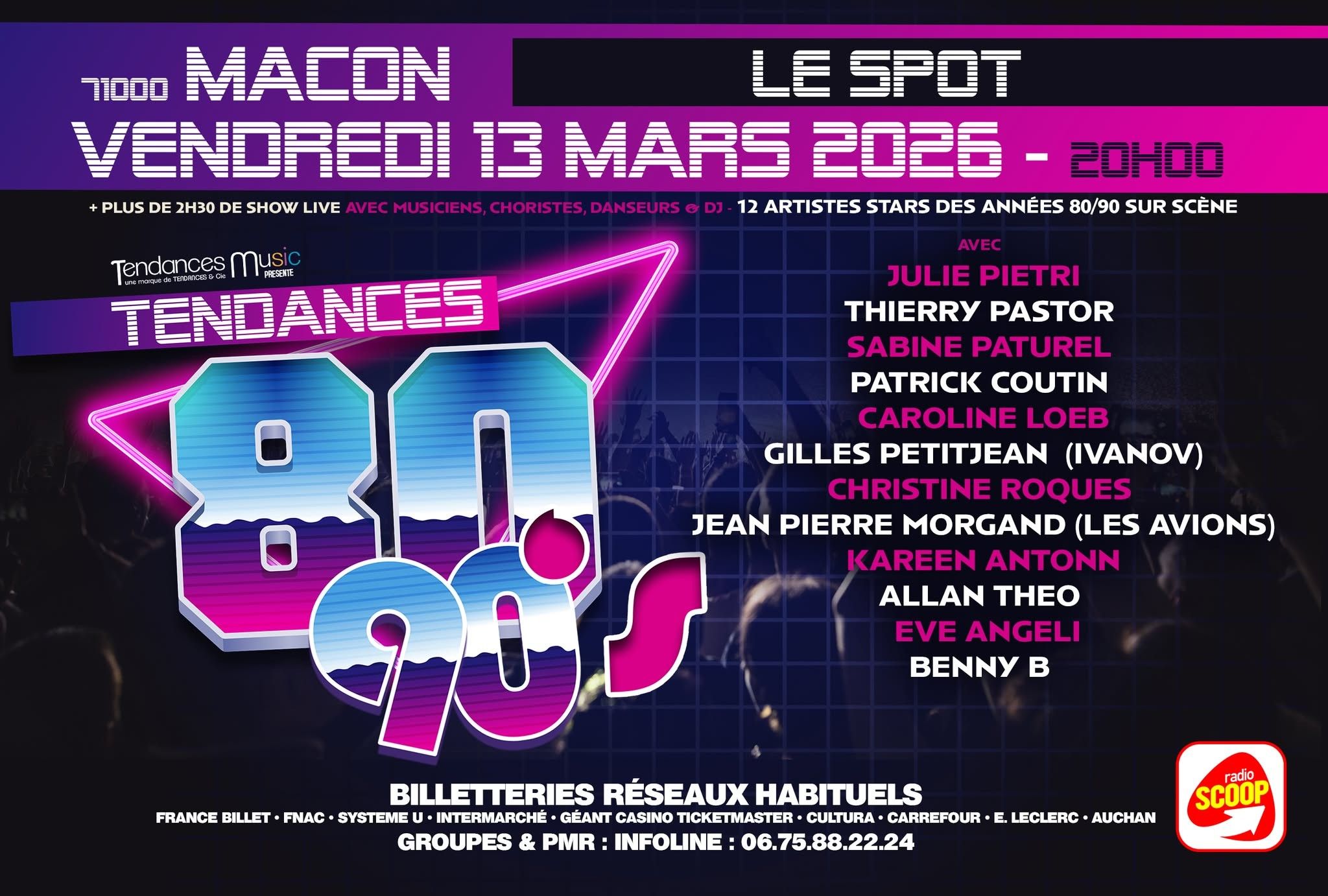 A Meet & Greet INVITATION to the TENDANCES 80'90 concert at the SPOT, Mâcon, on Friday 13 March 2026, with VIP backstage access to meet the after-show artists: Julie PIETRI, Thierry PASTOR, Sabine PATUREL, Patrick COUTIN, Caroline LOEB, Gilles PETITJEAN (IVANOV), Christine ROQUES, Jean Pierre MORGAND (Les Avions), Kareen ANTONN, Allan THEO, Eve ANGELI, Benny B....