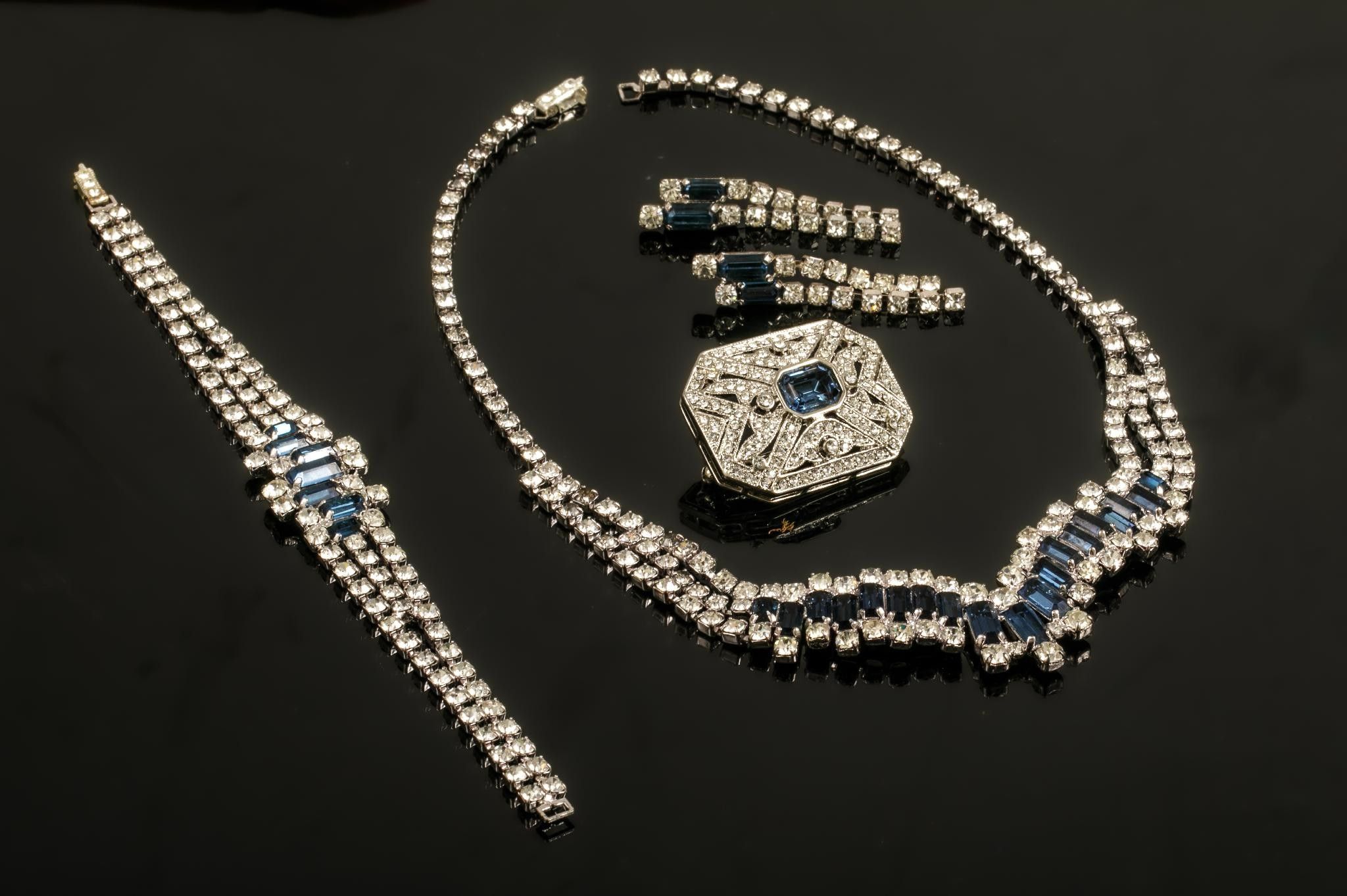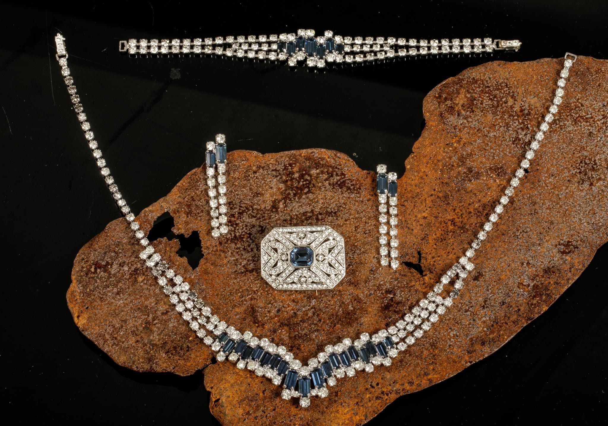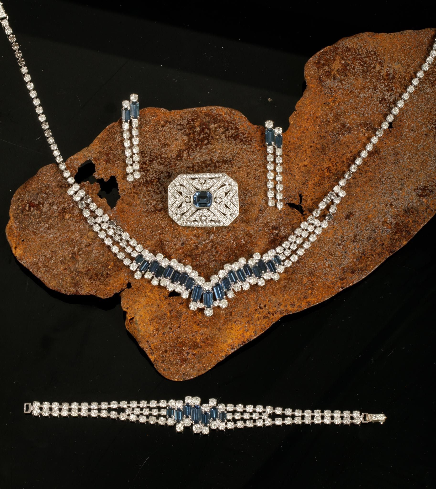 Set consisting of a pair of earrings, a bracelet, a necklace and a brooch in silvered metal with white and blue coloured stones